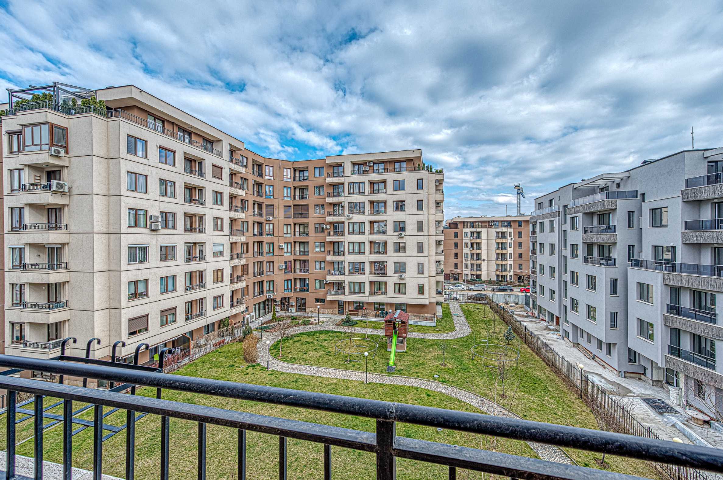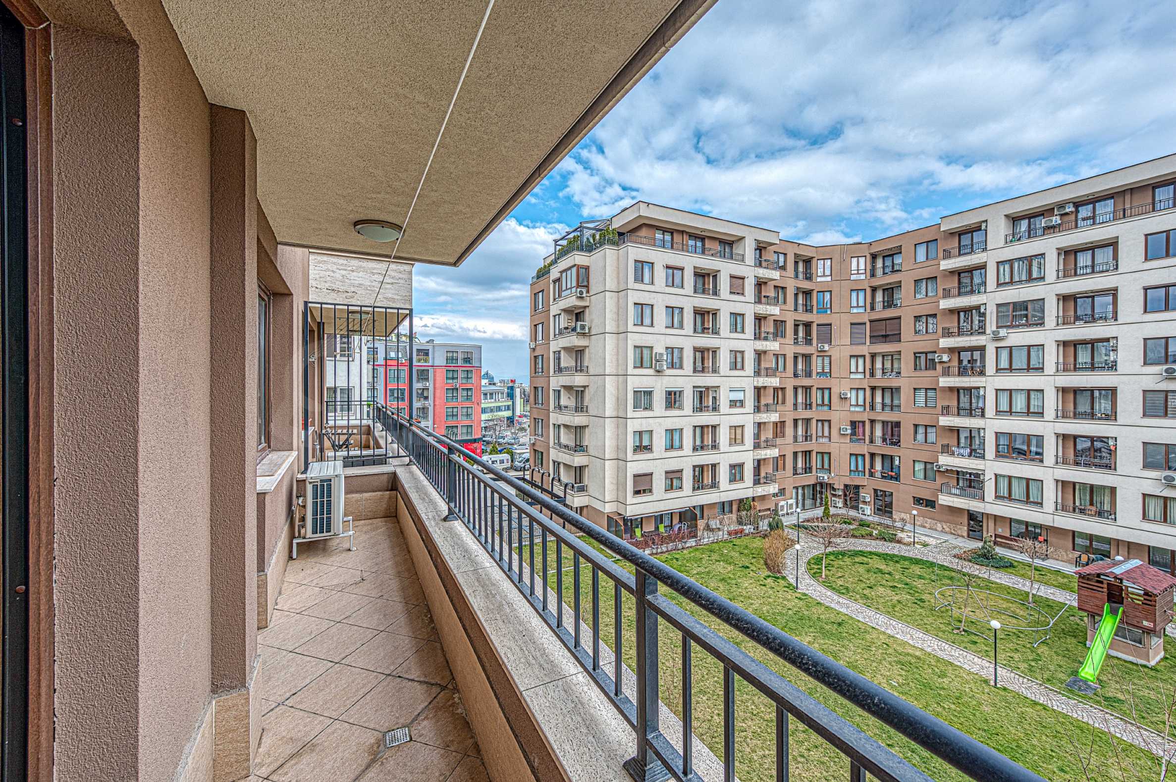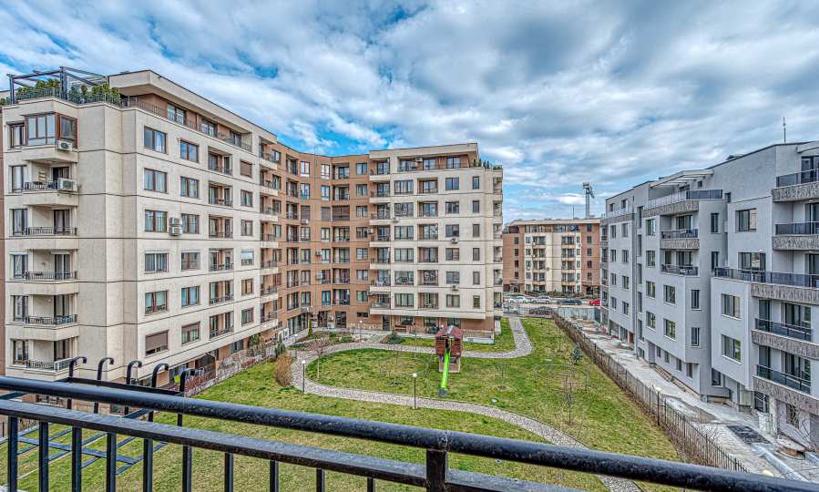 Жилището е разположено на среден етаж, с източно изложение, което гарантира естествена светлина през целия ден. От балкона се разкрива гледка към красиво оформения вътрешен двор на комплекса – просторна, зелена и добре поддържана зона, идеална за почивка и разходки.