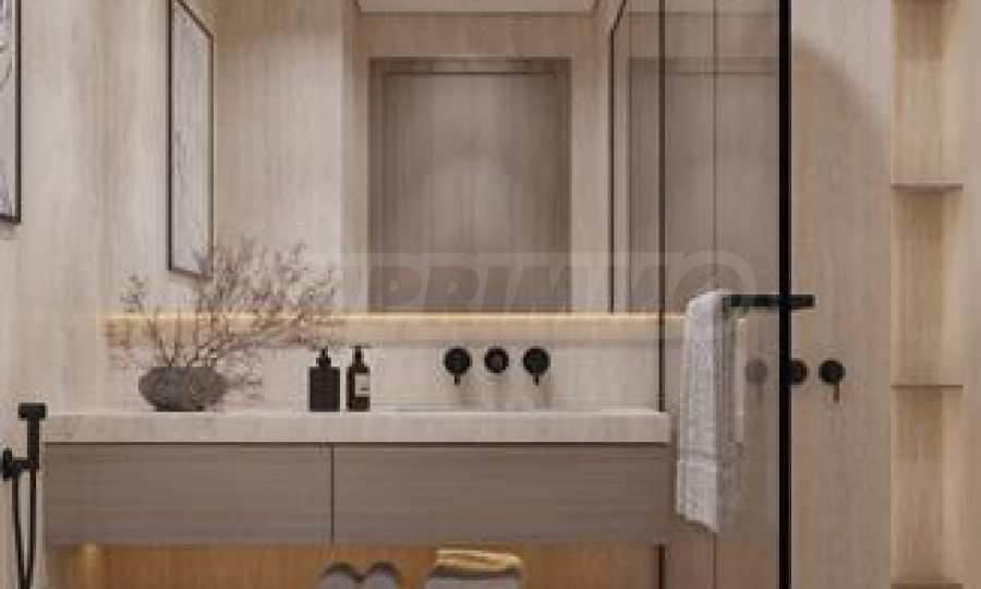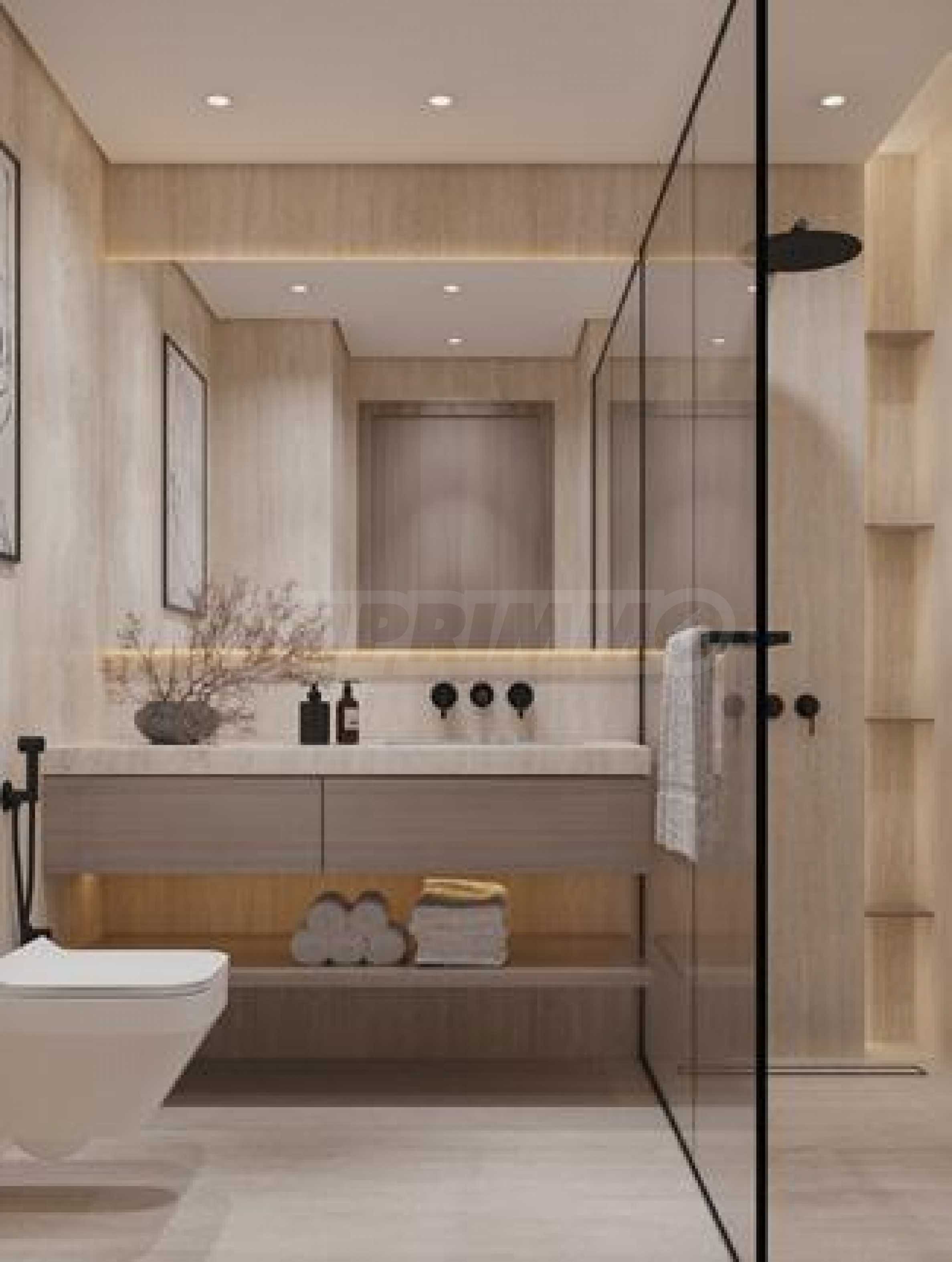 Баните са планирани с внимание към детайла – стените и подът са облицовани с керамични плочки в травертинова текстура, а плотовете на мивките са от порцеланови плочи с мраморен ефект. Шкафовете са с ламинирано покритие в топъл дървесен нюанс, съчетаващ се хармонично с цялостната естетика.