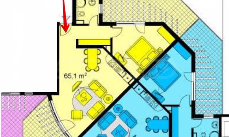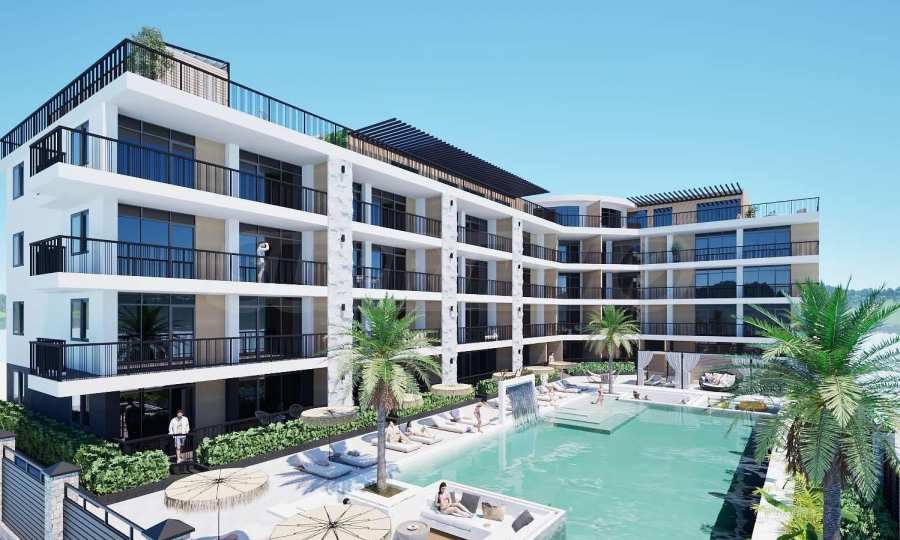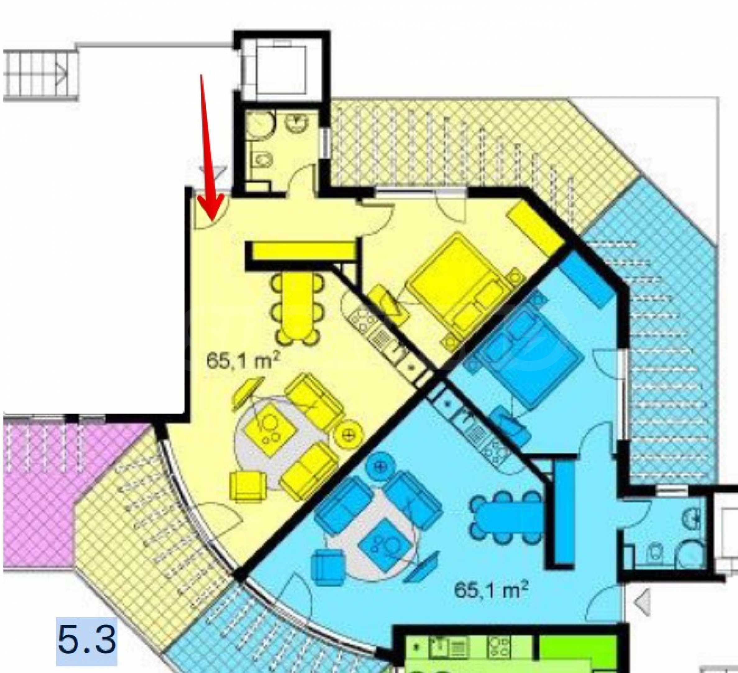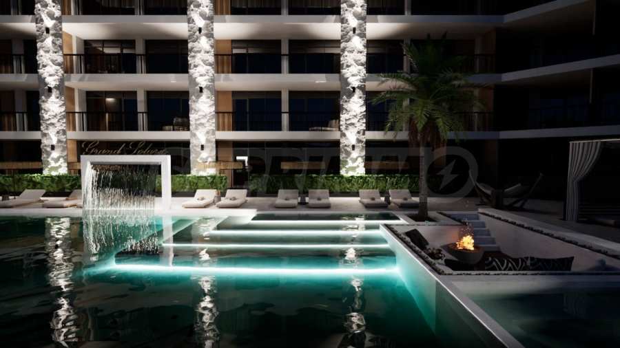 Имотът е с обща площ от 76,68 кв.м, ситуиран на 5-и етаж с панорамни тераси и гледка към басейна.
