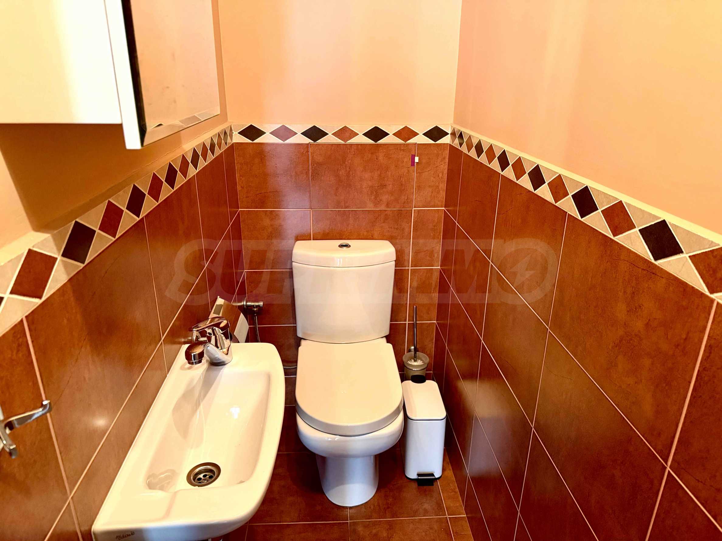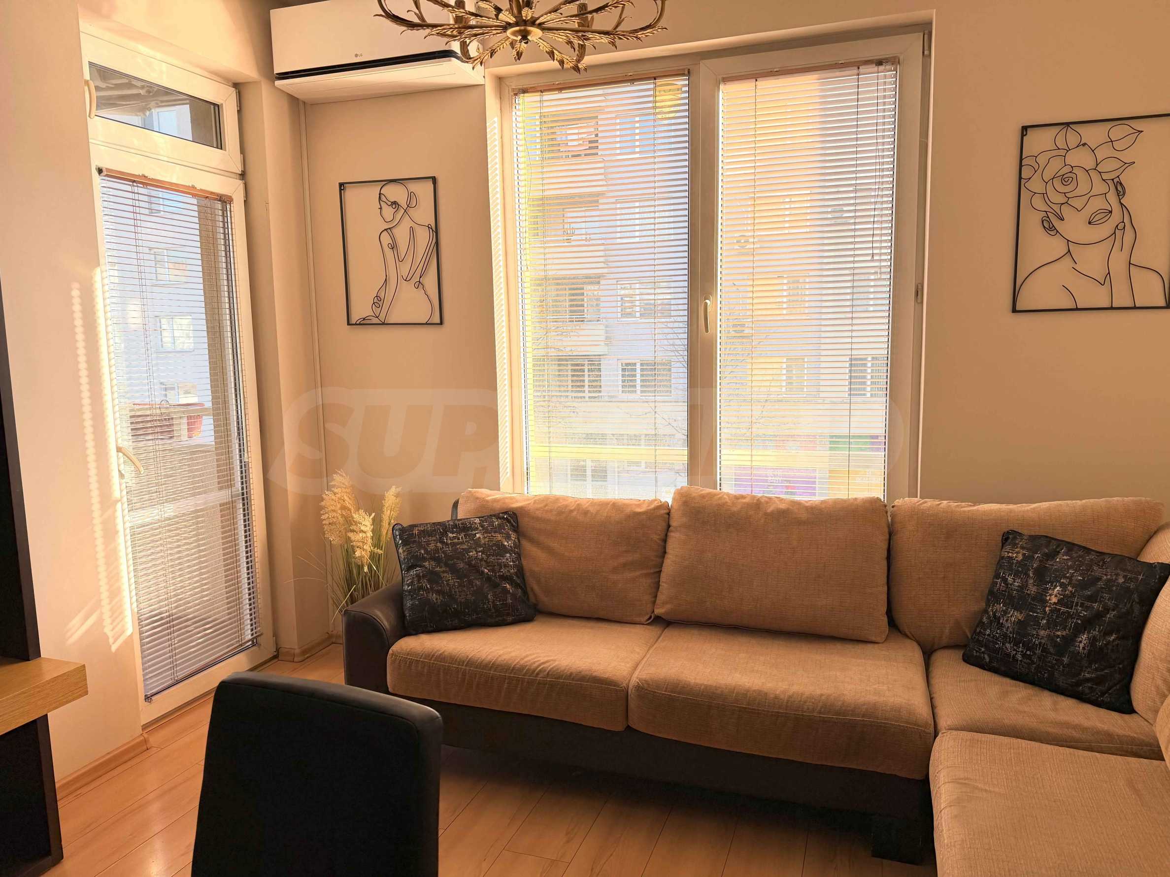 Апартаментът разполага с две самостоятелни спални, просторна дневна, както и допълнителна стая, която може да бъде обособена по преценка на наемателя – като трета спалня или кабинет. Санитарните помещения включват баня с тоалетна, както и отделна тоалетна, което допринася за удобството при ежедневно ползване. Жилището е в много добро общо състояние, с висок клас електроуреди, южно изложение, осигуряващо отлична светлина и топлина през целия ден. Отоплението е посредством централно парно, като за допълнителен комфорт са налични и климатици във всички основни помещения. Към имота има и мазе.