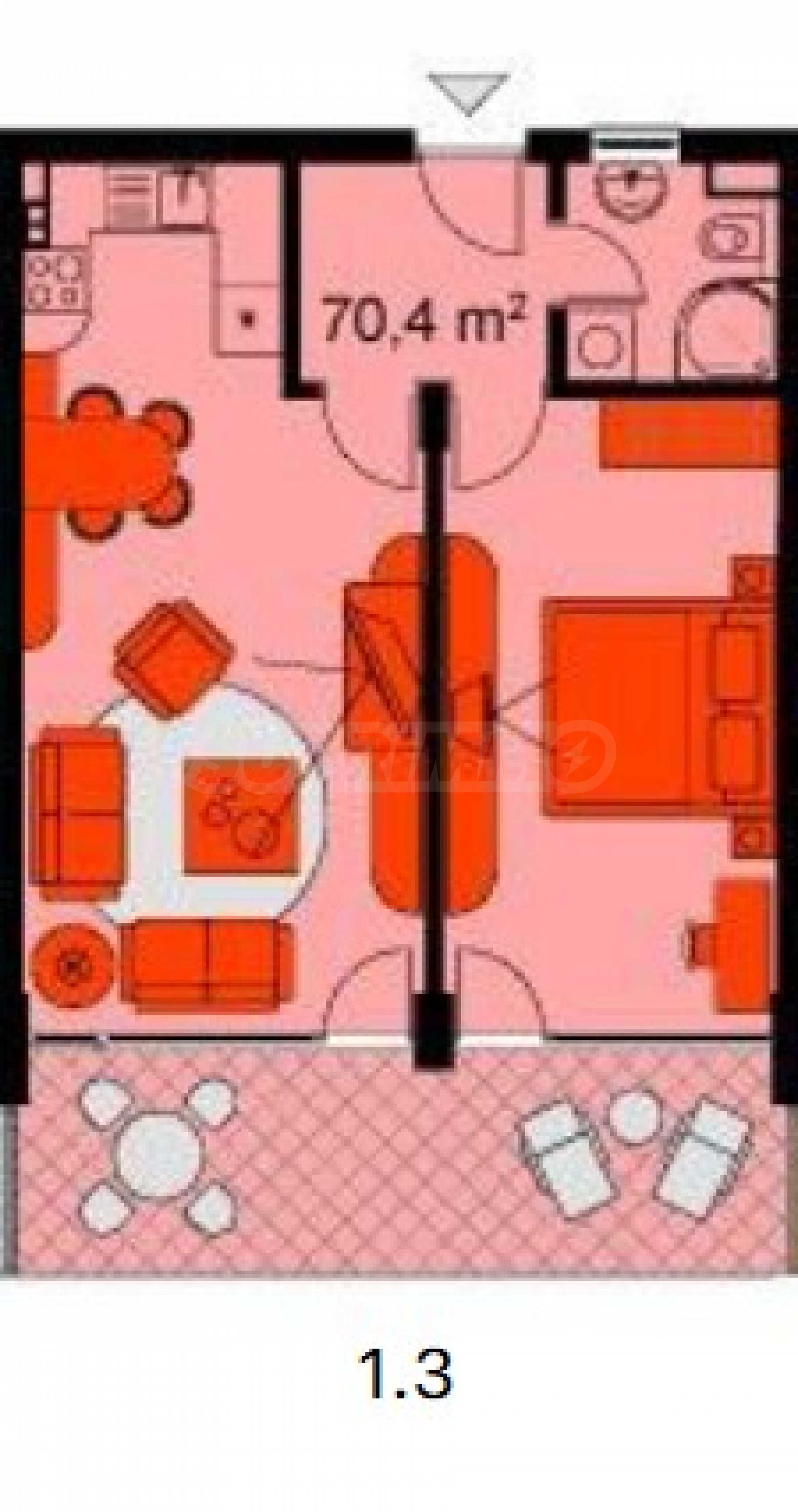 Имотът е с обща площ от 82,96 кв.м, ситуиран на 1-ви етаж с веранда и гледка към басейна.