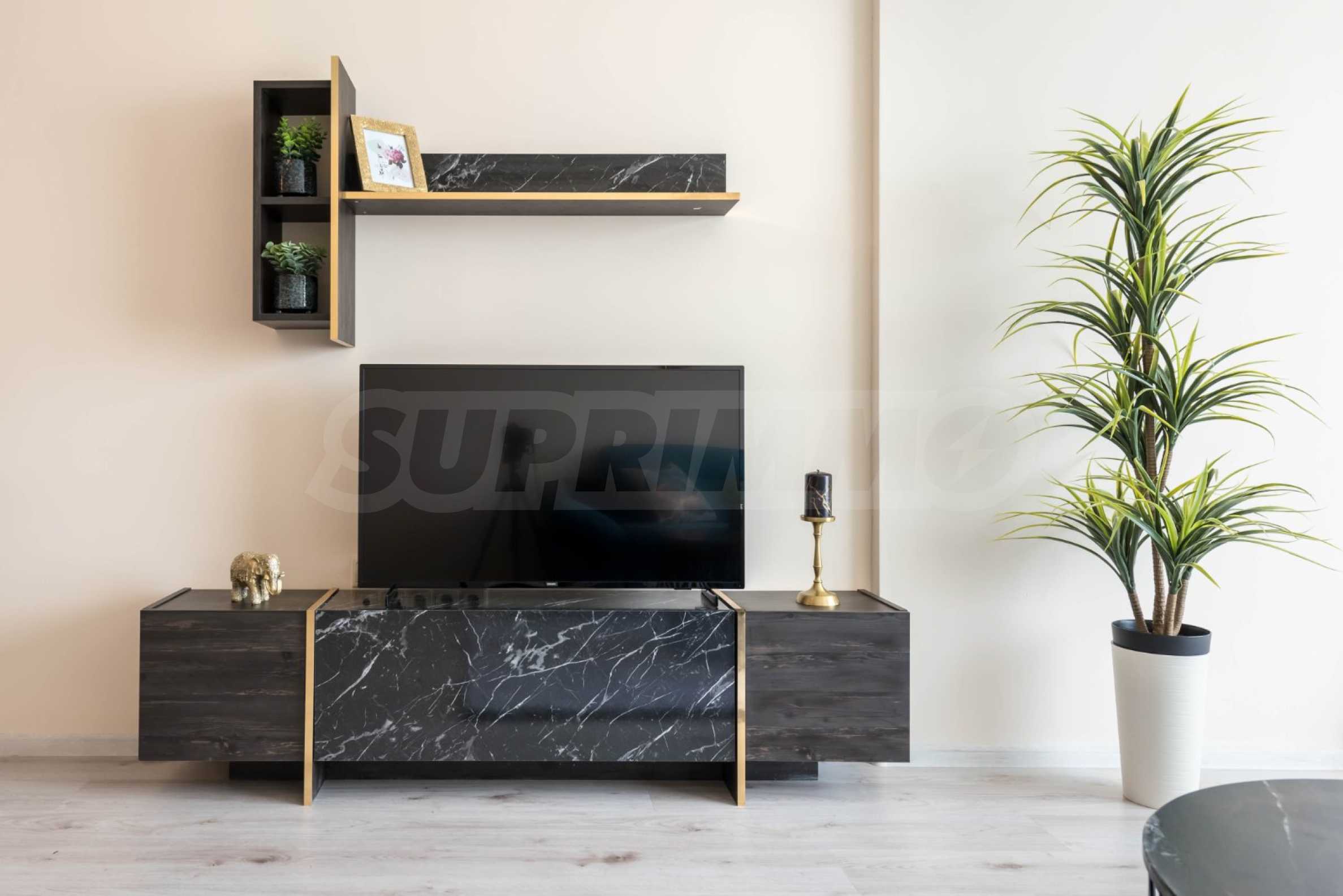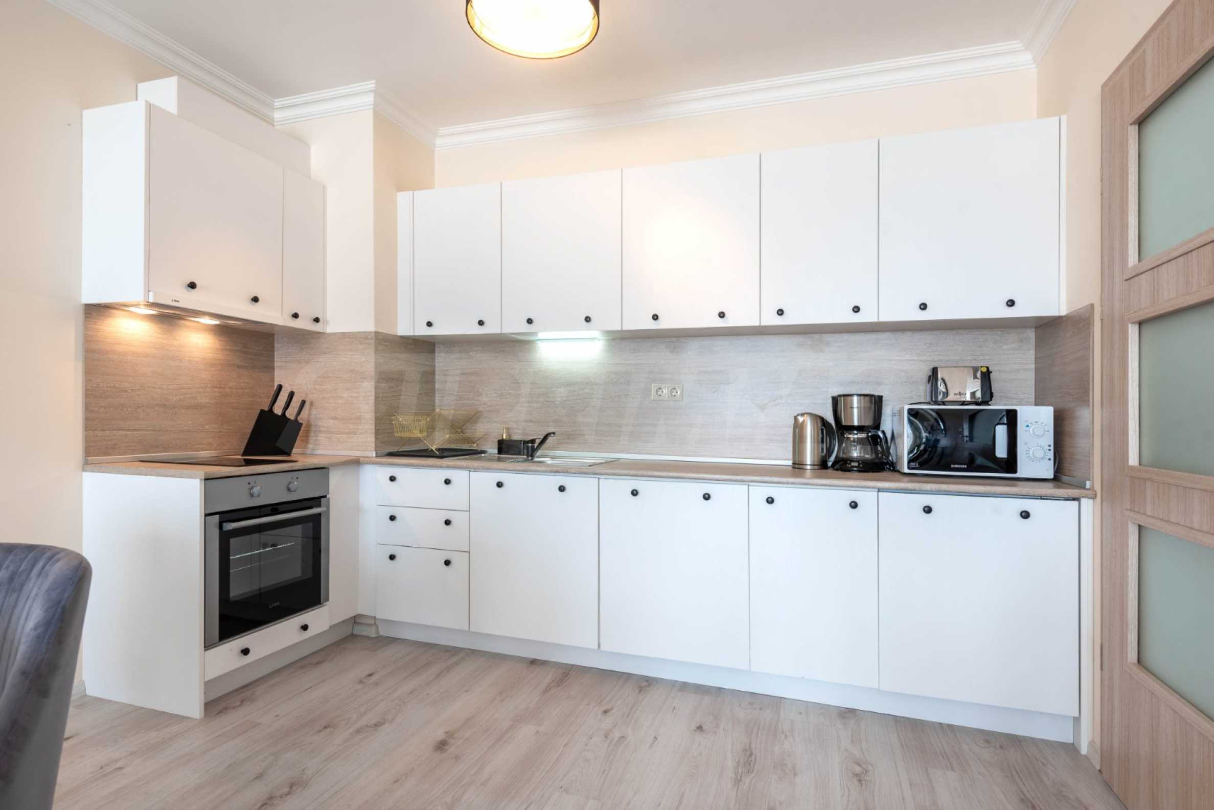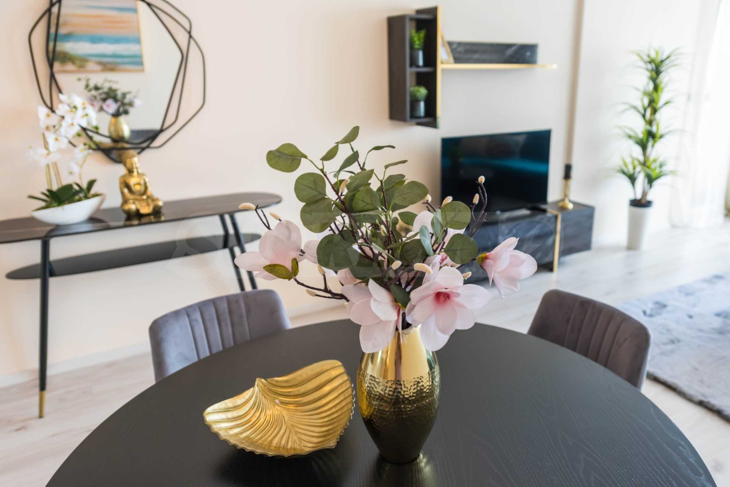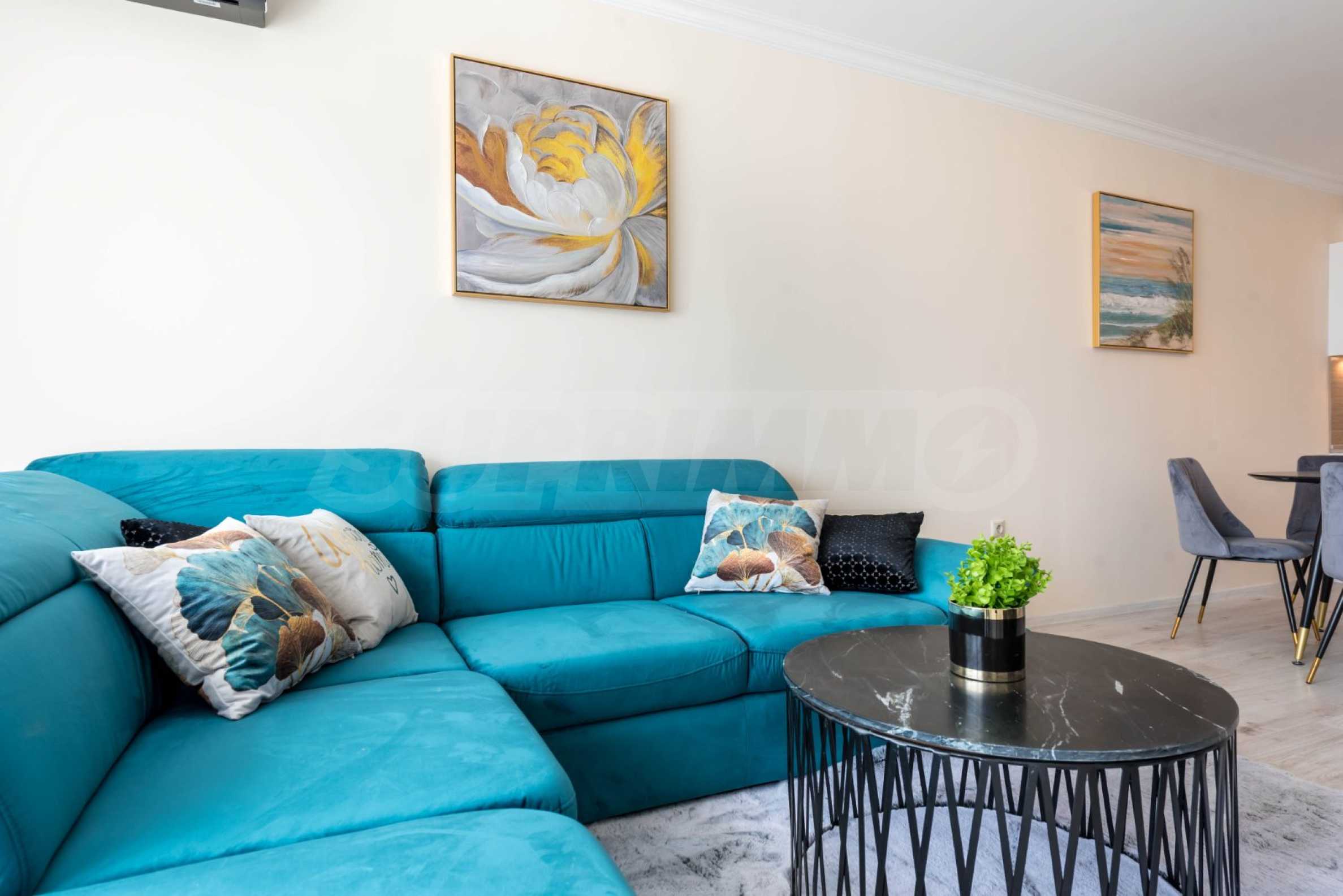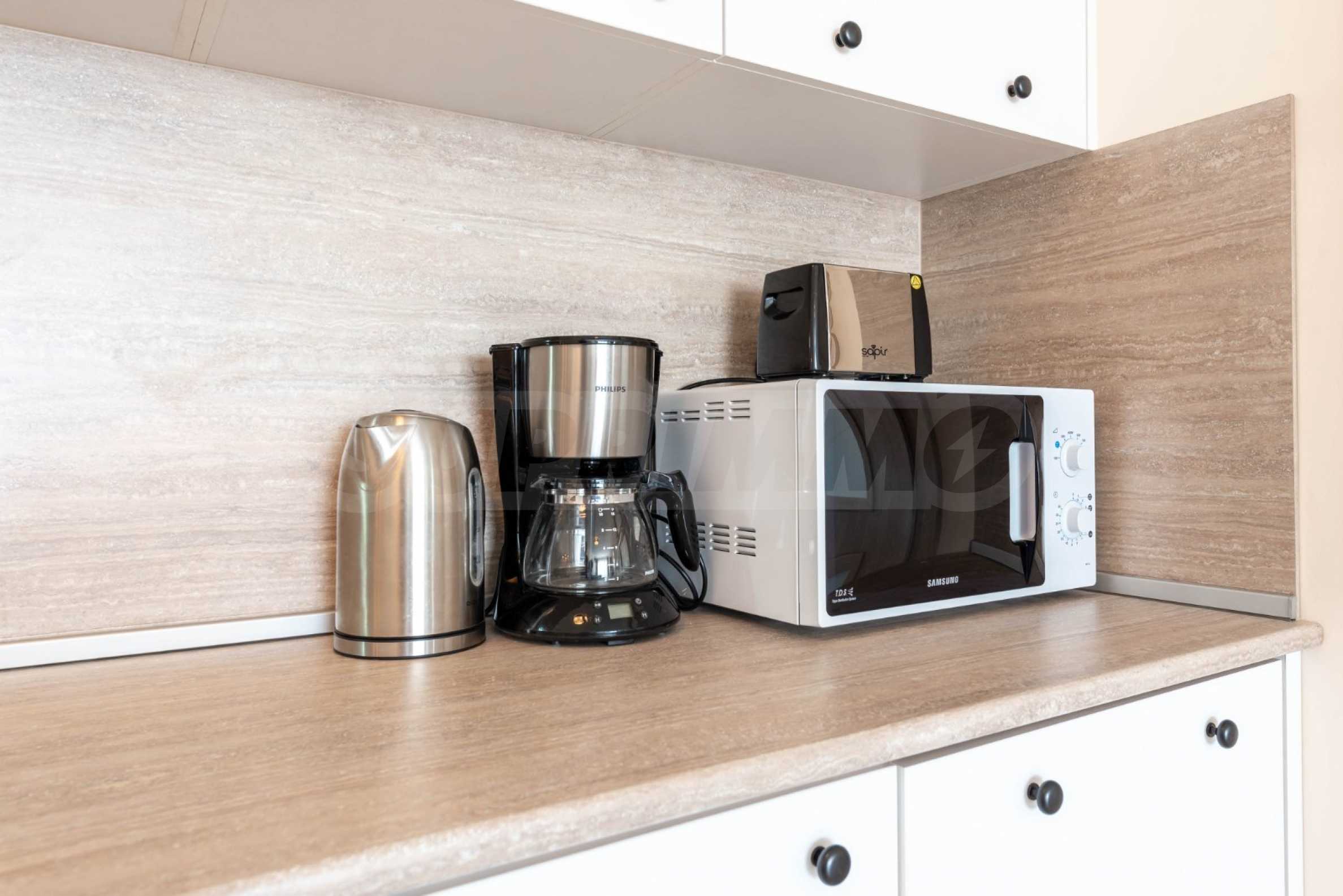 Апартаментът е първокласно обзаведен и оборудван с всичко необходимо за живеене: автоматична пералня, печка и голям хладилник, ТВ, бойлер и др. Интериорът е решен в светли тонове, със съвременни мебели и техника, и във всички стаи има монтирани климатици.