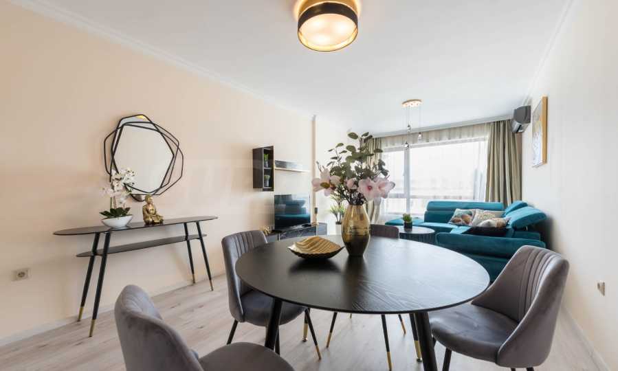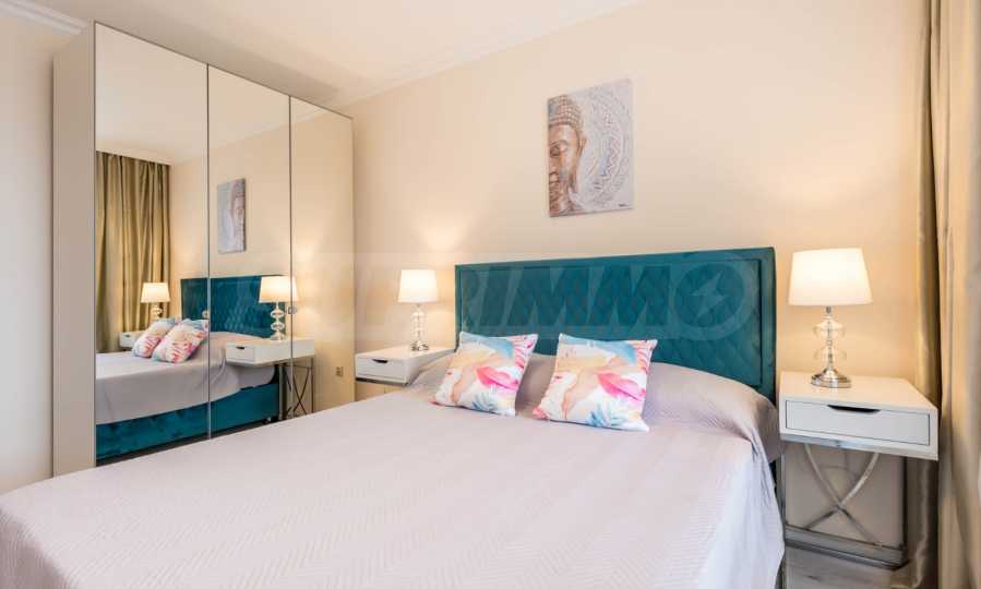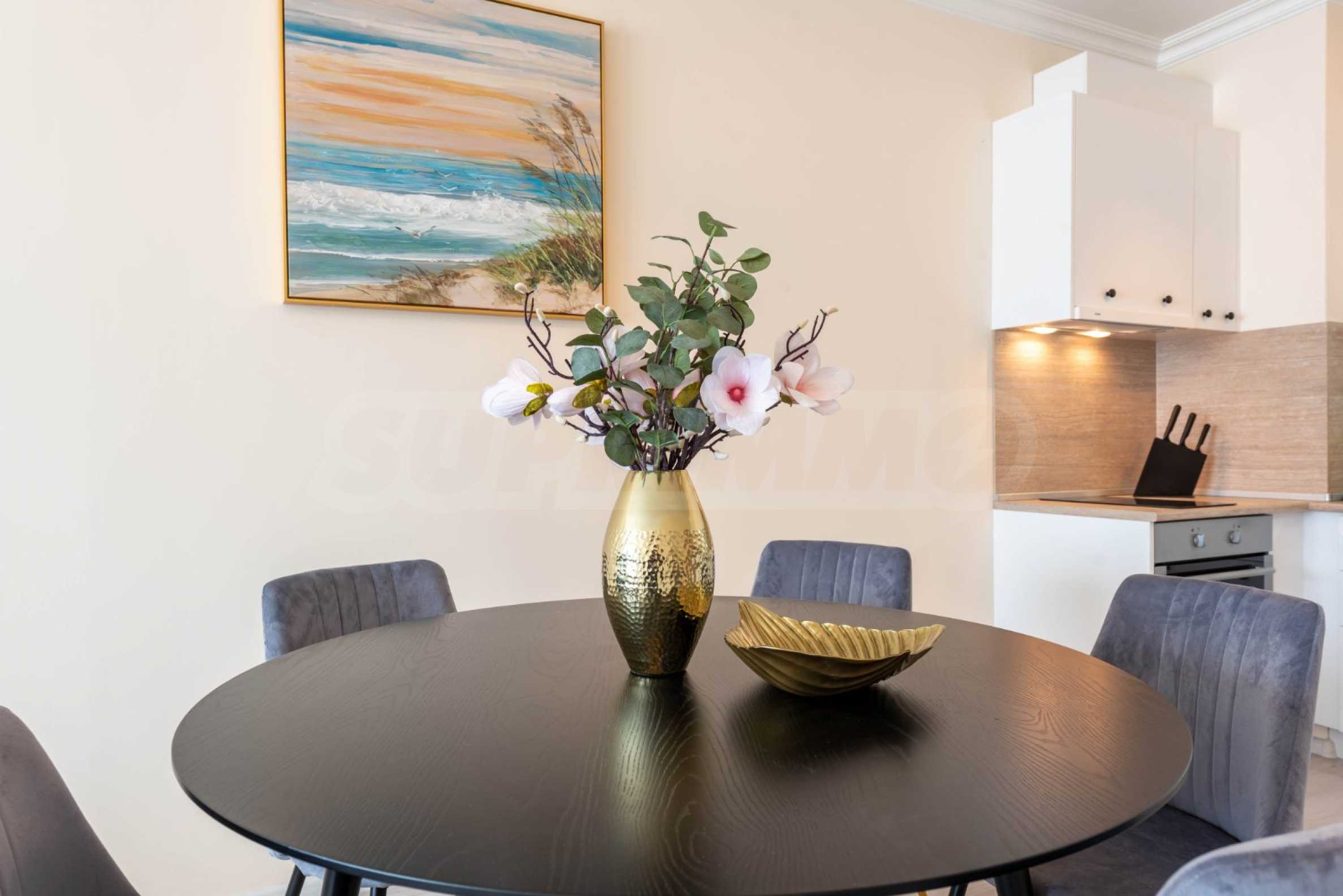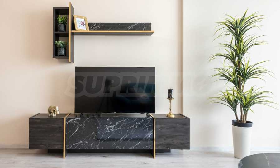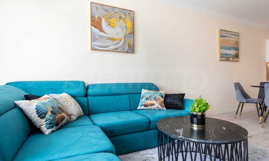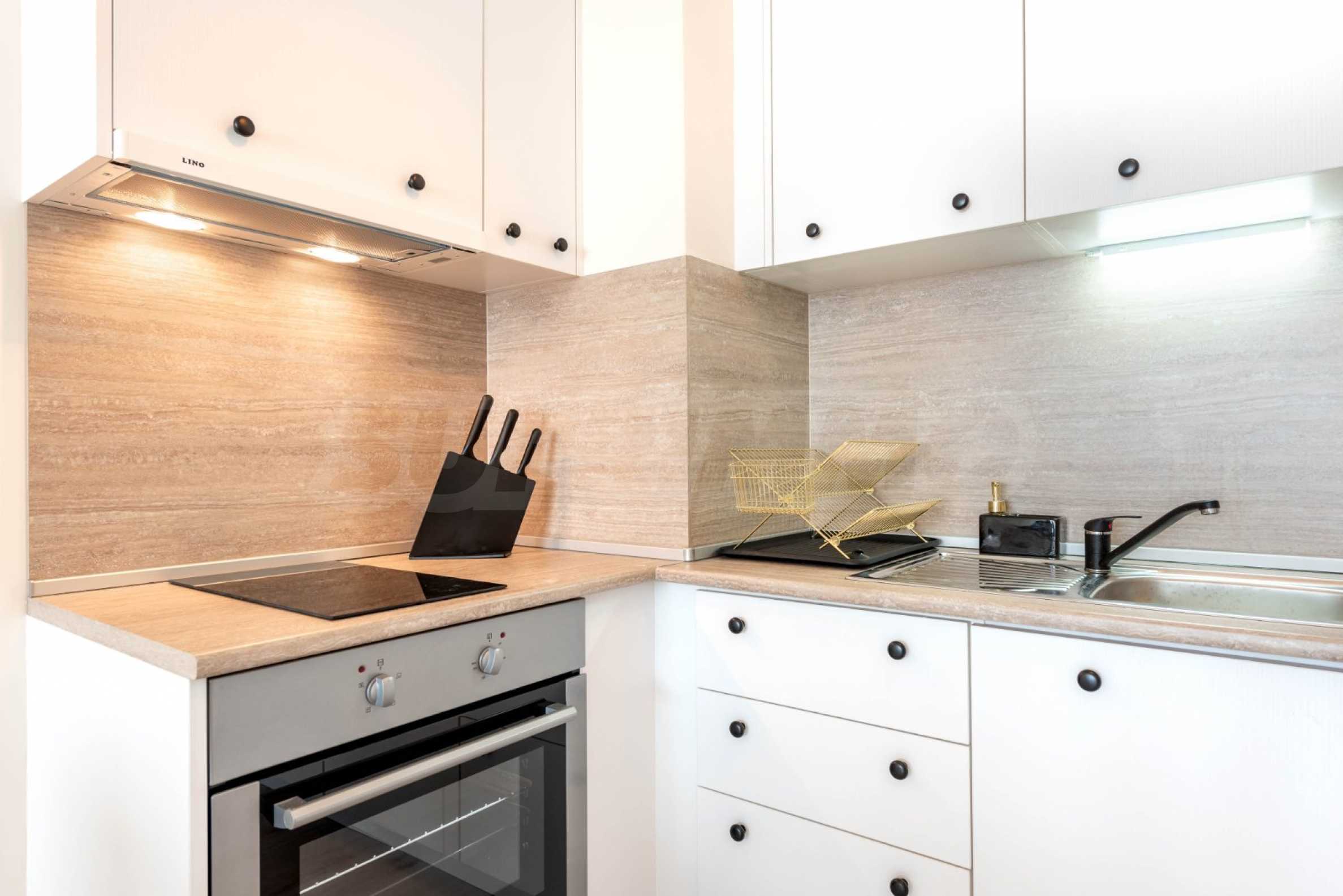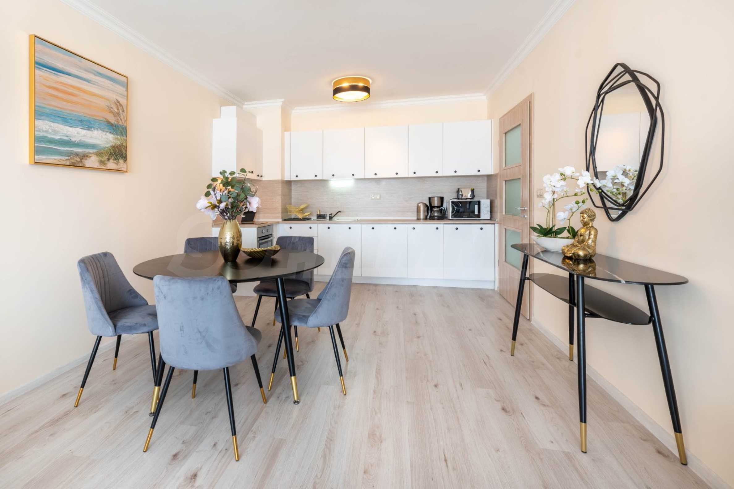 Апартаментът е първокласно обзаведен и оборудван с всичко необходимо за живеене: автоматична пералня, печка и голям хладилник, ТВ, бойлер и др. Интериорът е решен в светли тонове, със съвременни мебели и техника, и във всички стаи има монтирани климатици.