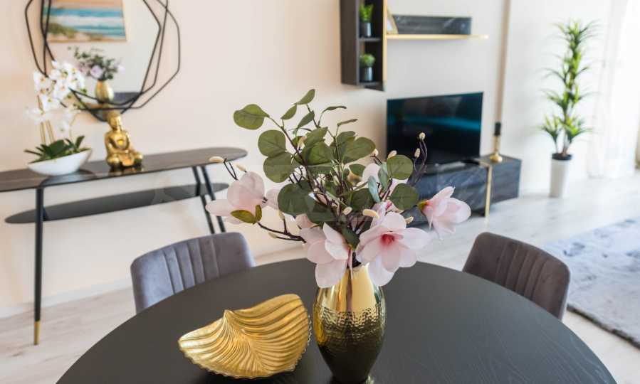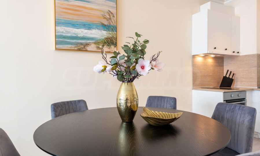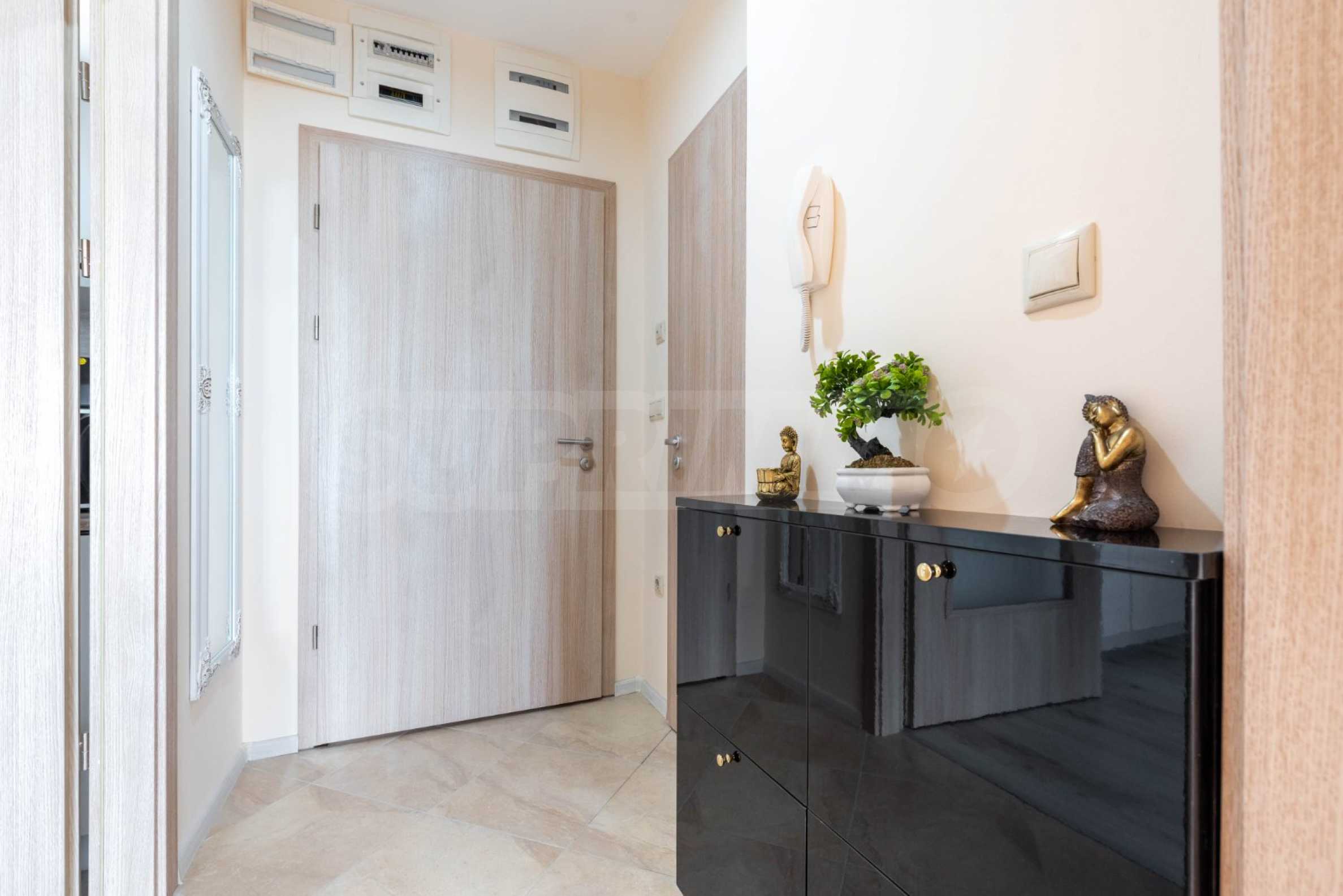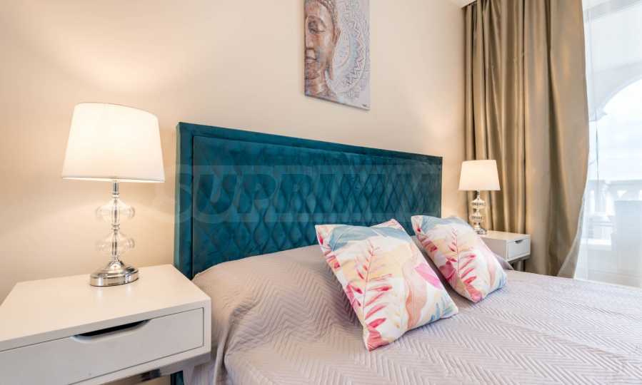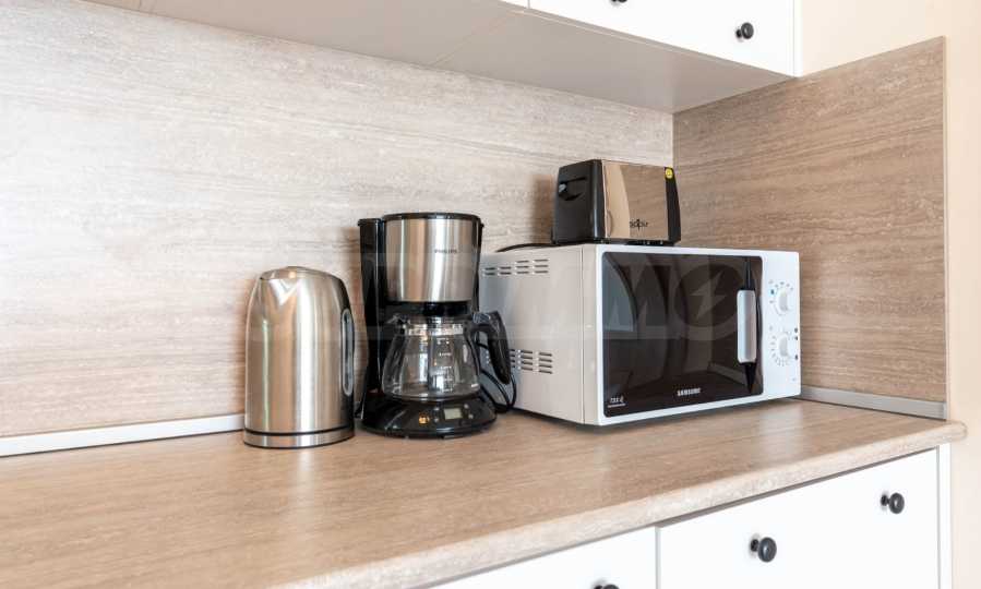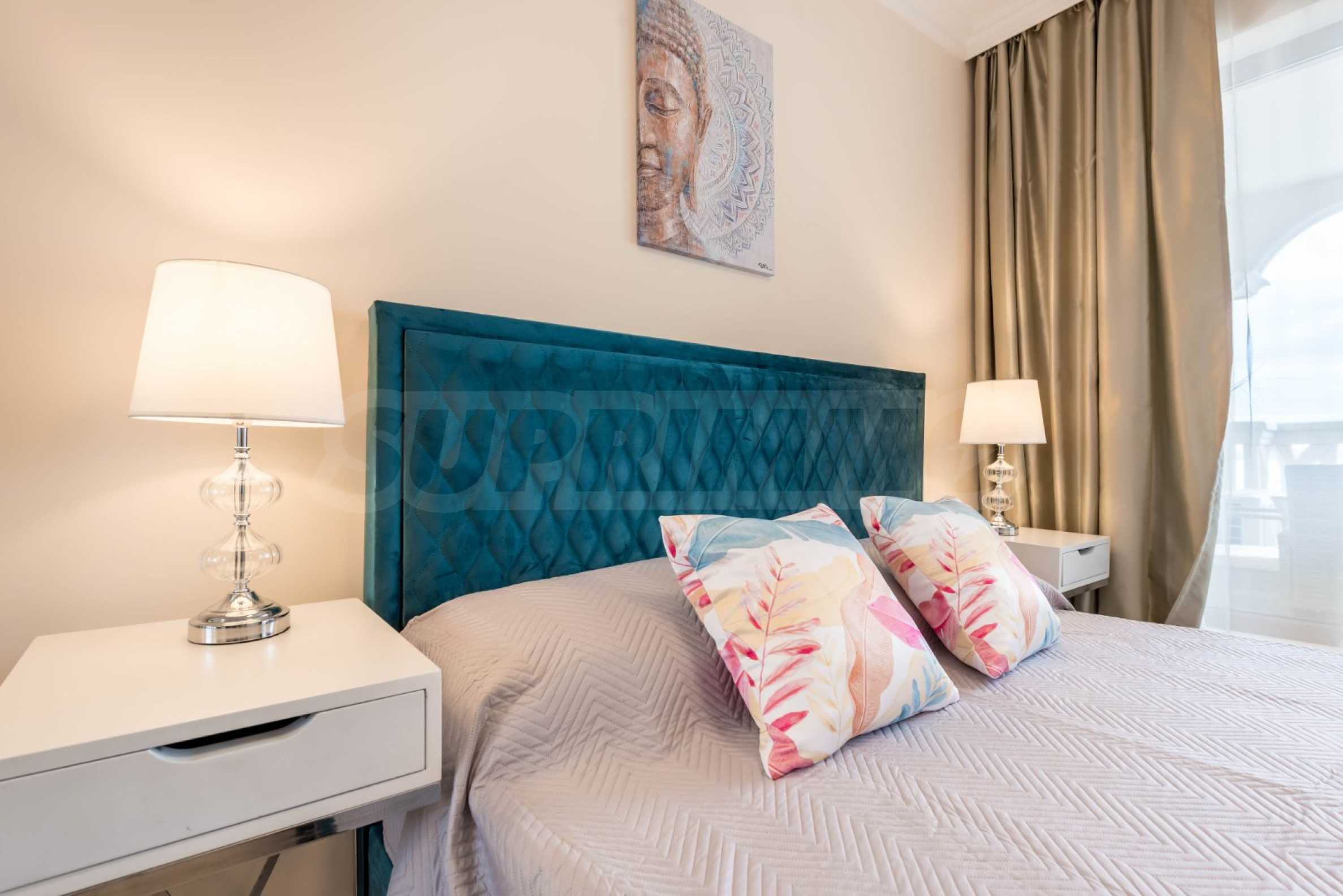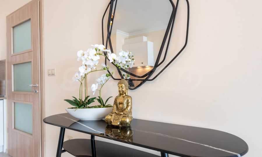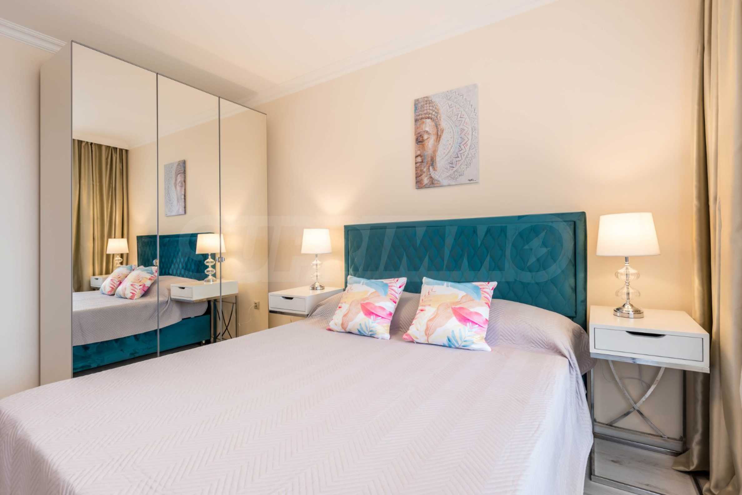 Апартаментът е първокласно обзаведен и оборудван с всичко необходимо за живеене: автоматична пералня, печка и голям хладилник, ТВ, бойлер и др. Интериорът е решен в светли тонове, със съвременни мебели и техника, и във всички стаи има монтирани климатици.