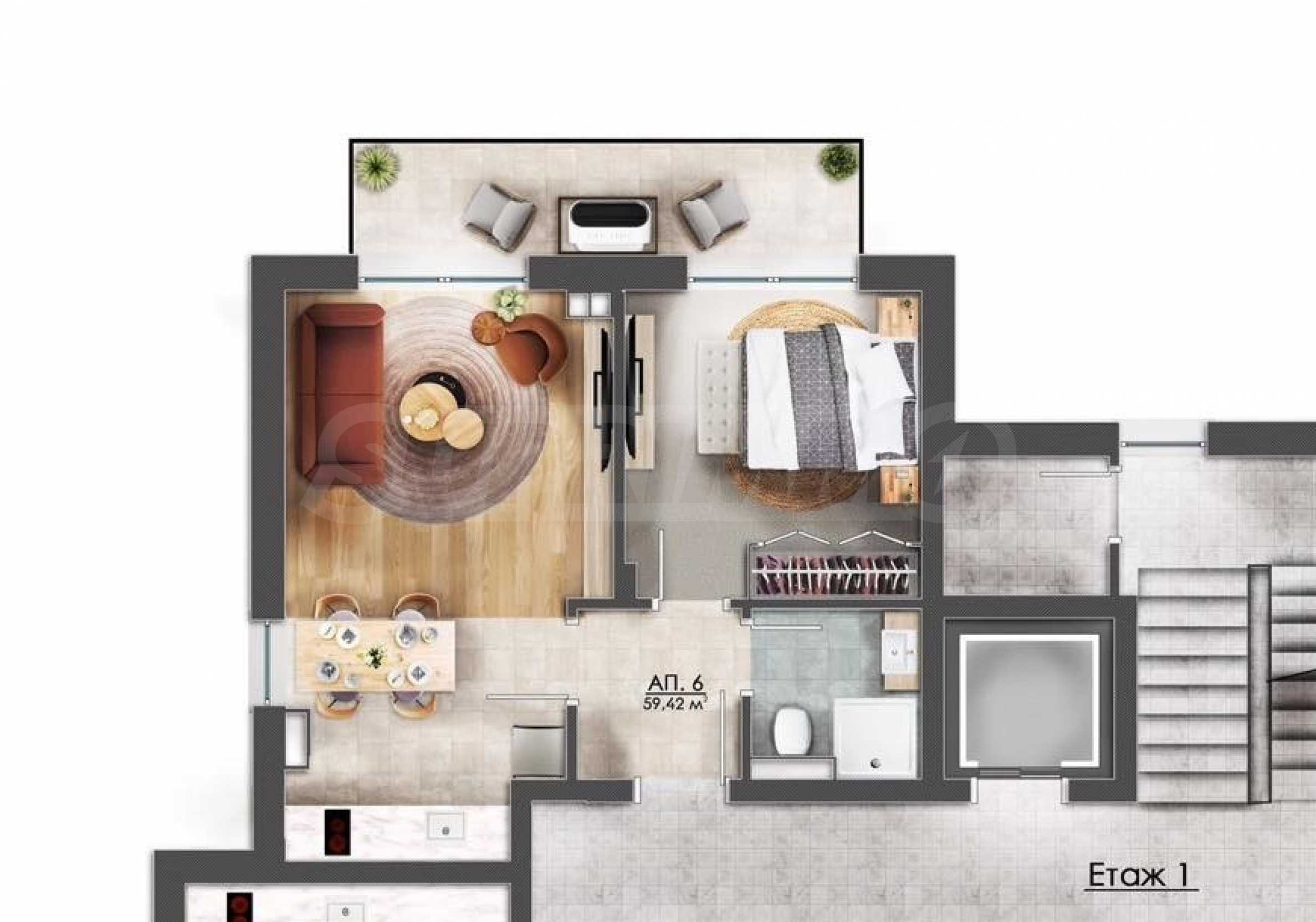 Имотът е с обща площ от 57 кв.м, ситуиран на втори етаж и се състои от антре, кухня с хол, спалня, баня с тоалет и тераса.