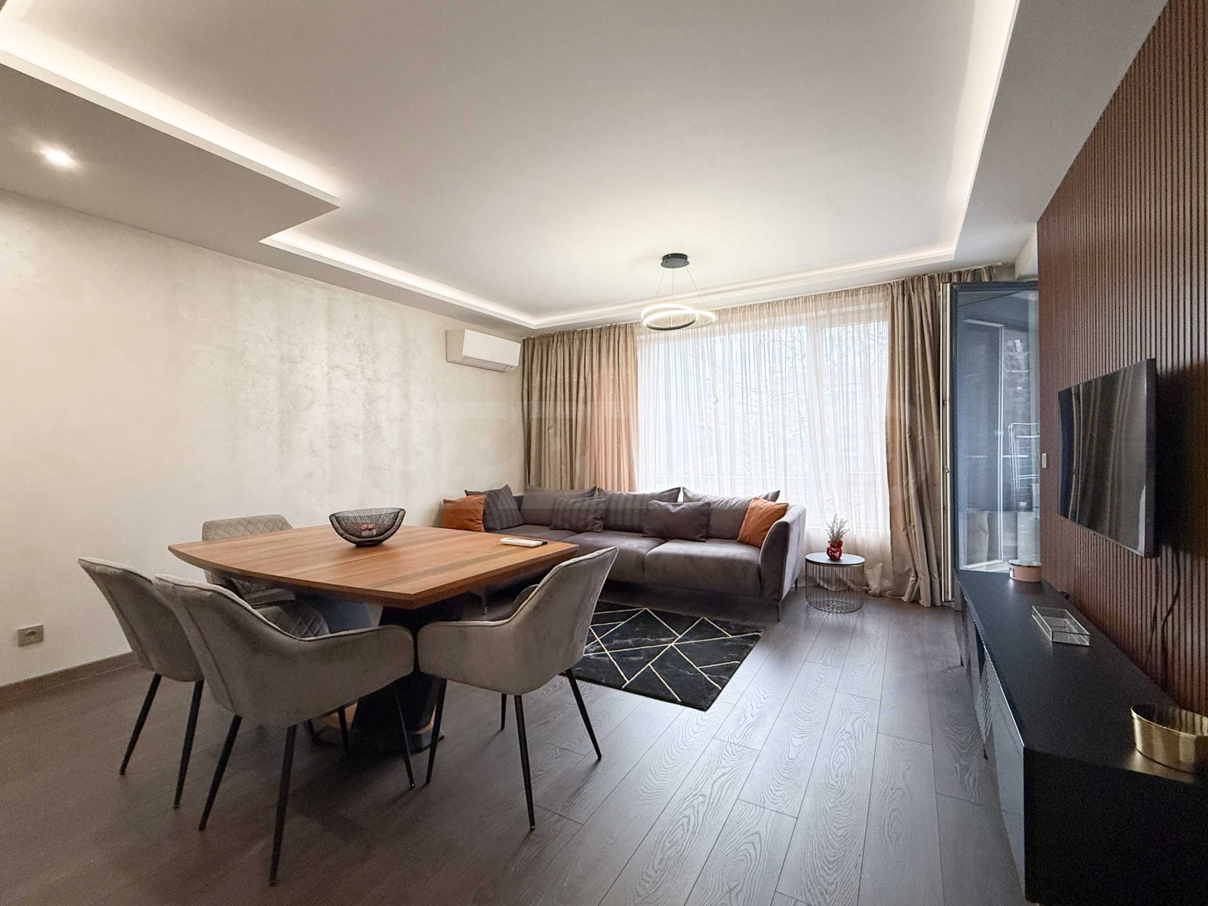 • Уютната всекидневна предлага комфортно пространство за отдих и забавления. Завършена е с удобен диван с гледка към нов телевизор, ниска холна масичка и функционална трапезна маса със столове.
