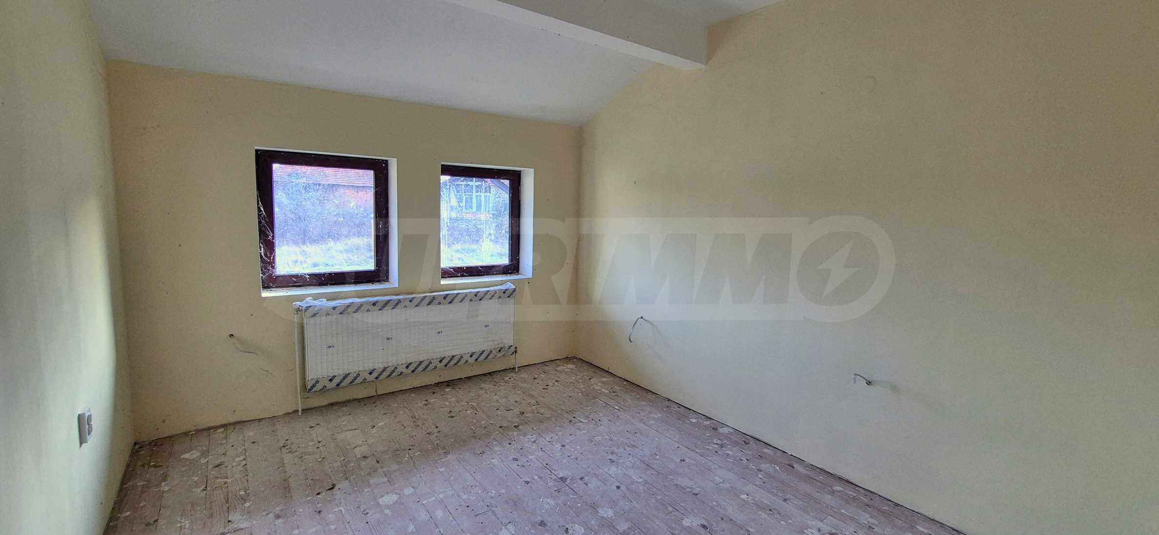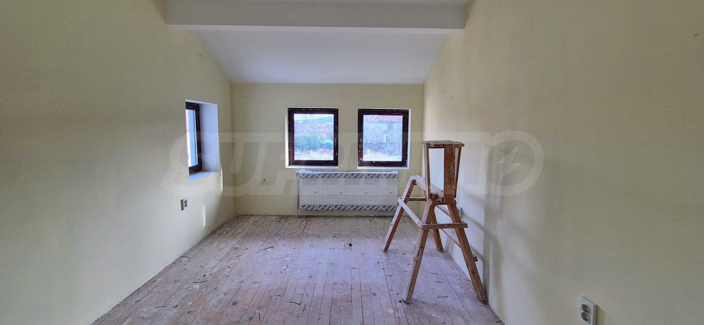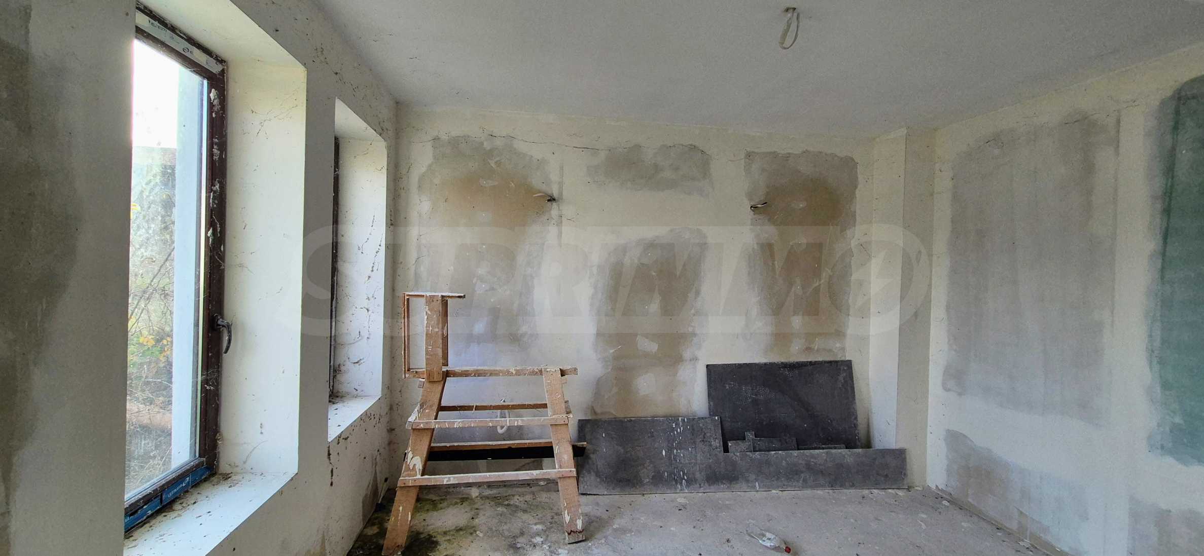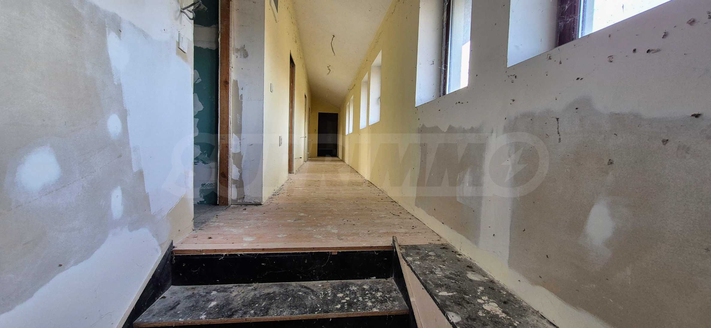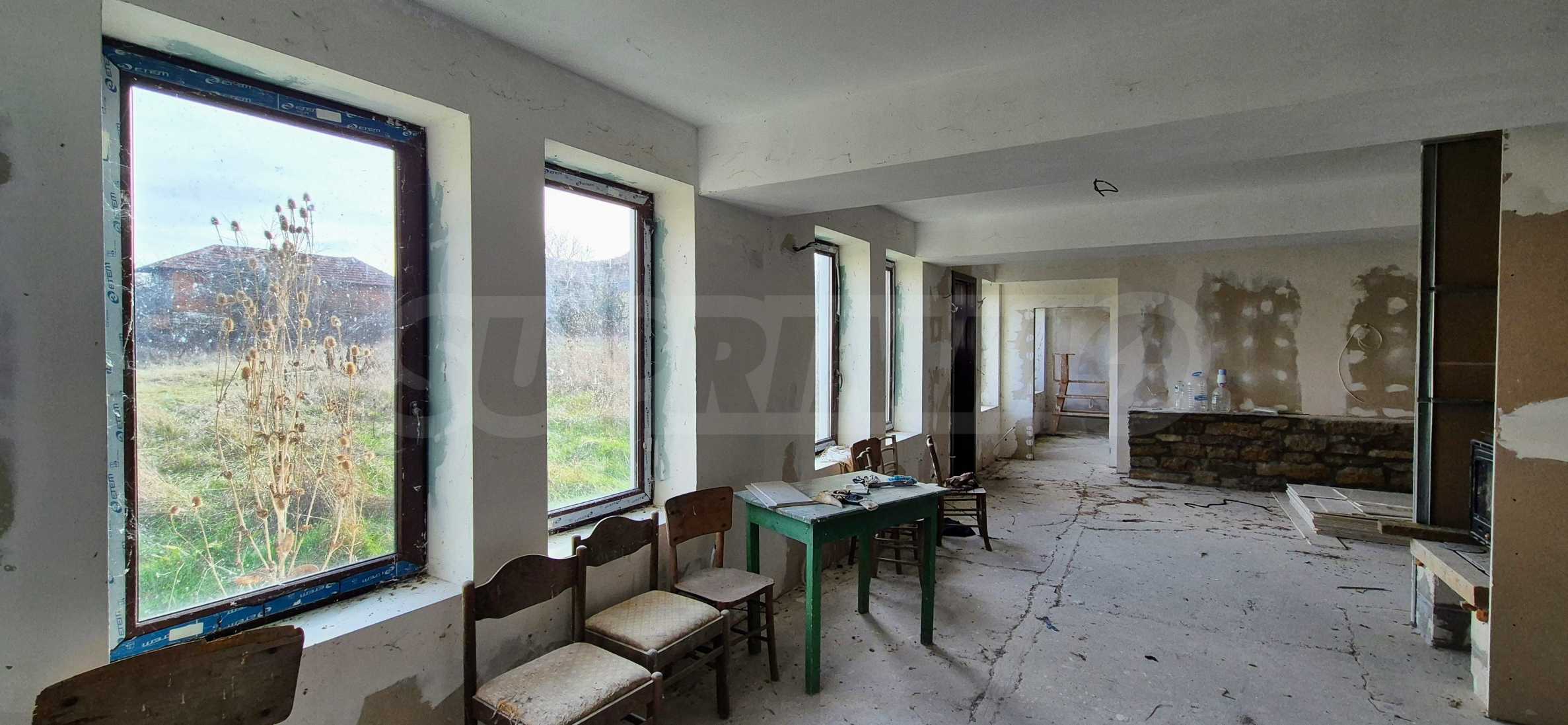 Основната двуетажна сграда е с РЗП 231 кв.м. (115.50 кв.м. ЗП) и е в груб строеж, но с извършени съществени подобрения: положена външна мазилка, PVC дограма, нов покрив, гръмоотвод, както и започнати ВиК и ел. инсталации, вътрешна изолация и мазилки.