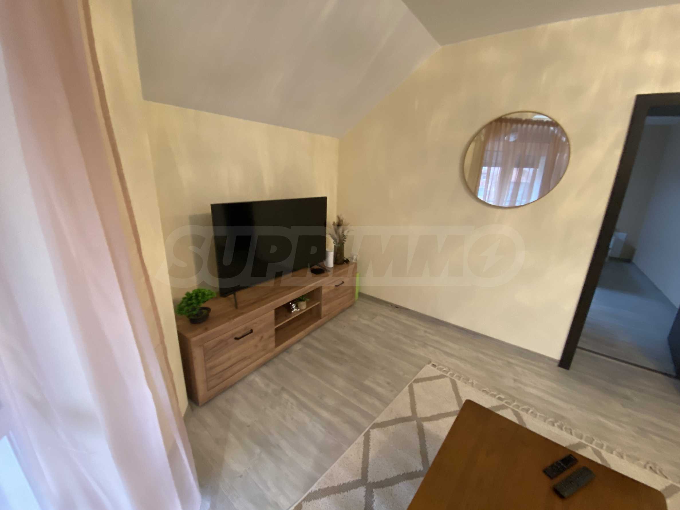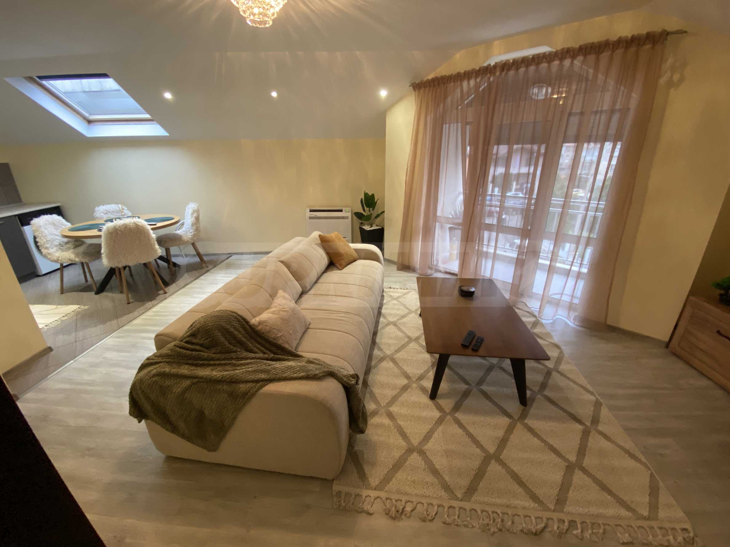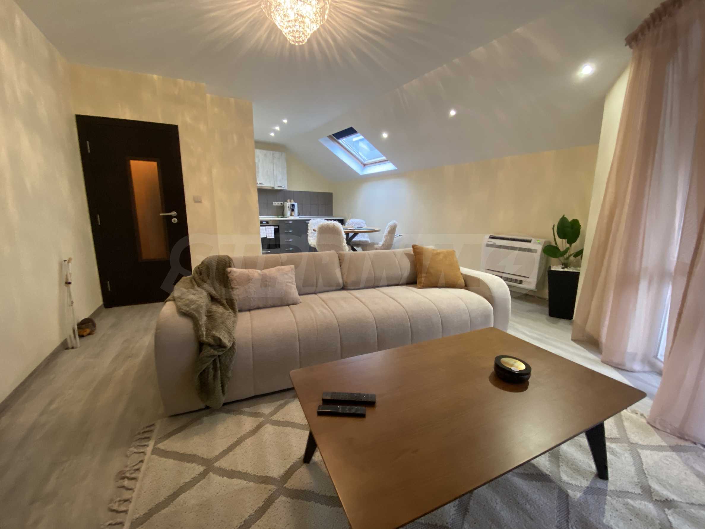 Разпределението на апартамента включва функционална кухненска част, дневен тракт, спалня, баня с тоалетна и малък балкон. Пространствата са обзаведени с нови мебели и оборудвани с електрически уреди, осигуряващи необходимия комфорт за ежедневието. В апартамента отоплението се осъществява чрез климатик, което позволява оптимално регулиране на температурата през различните сезони.