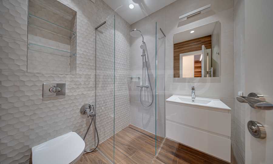 • Банята е оборудвана с висок клас санитария - тоалетна, мивка и душ кабина.