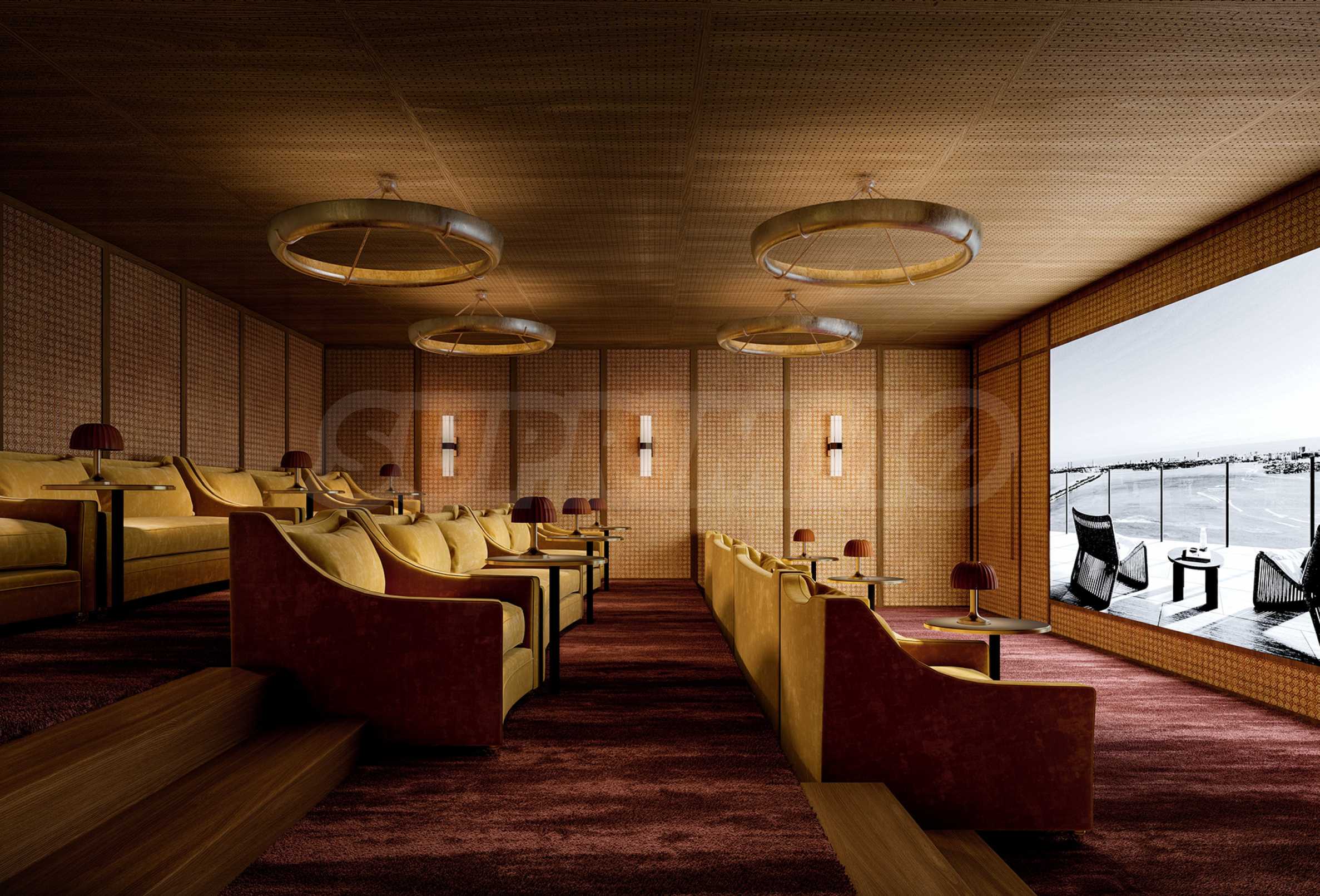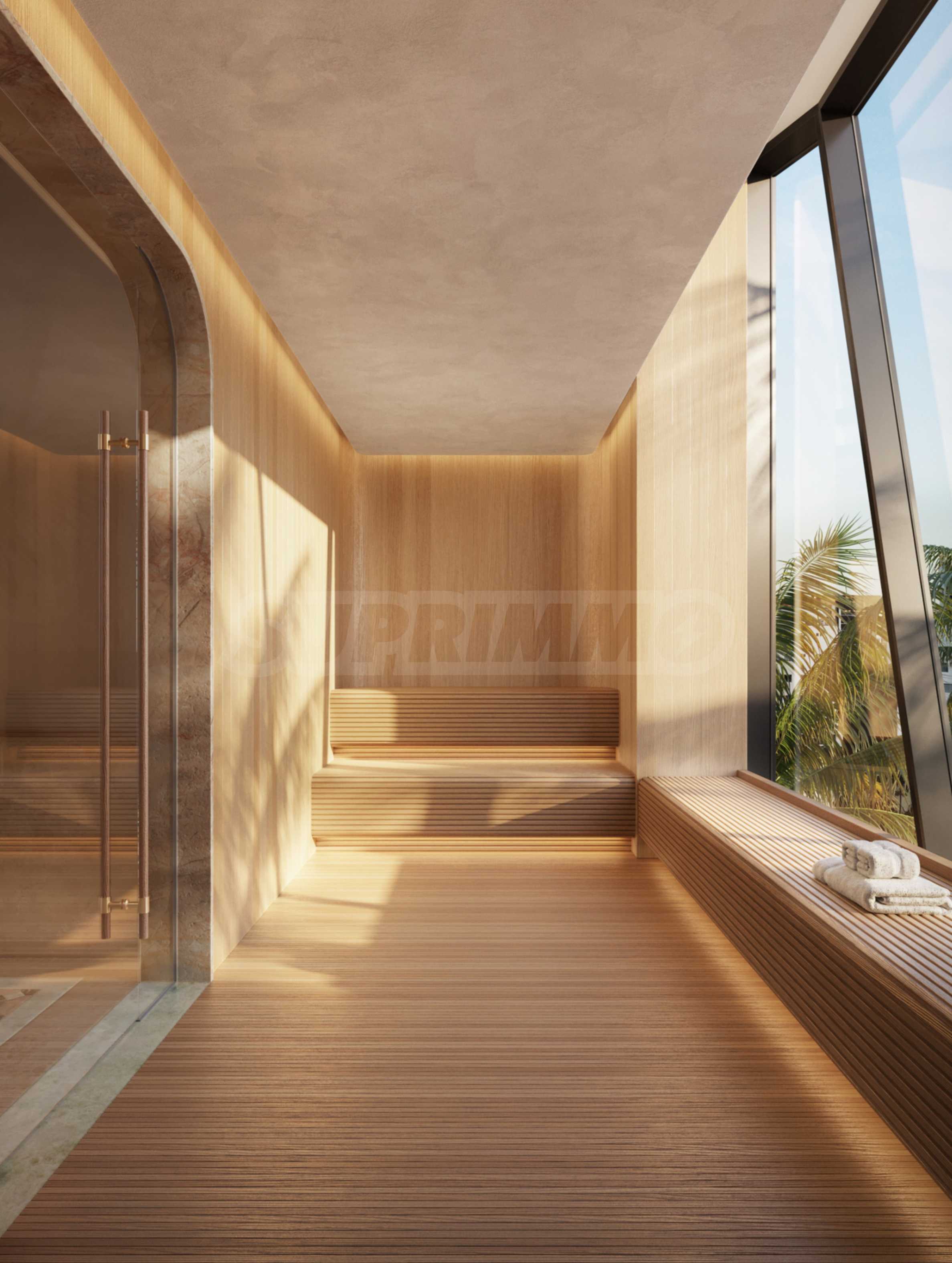 На пето ниво на сградата е разположена изцяло посветена на уелнес и релакс зона, създадена да предложи пълноценна грижа за тялото и сетивата. Пространството включва луксозен спа център и салон за красота, както и външен басейн, идеален за моменти на пълно отпускане. Специализираните терапевтични помещения, сауната и билковата парна баня допълват цялостното изживяване, а хромотерапевтичните и сензорни душове, заедно с топлите и студени басейни за контрастни процедури, стимулират възстановяването и баланса. За пълноценен завършек на спа ритуала е предвиден стилен лаундж за релакс, както и удобни съблекални, които осигуряват комфорт и уединение във всеки момент.
