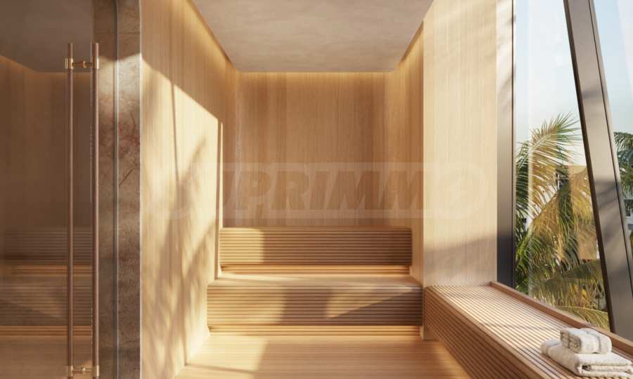 Баните впечатляват с изтънченост и внимание към всеки детайл, превръщайки се в естествено продължение на хидротерапевтичните удобства в сградата. Просторните, извити вани за пълноценно отпускане, съчетани с меки мраморни повърхности, месингови акценти и фино флутирано стъкло, създават уют и комфорт. Всяка спалня разполага със собствена баня, а основната баня е проектирана като истински спа оазис с внушителна вана, подове от травертинова порцеланова настилка и стени, облицовани с Greige Onyx порцелан. Високият клас санитария и аксесоари от Dornbracht и Duravit допълват изживяването, превръщайки ежедневните ритуали в момент на истинско удоволствие и релакс.