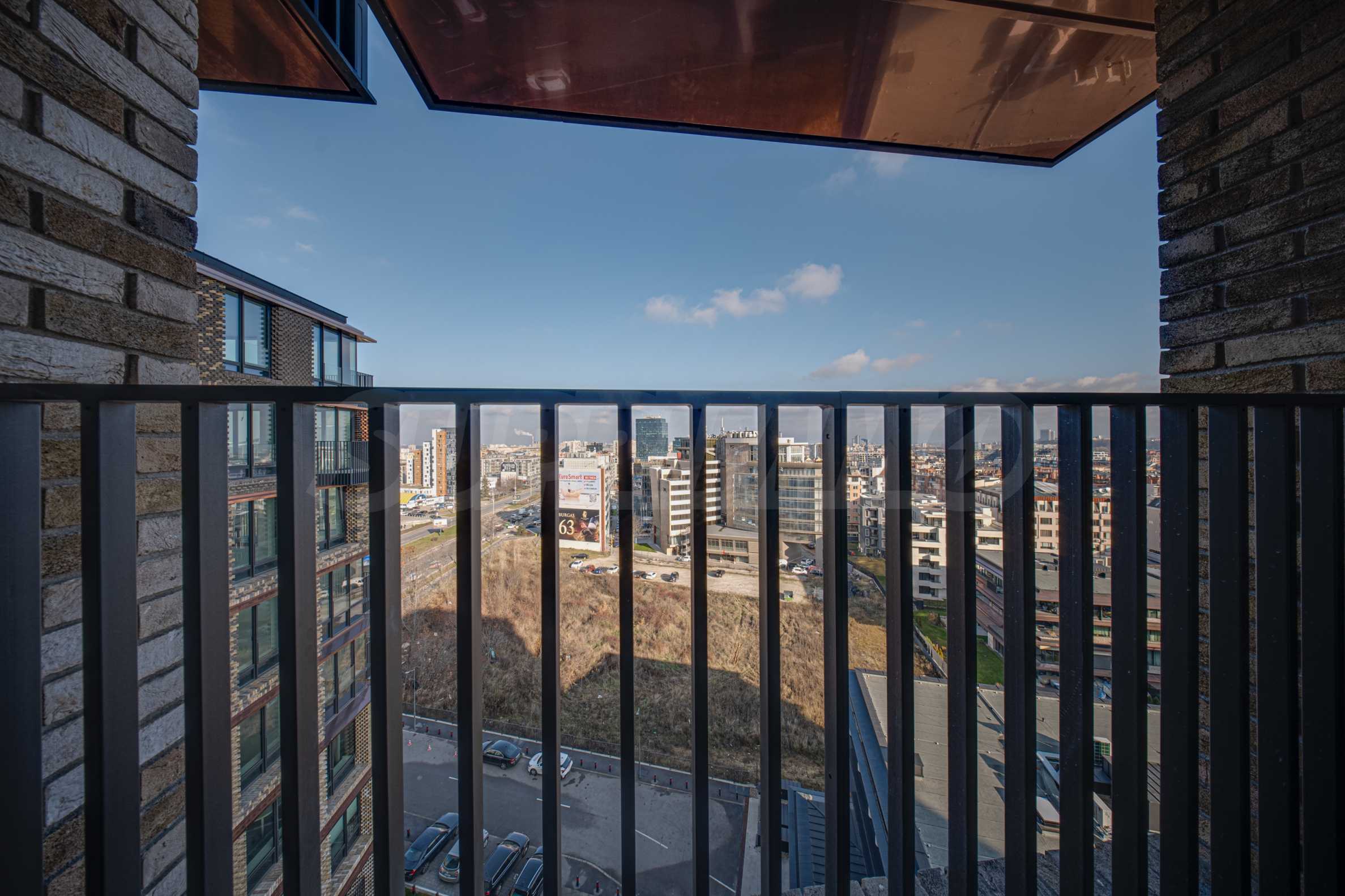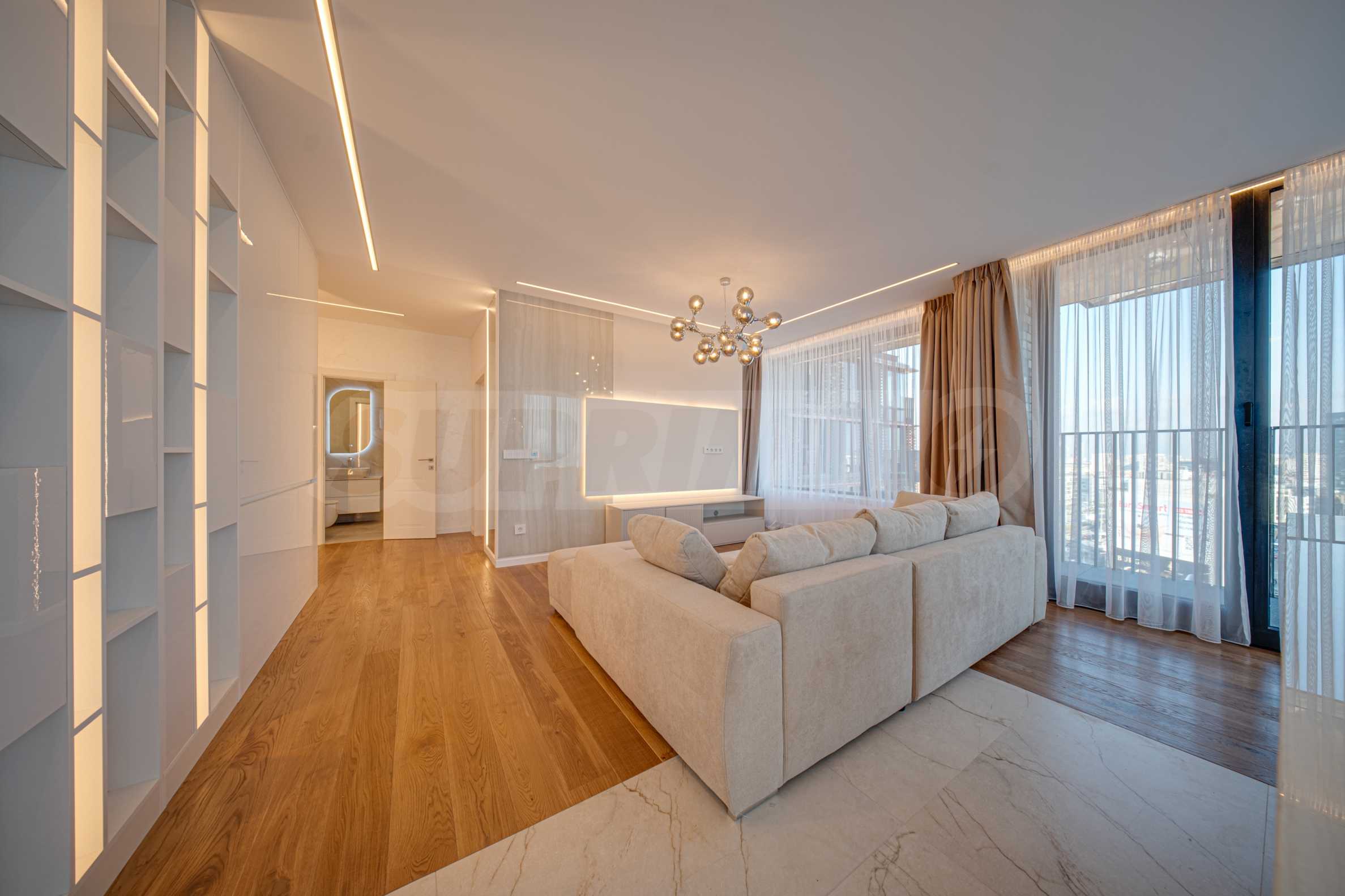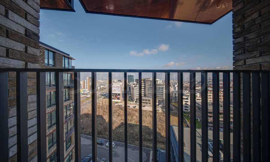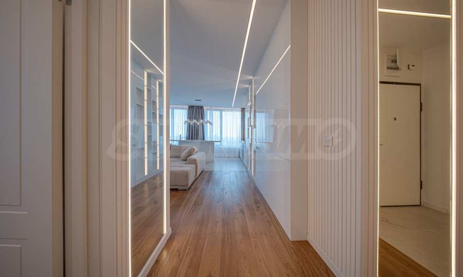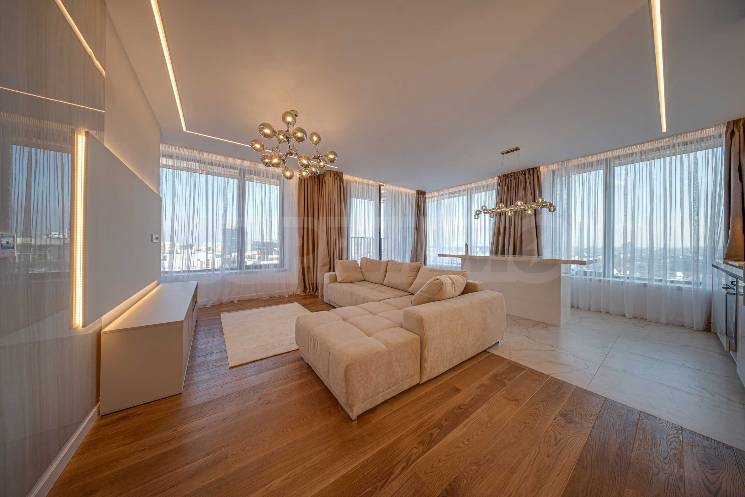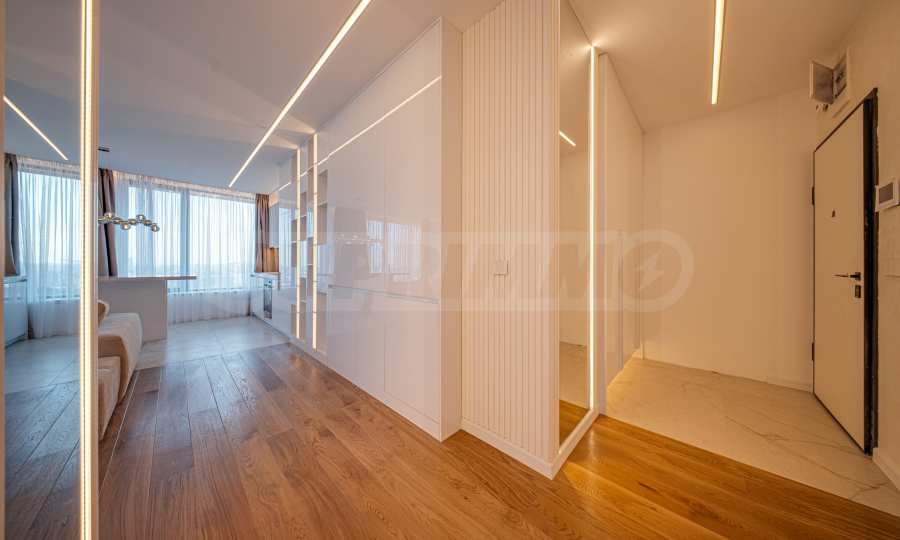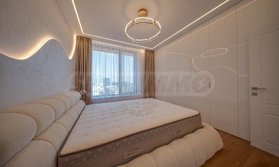 Апартаментът от 96 кв.м е разположен на 10-ти етаж, с панорамни гледки към града и Витоша. Имотът е светъл, предлага модерна дизайнерска визия и интериор с изчистени линии. Големите прозорци допринасят за простор и изобилие на светлина, а качествените материали и изискани мебели - за уют и елегантност. Разпределението включва удобно антре, баня с тоалетна, комфортна спалня, просторна дневна с кухня и трапезария, тераса.