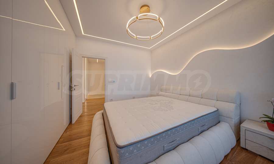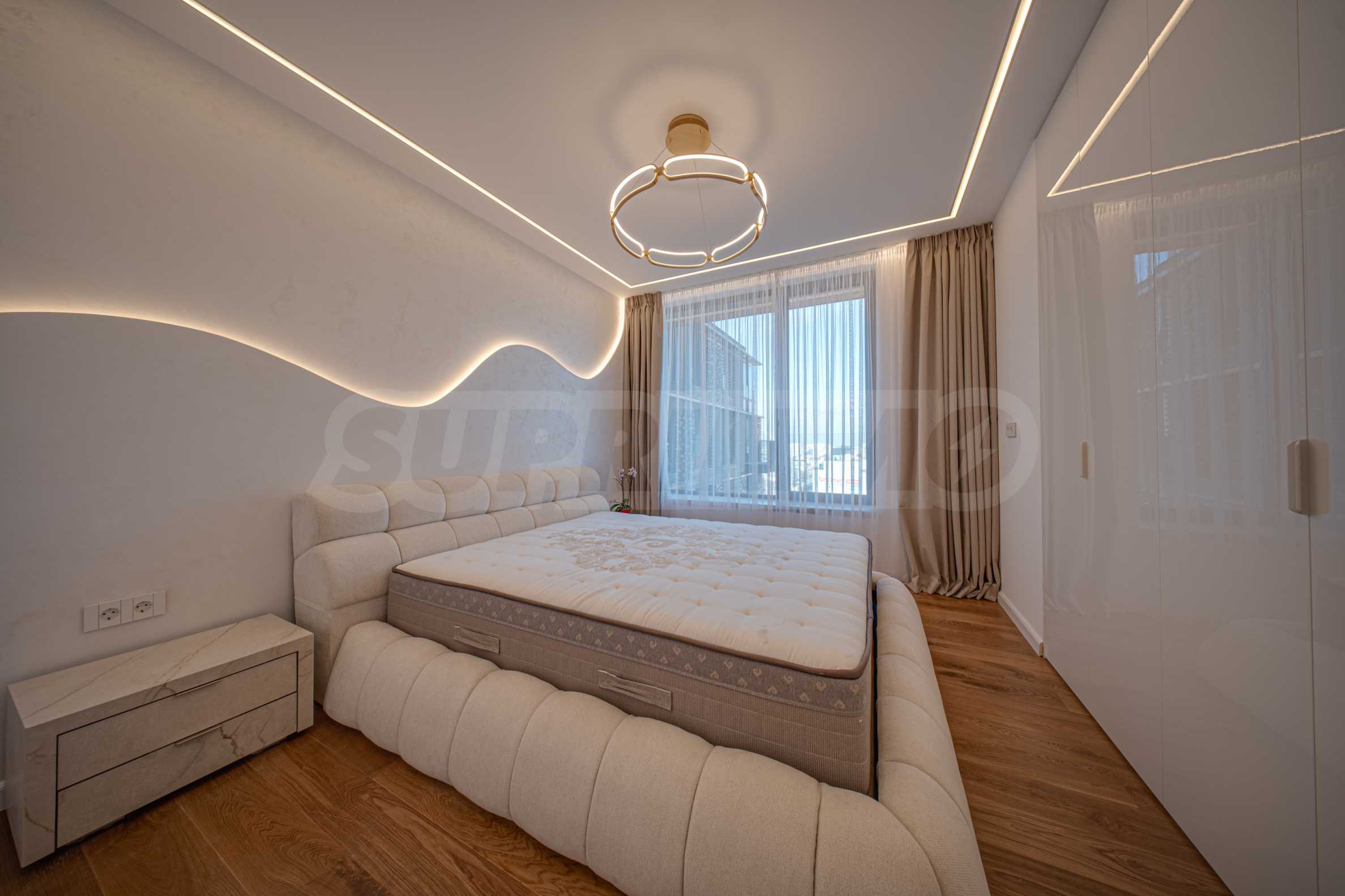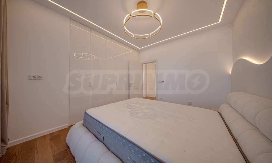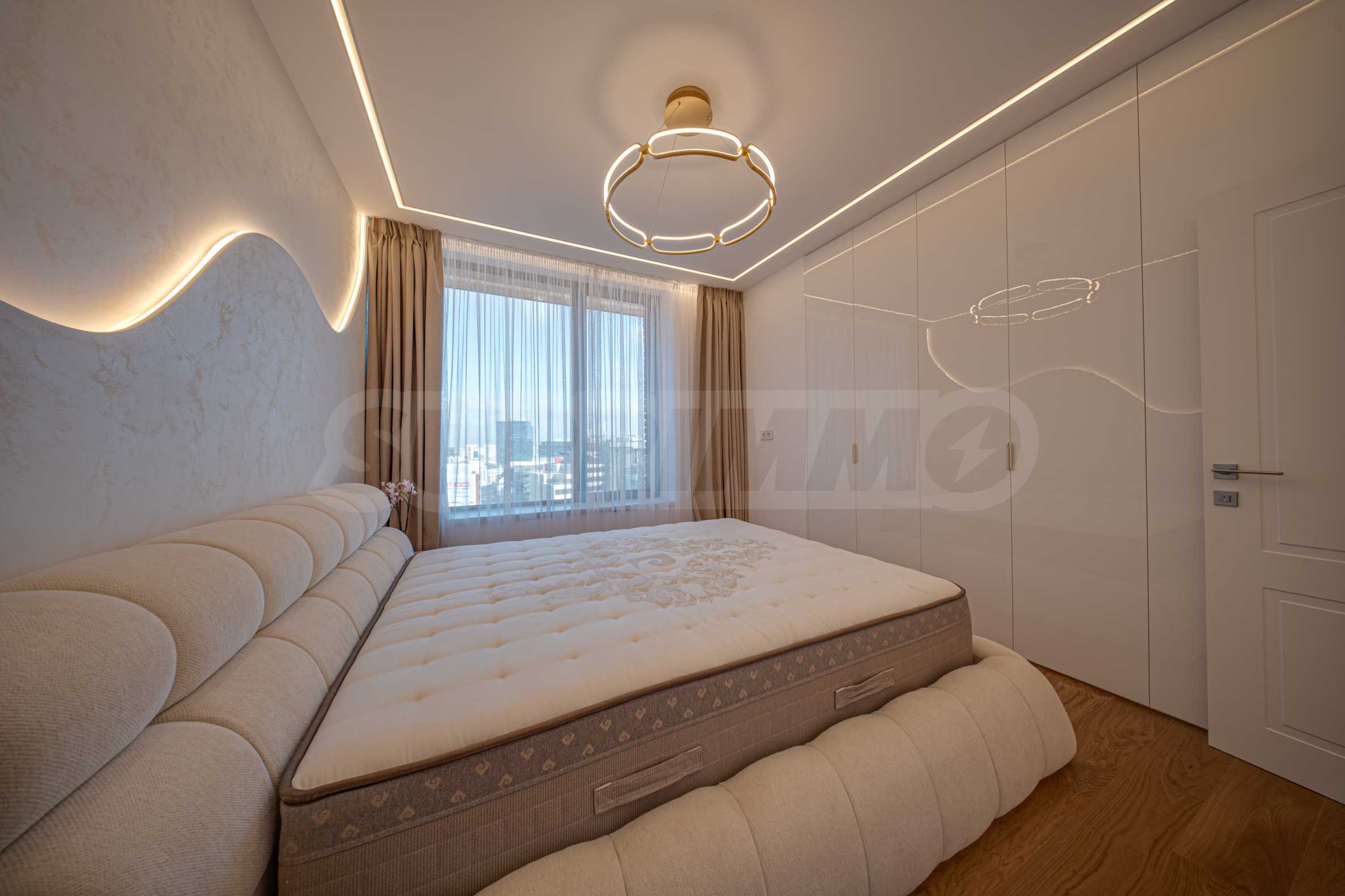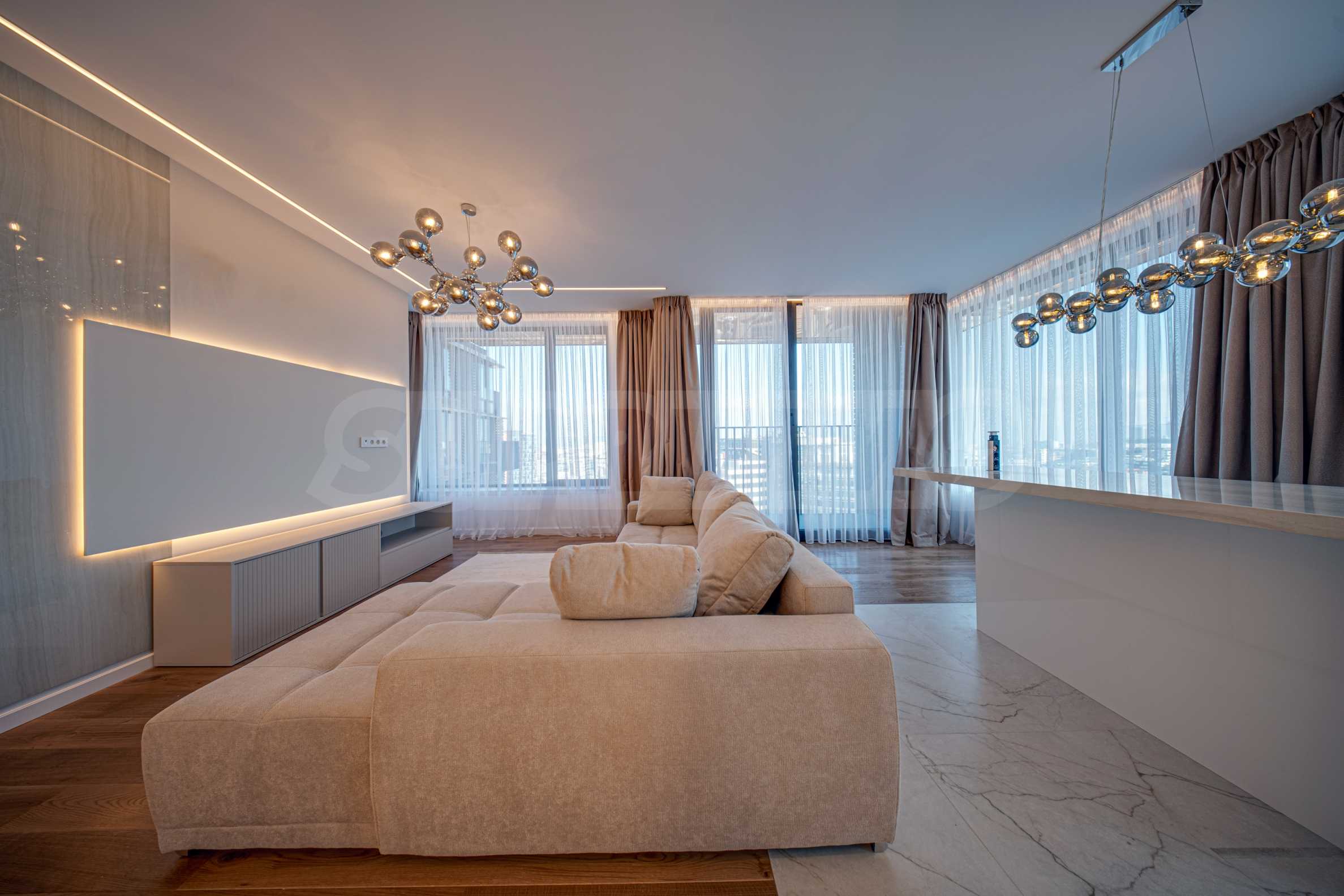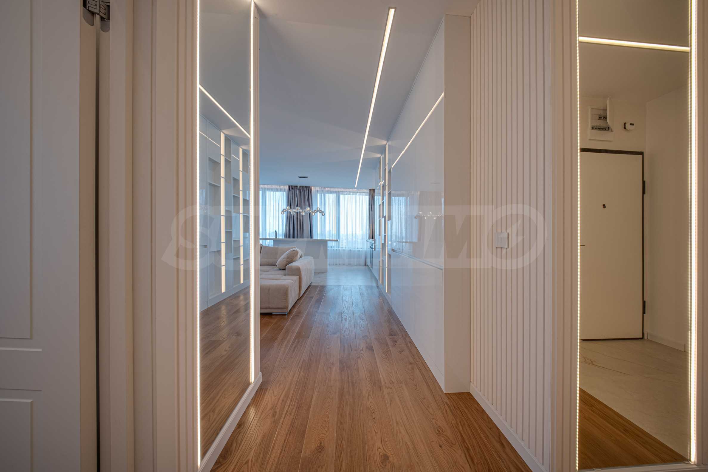 Апартаментът от 96 кв.м е разположен на 10-ти етаж, с панорамни гледки към града и Витоша. Имотът е светъл, предлага модерна дизайнерска визия и интериор с изчистени линии. Големите прозорци допринасят за простор и изобилие на светлина, а качествените материали и изискани мебели - за уют и елегантност. Разпределението включва удобно антре, баня с тоалетна, комфортна спалня, просторна дневна с кухня и трапезария, тераса.