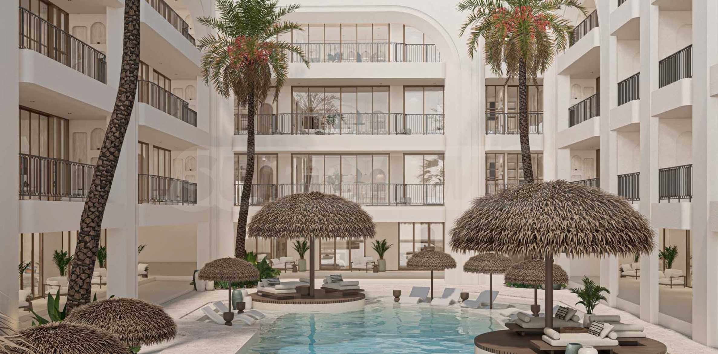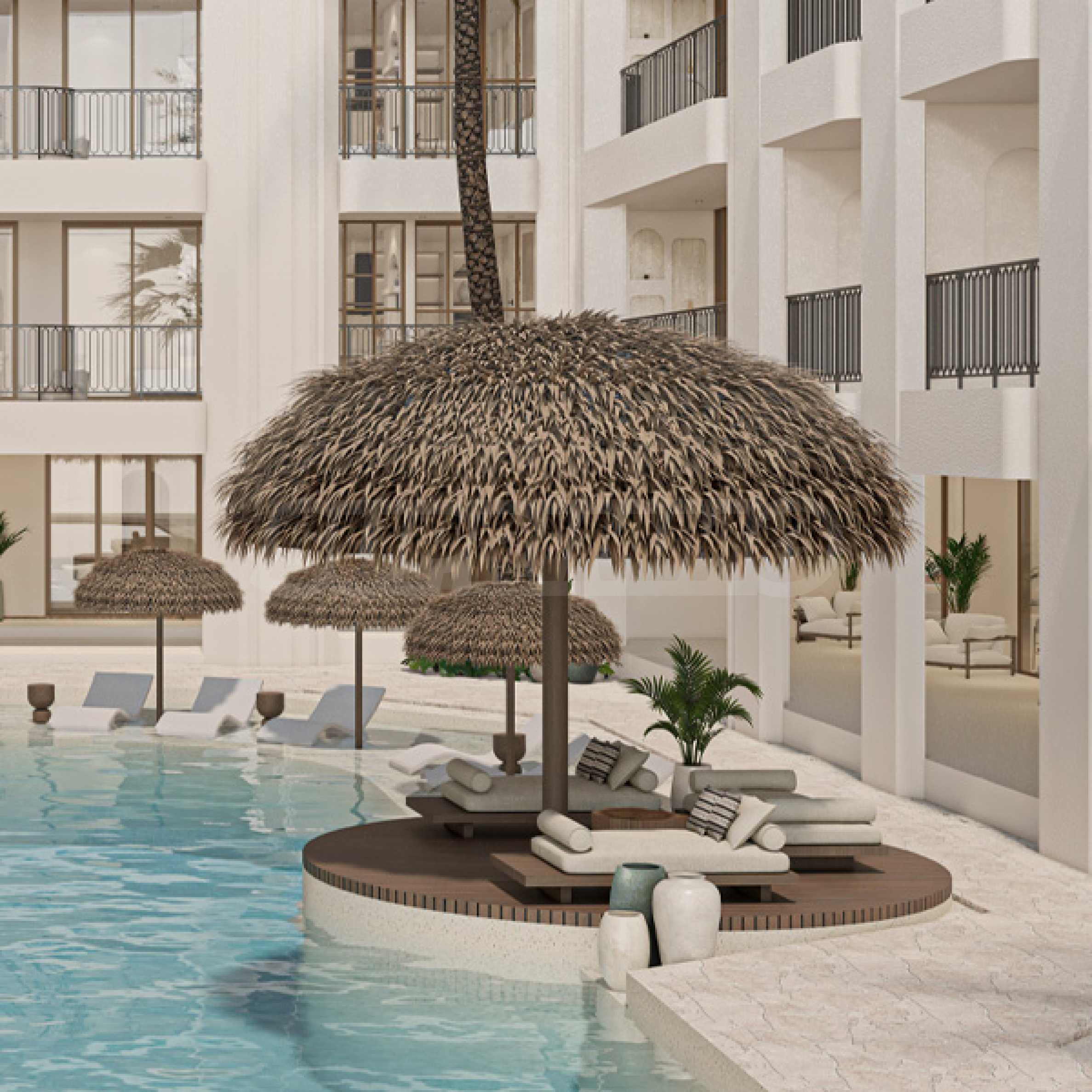 Комплексът предлага лимитиран брой двустайни апартаменти с площ от 40 кв.м, проектирани с мисъл за комфорт и функционалност. Разпределението включва уютна дневна с кухненски кът и барплот, отделена спалня и просторна слънчева тераса, на която е разположен личен басейн за удоволствие и релакс на жителите.