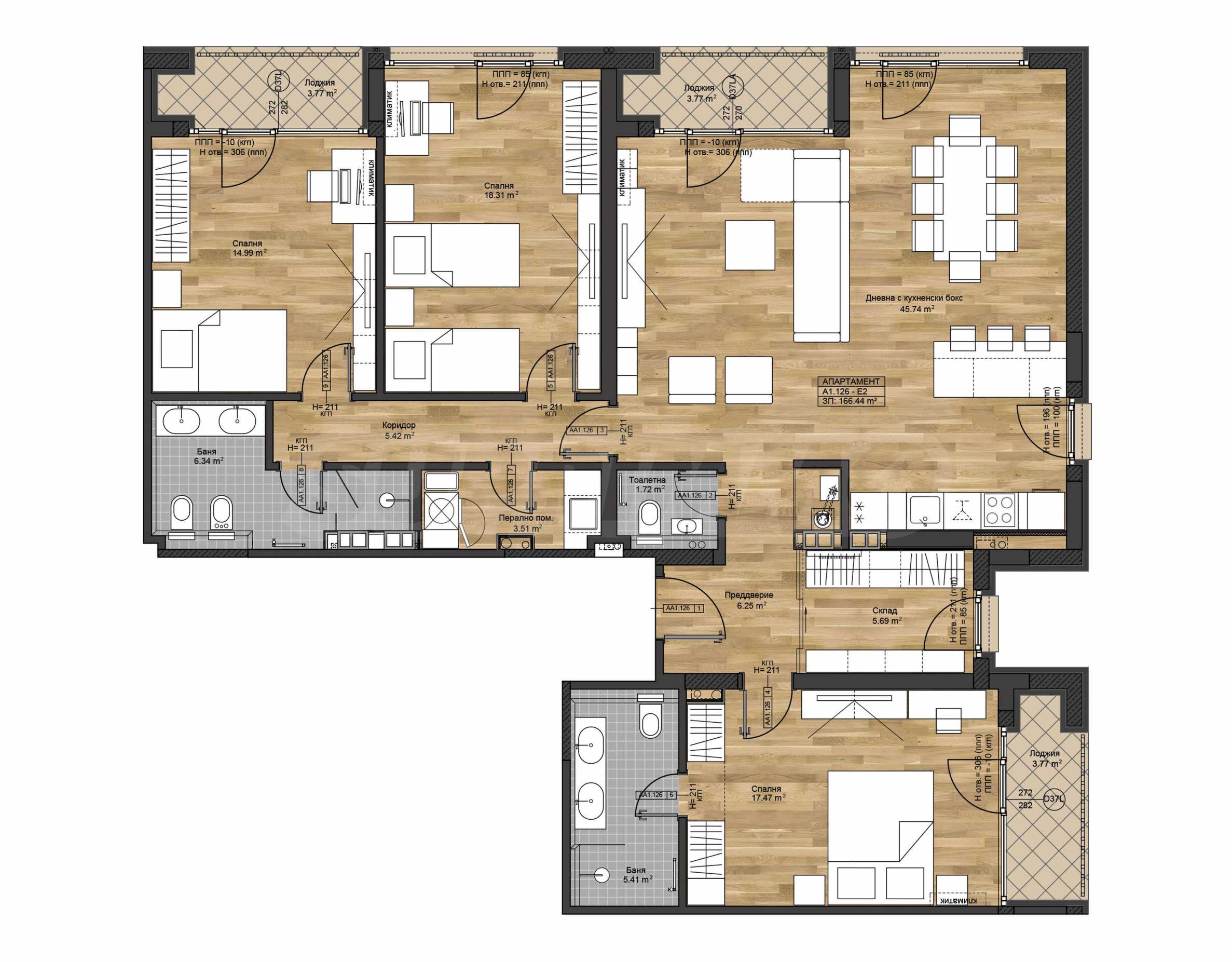 Апартаментът се намира на 2-ри етаж и има обща площ от 212.6 кв.м, 166.44 кв.м - чиста площ. Изложението е югозапад/северозапад.