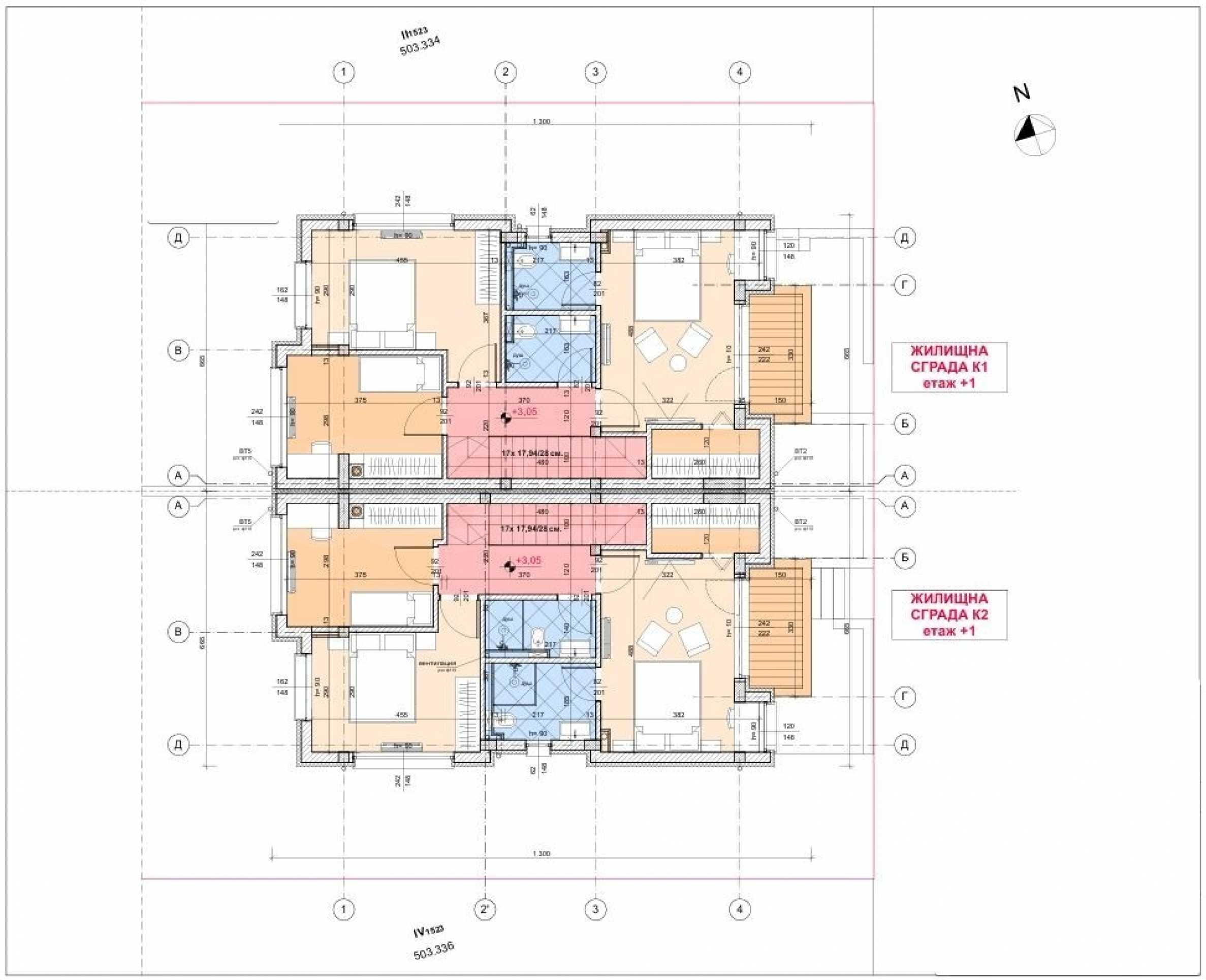 • втори етаж: три спални, два санитарни възела, дрешник и балкон.