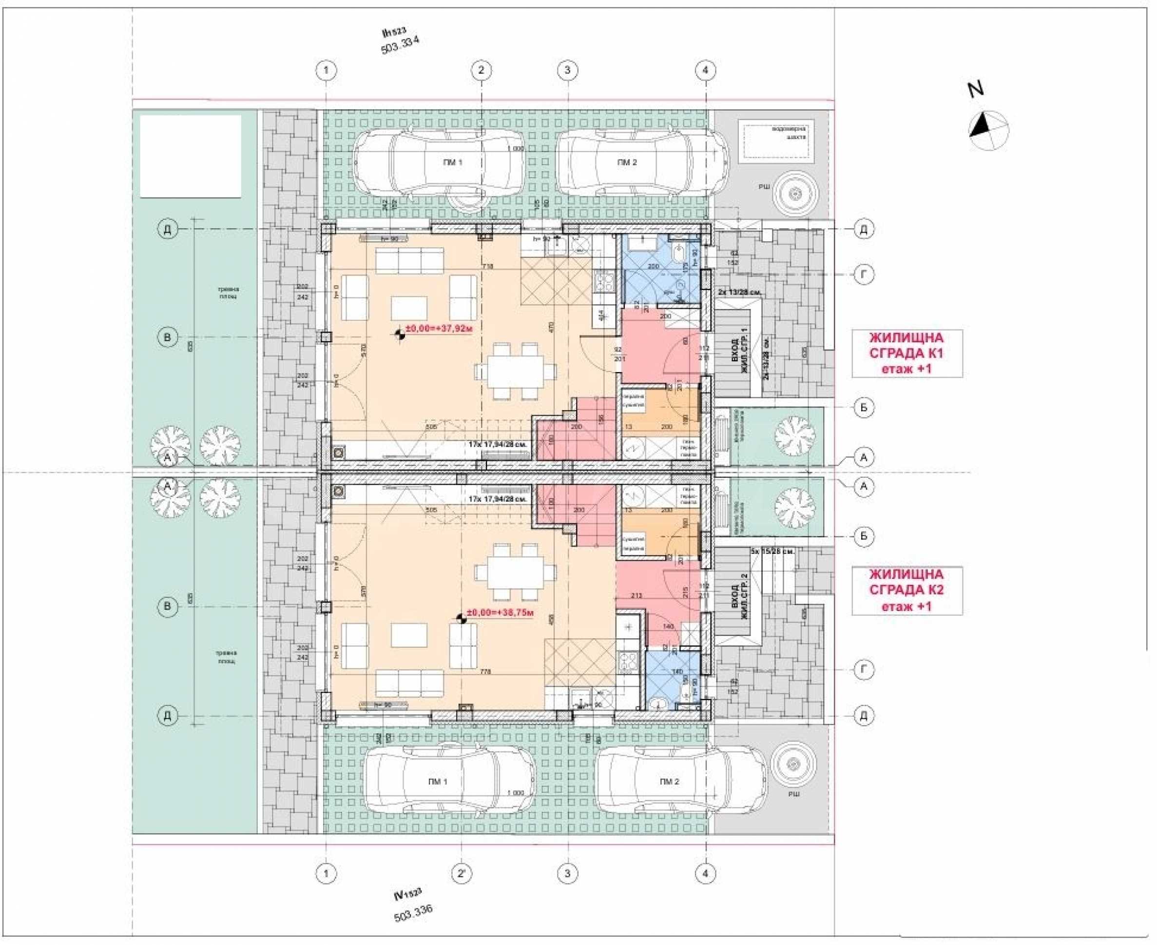 • първи етаж: антре/коридор, просторна дневна с кухня, мокро помещение и санитарен възел;