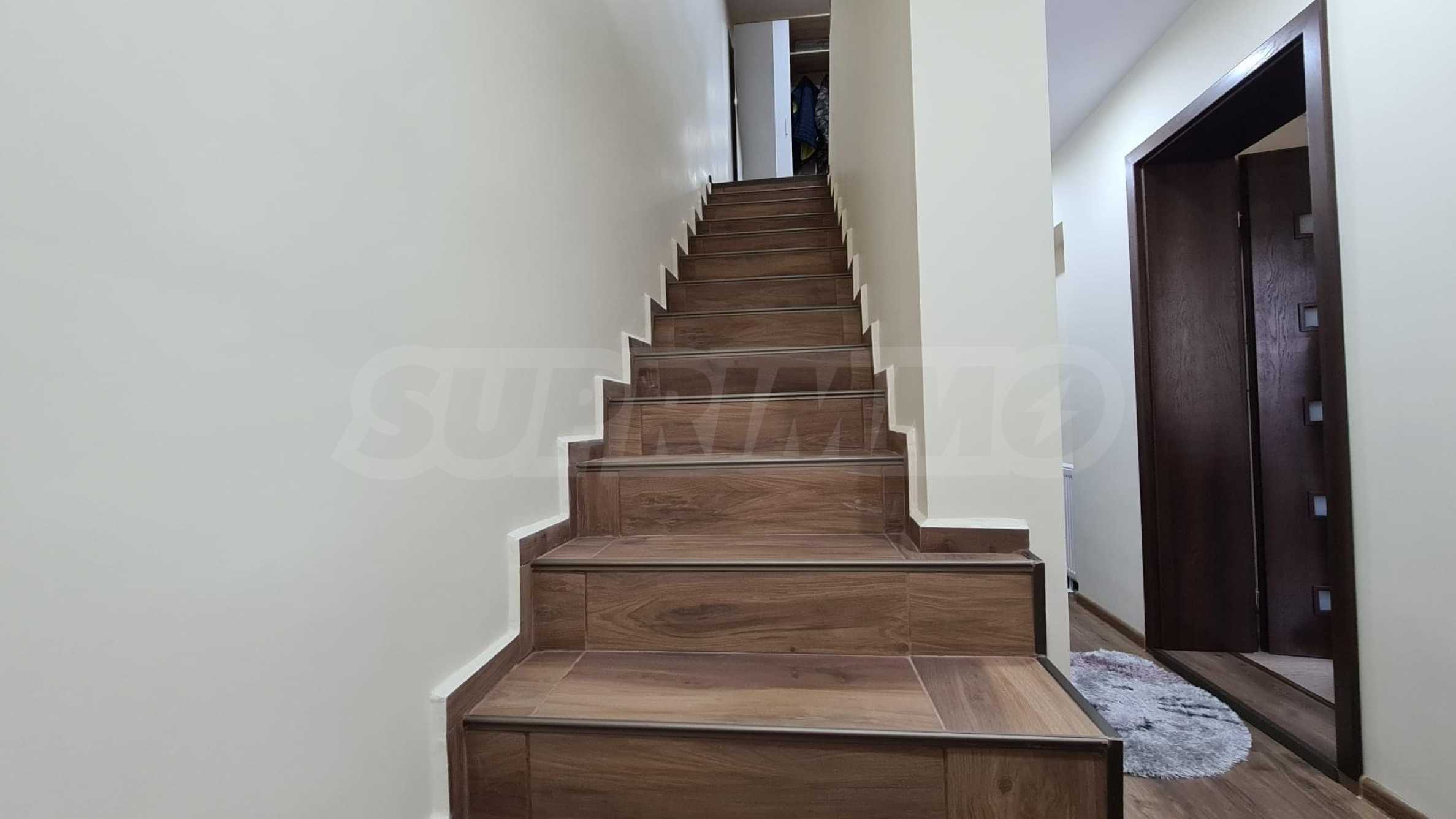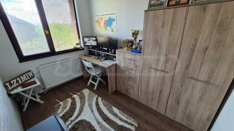 На първия етаж са разположени кухненски бокс с трапезария, дневна, баня с тоалетна и сервизно помещение. Този етаж е проектиран с оглед на практичност и удобство при ежедневна употреба. Вторият етаж включва две спални и кабинет, който може да бъде адаптиран като допълнителна спалня, в зависимост от нуждите на новите собственици.