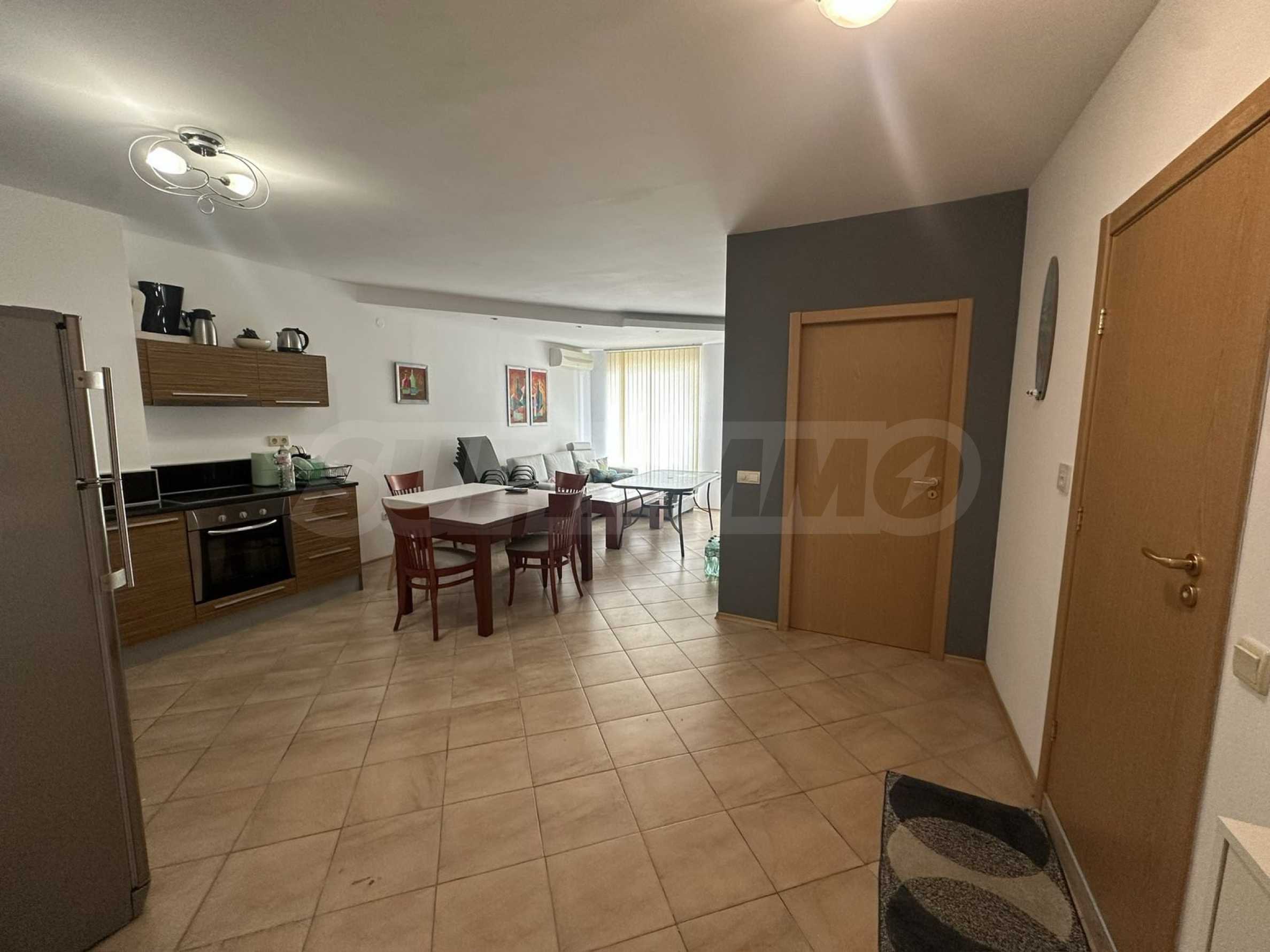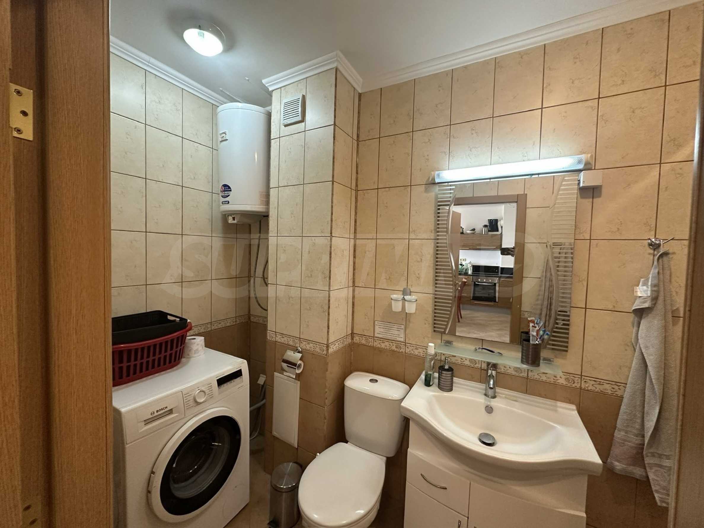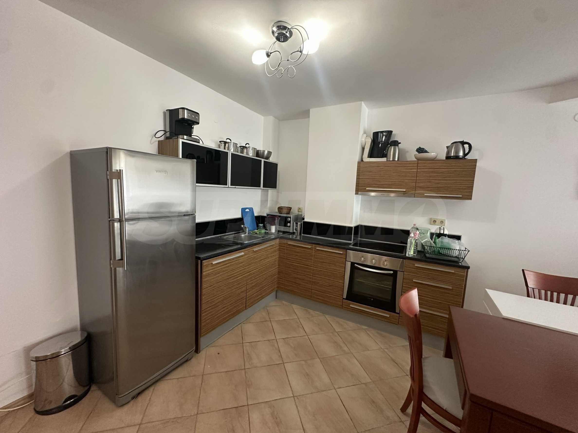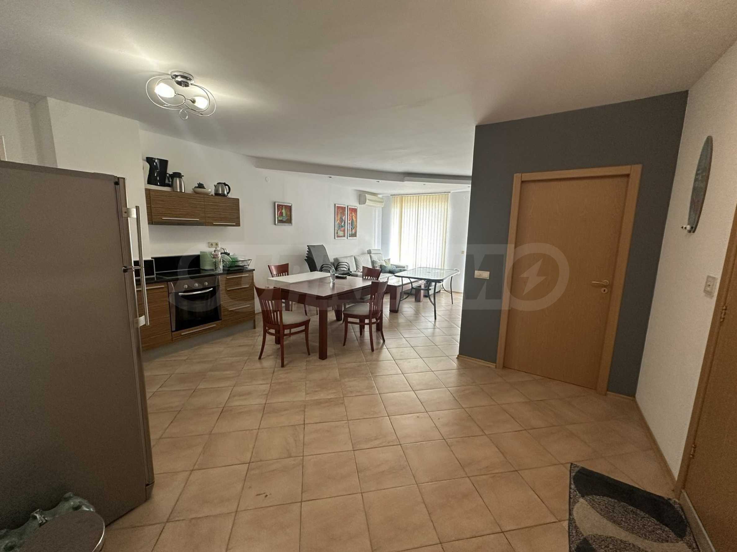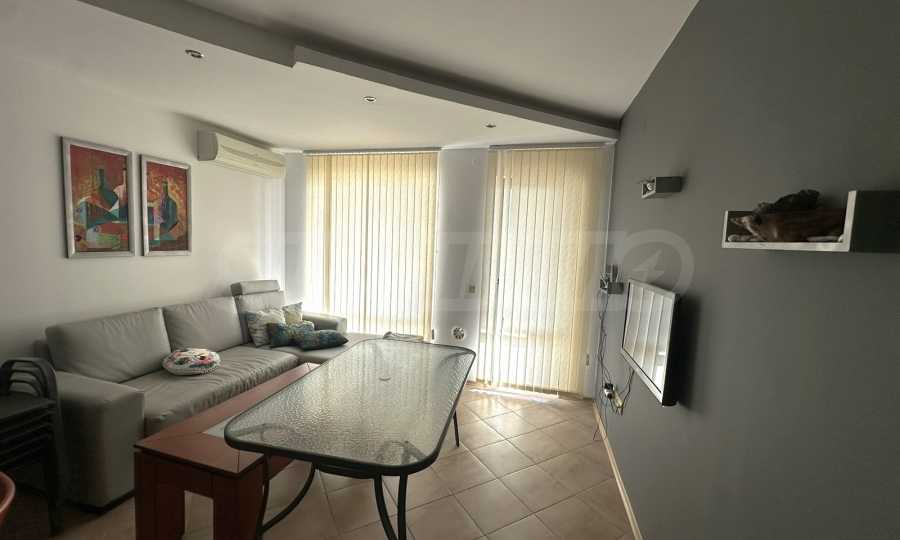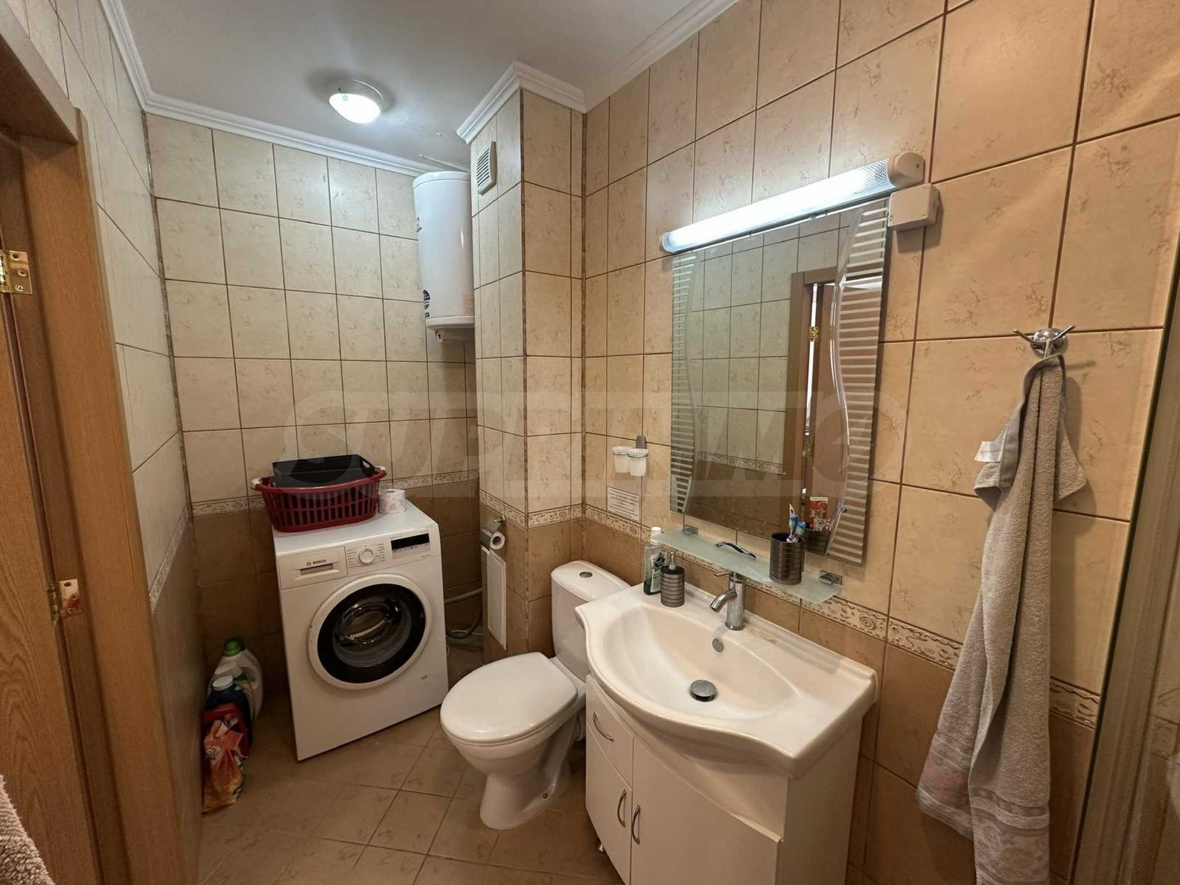 Апартаментът е напълно обзаведен и оборудван с всичко необходимо за живеене като мебели и ел. уреди, готов за ползване или отдаване под наем.