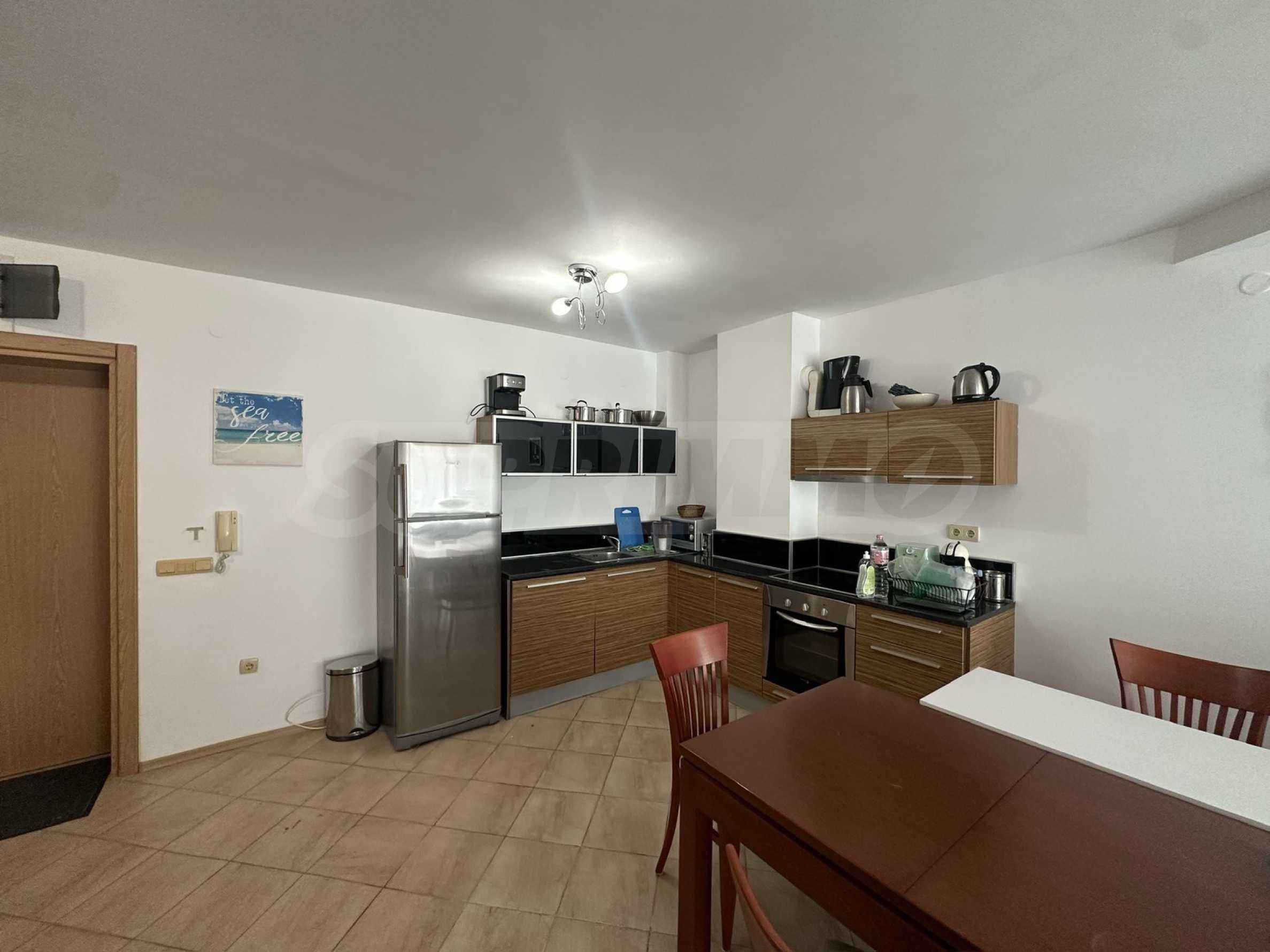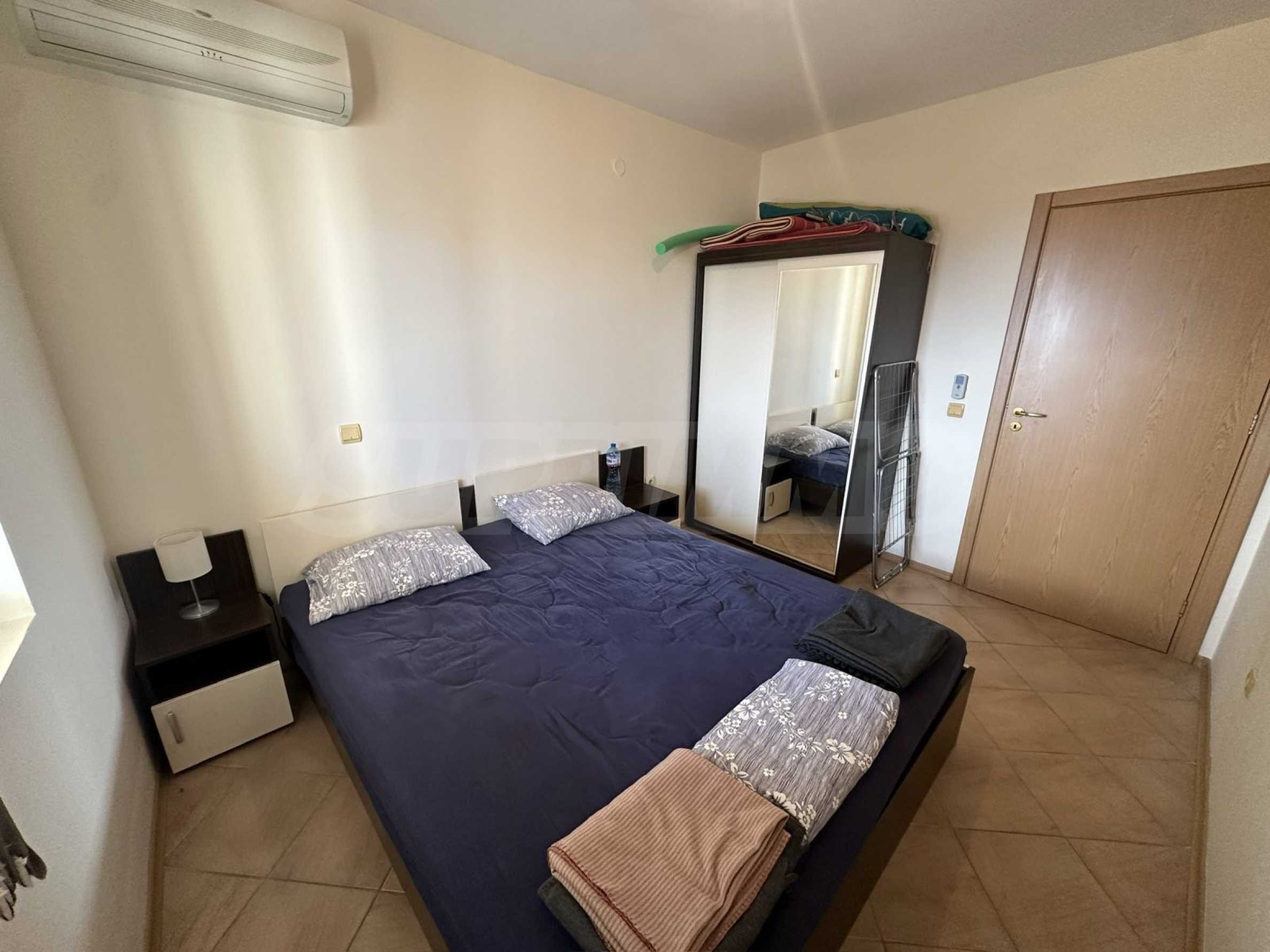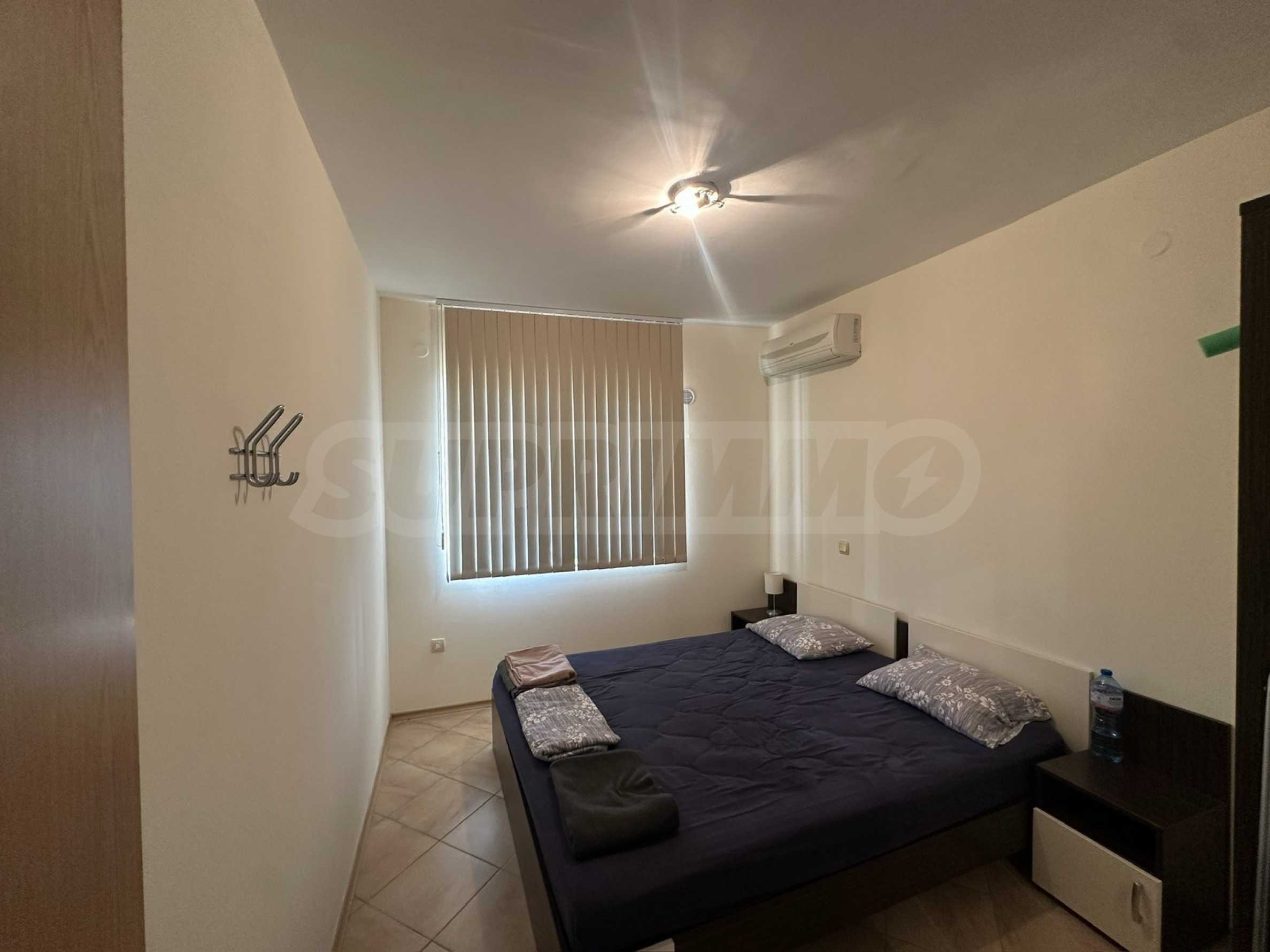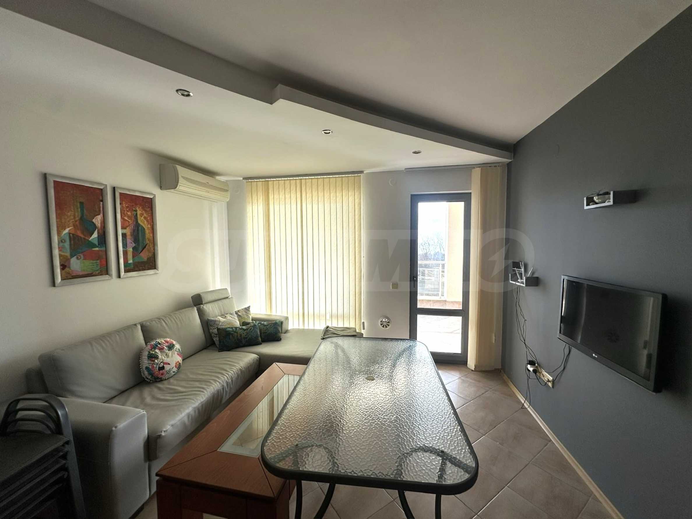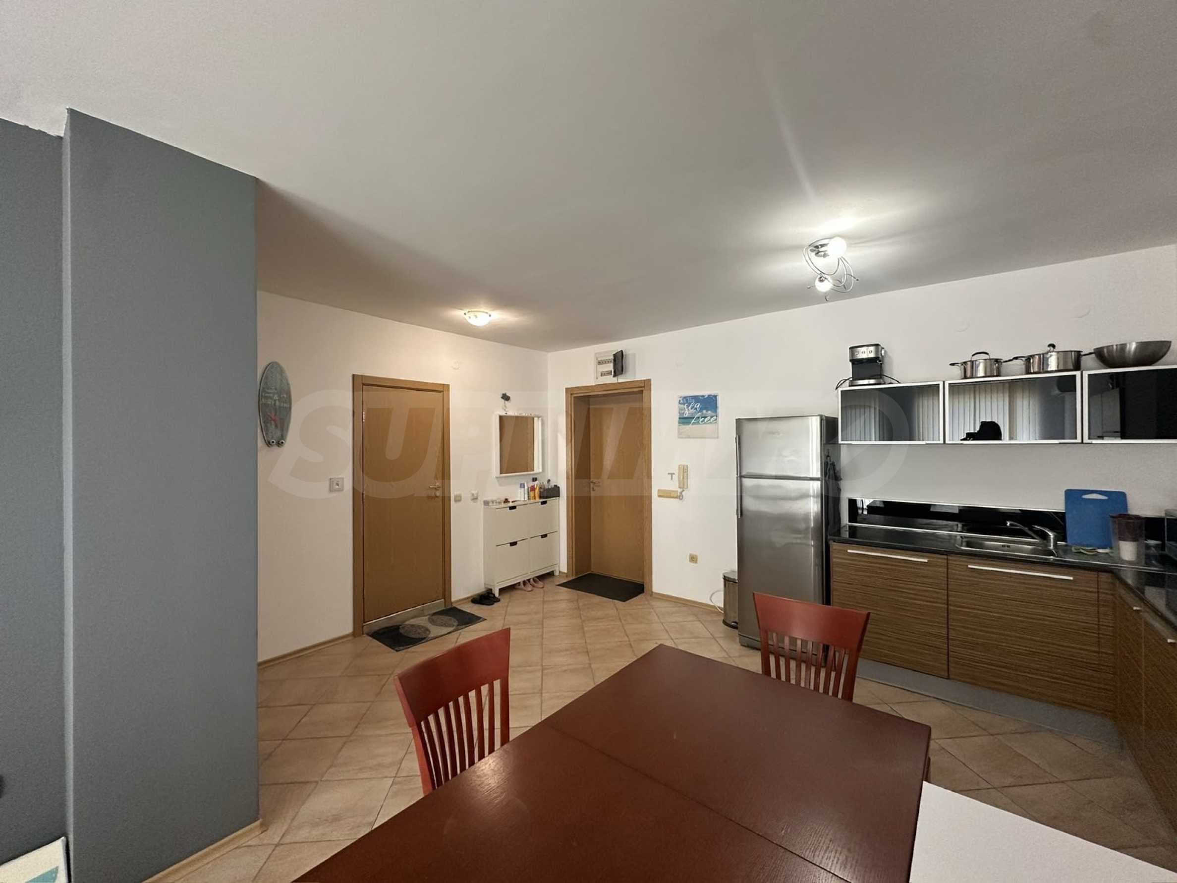 Апартаментът е напълно обзаведен и оборудван с всичко необходимо за живеене като мебели и ел. уреди, готов за ползване или отдаване под наем.