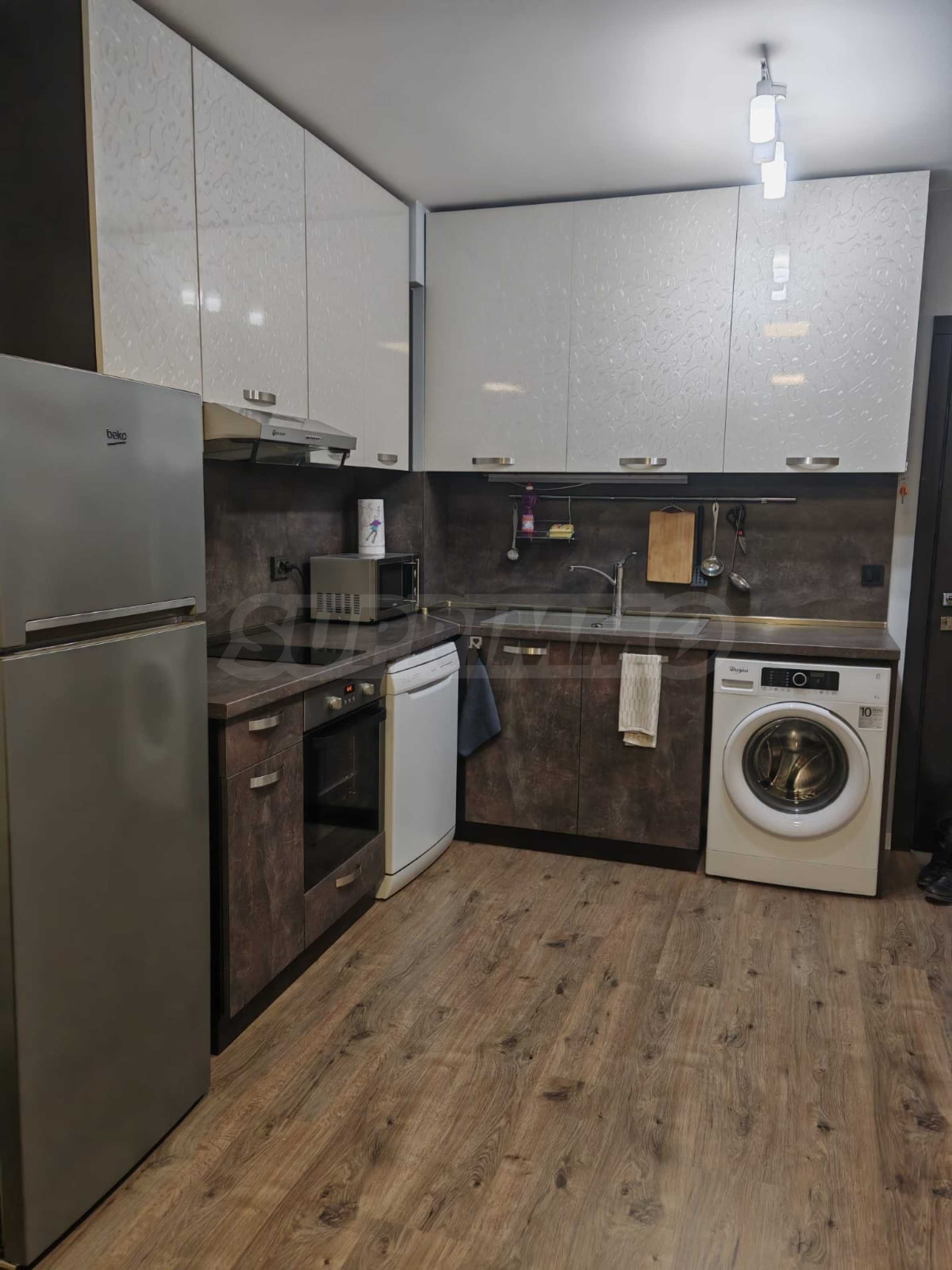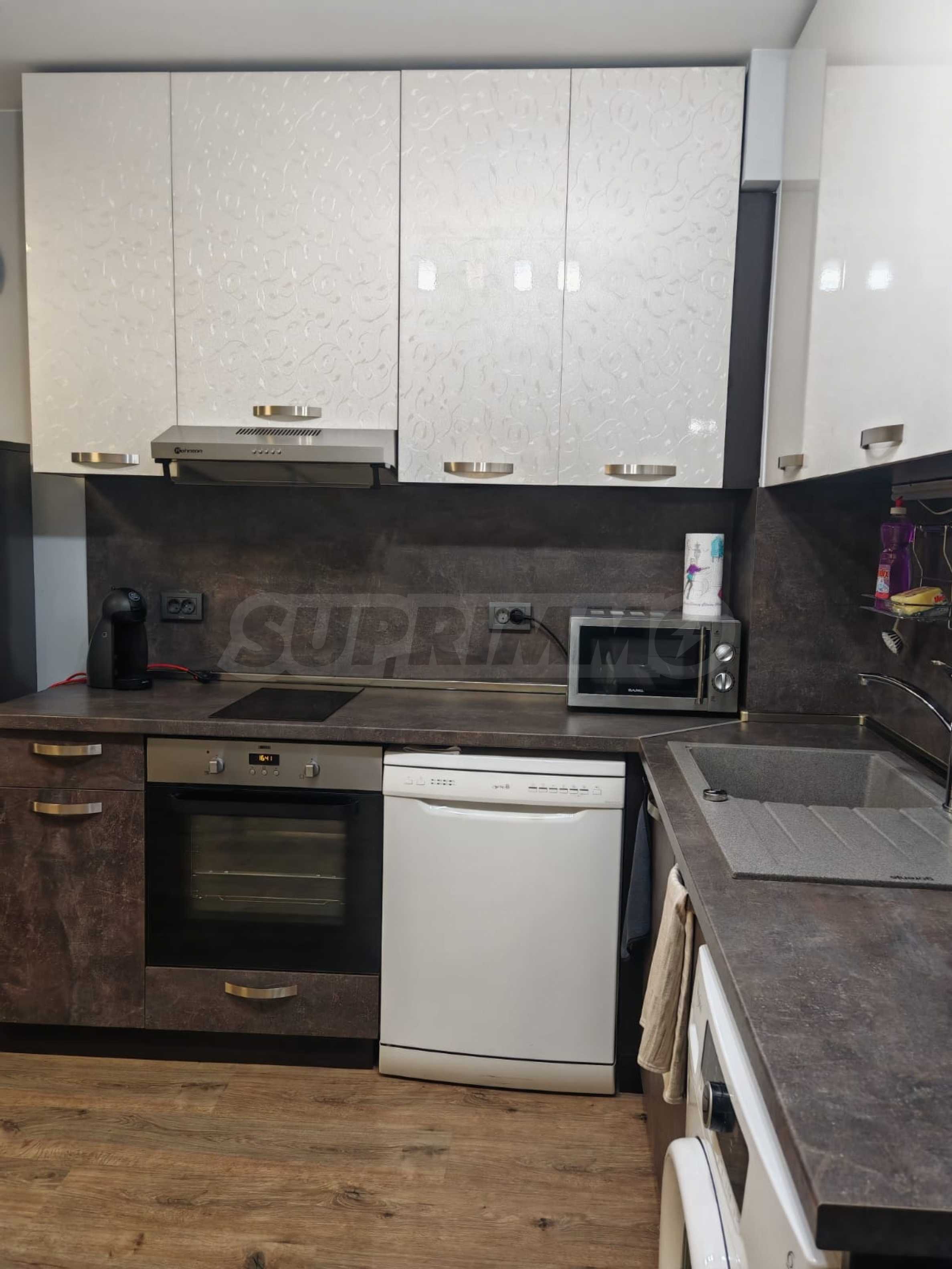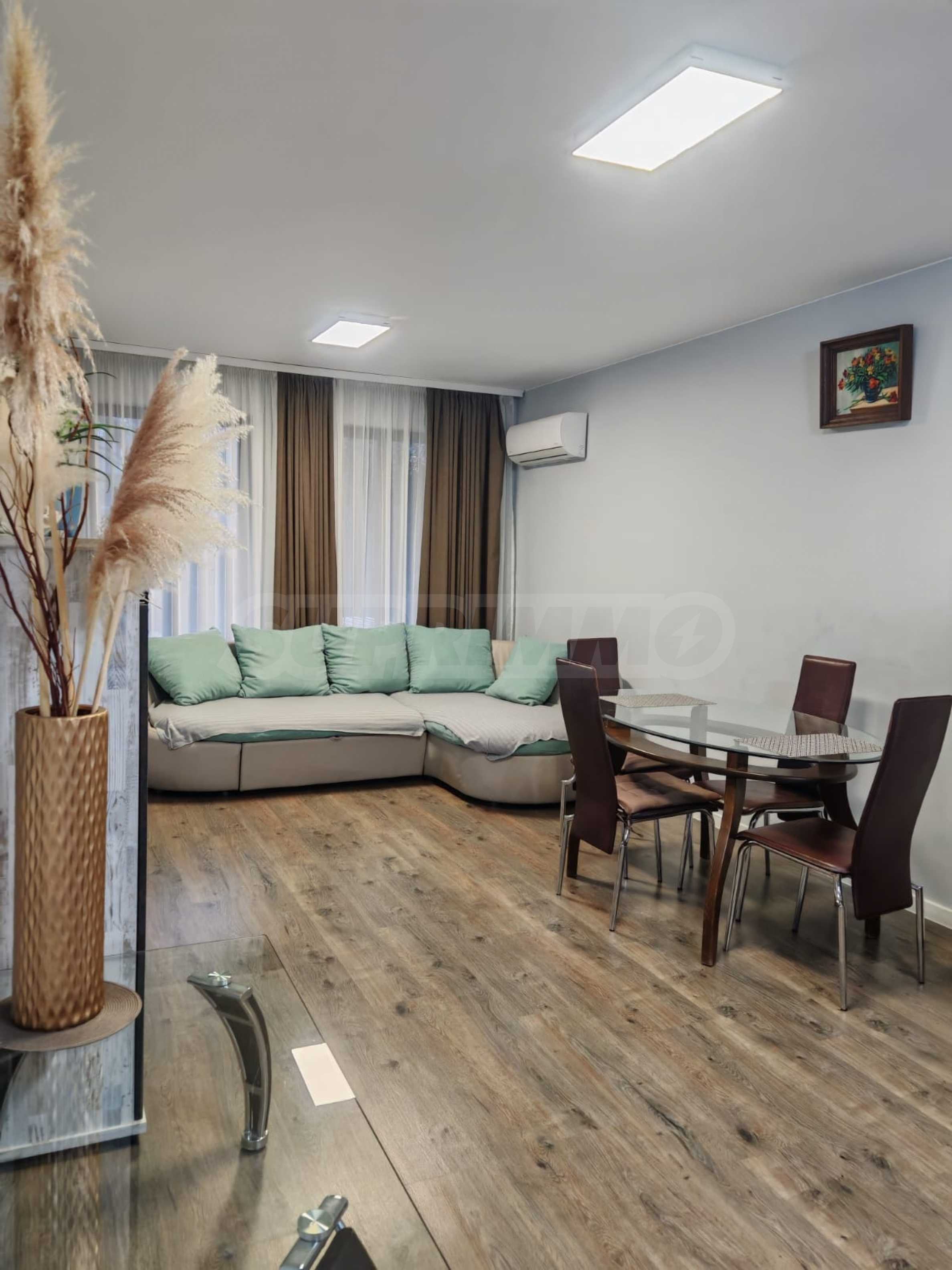 Жилището е напълно обзаведено и оборудвано, предлага се с всичко необходимо за живеене като мебели и ел. уреди, има климатици.