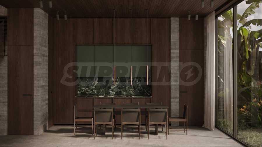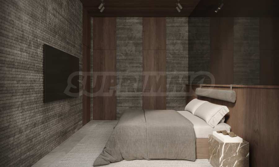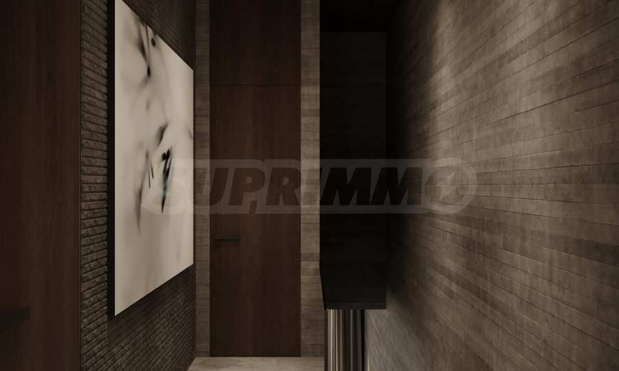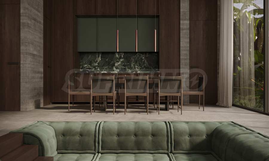 Естествените материали са водещ елемент в дизайна – подове от тиково дърво, тавани, врати и акценти от масивна дървесина, както и декоративни стени от мрамор и травертин с прецизно изрязани мотиви.