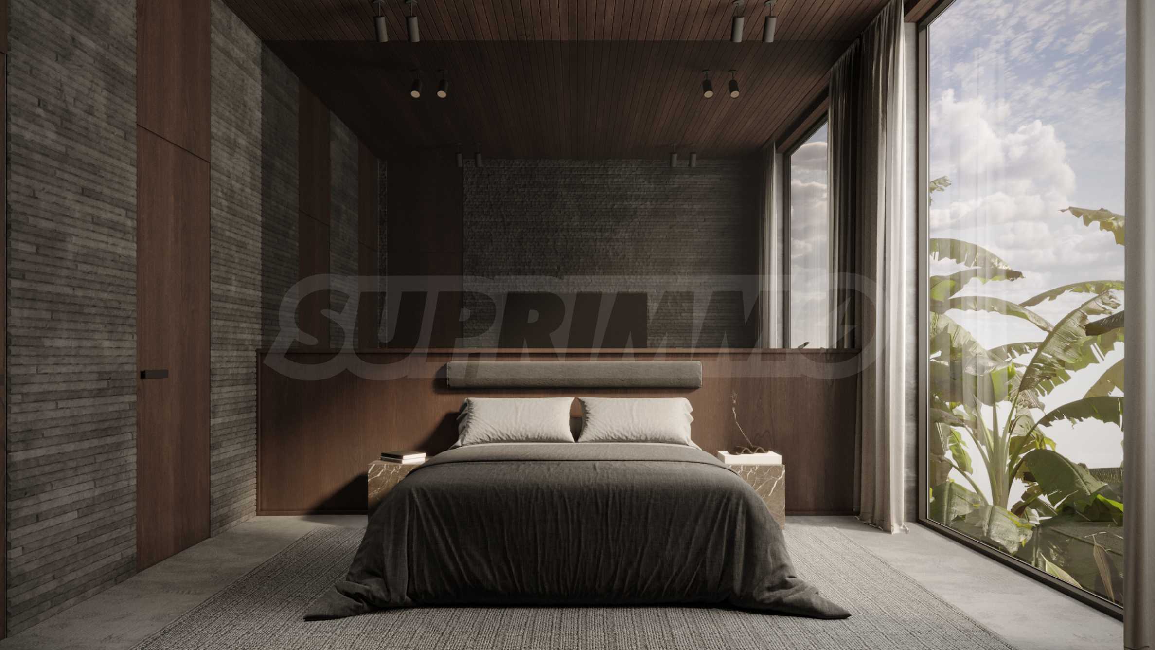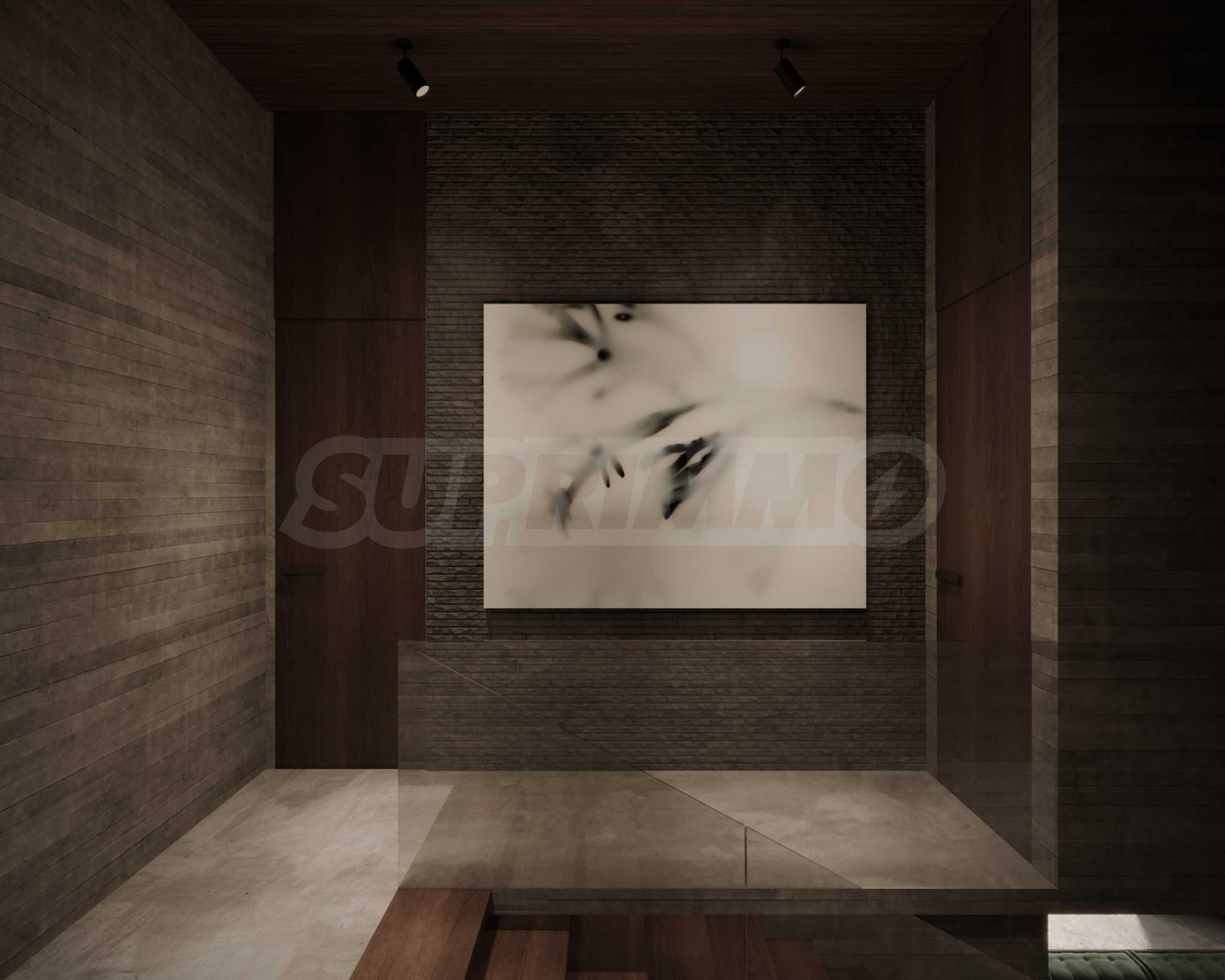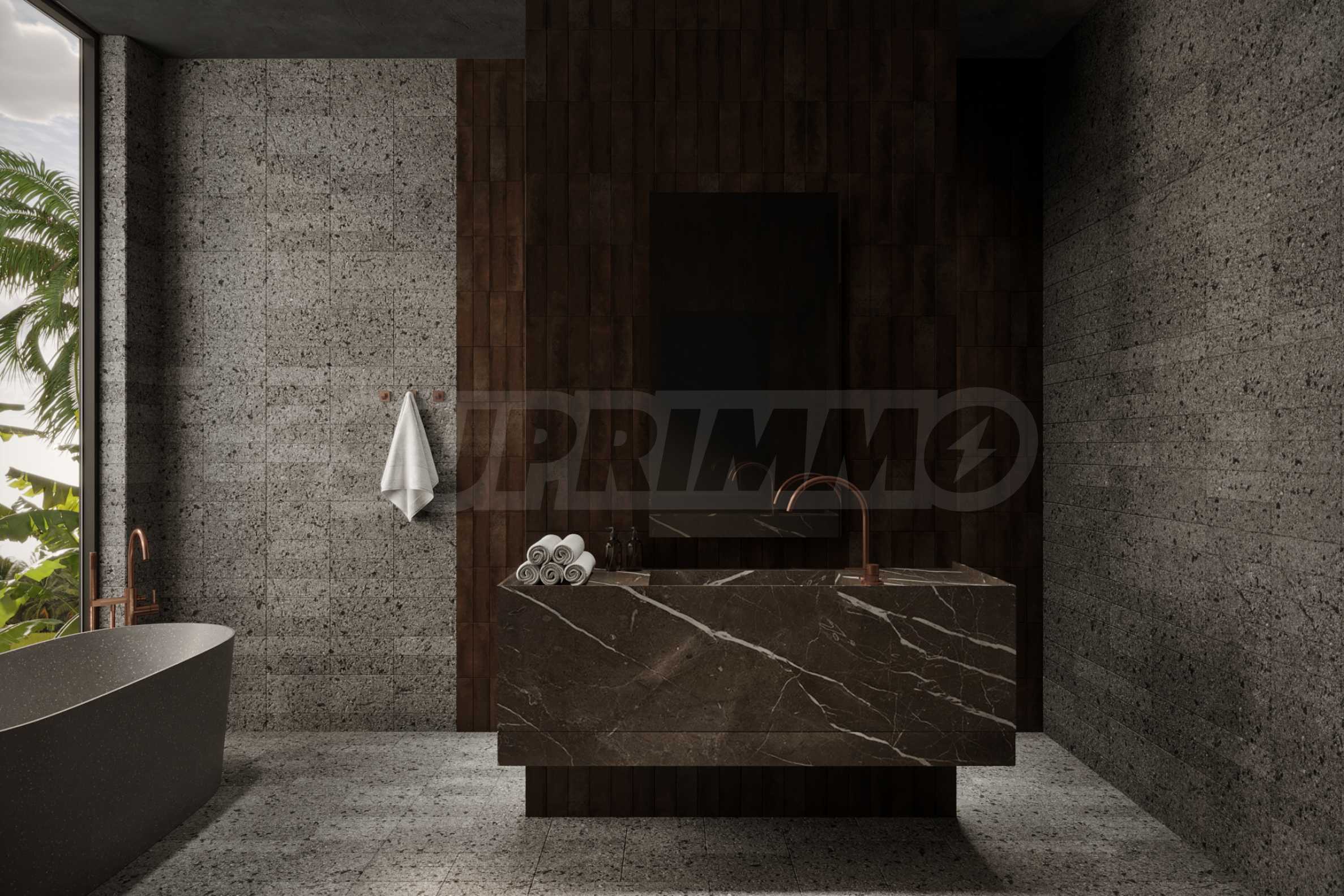 Естествените материали са водещ елемент в дизайна – подове от тиково дърво, тавани, врати и акценти от масивна дървесина, както и декоративни стени от мрамор и травертин с прецизно изрязани мотиви.