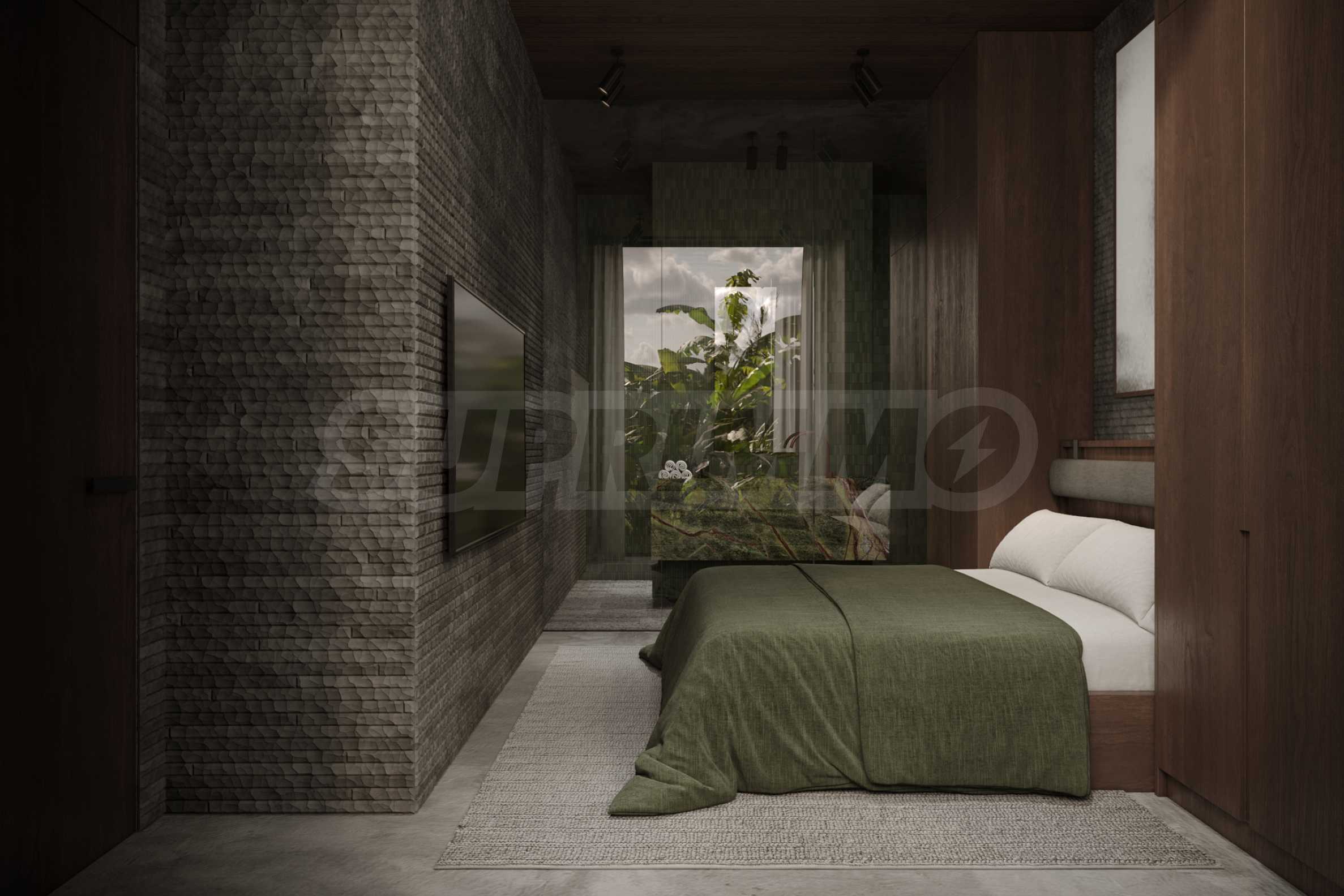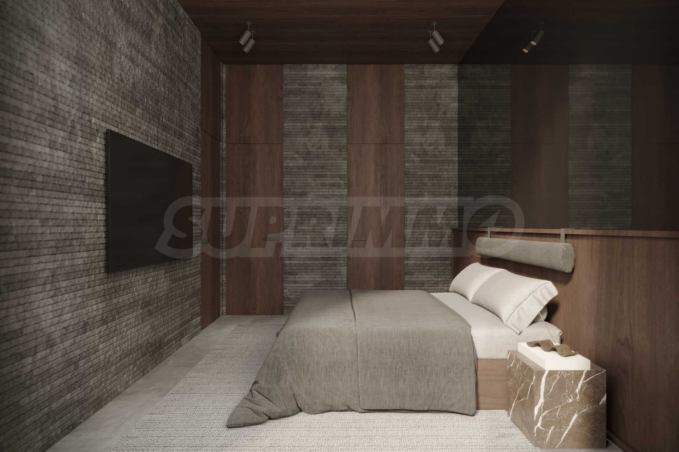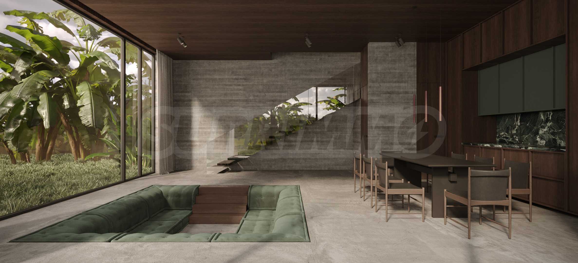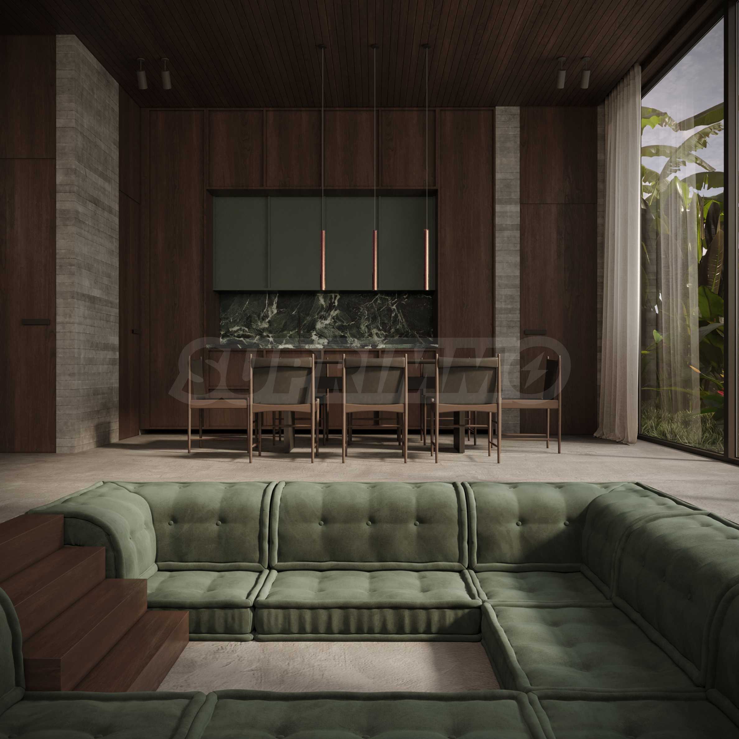 Естествените материали са водещ елемент в дизайна – подове от тиково дърво, тавани, врати и акценти от масивна дървесина, както и декоративни стени от мрамор и травертин с прецизно изрязани мотиви.