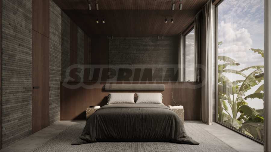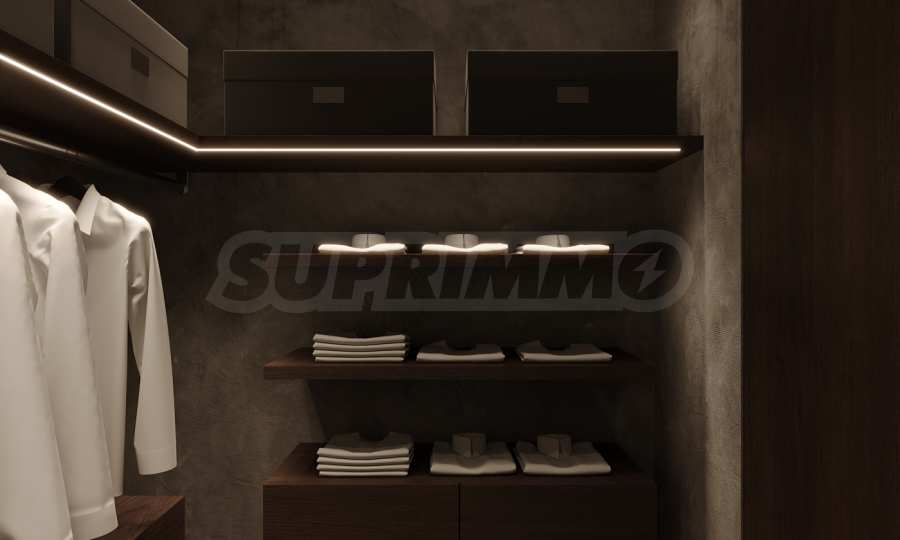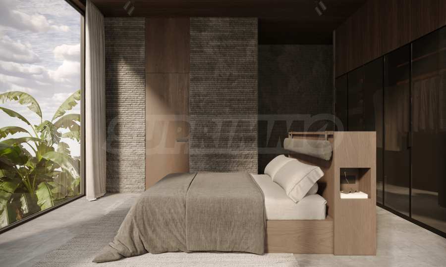 Интериорът е допълнен от специално изработени мебели и шкафове, занаятчийска мебелировка и кухня от масивен мрамор, оборудвана с висок клас електроуреди. Кухнята и баните са завършени с масивни месингови смесители, а функционалността е подсилена от универсални електрически контакти, микро трак осветление и аналогови ключове, които позволяват прецизен контрол на светлината и атмосферата. Допълнителен комфорт осигурява и съвременна система за филтрация на водата.