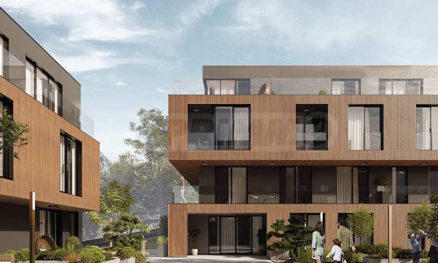• Фасада с композитно дърво и мазилка в цвят антрацит, в унисон с околната среда.