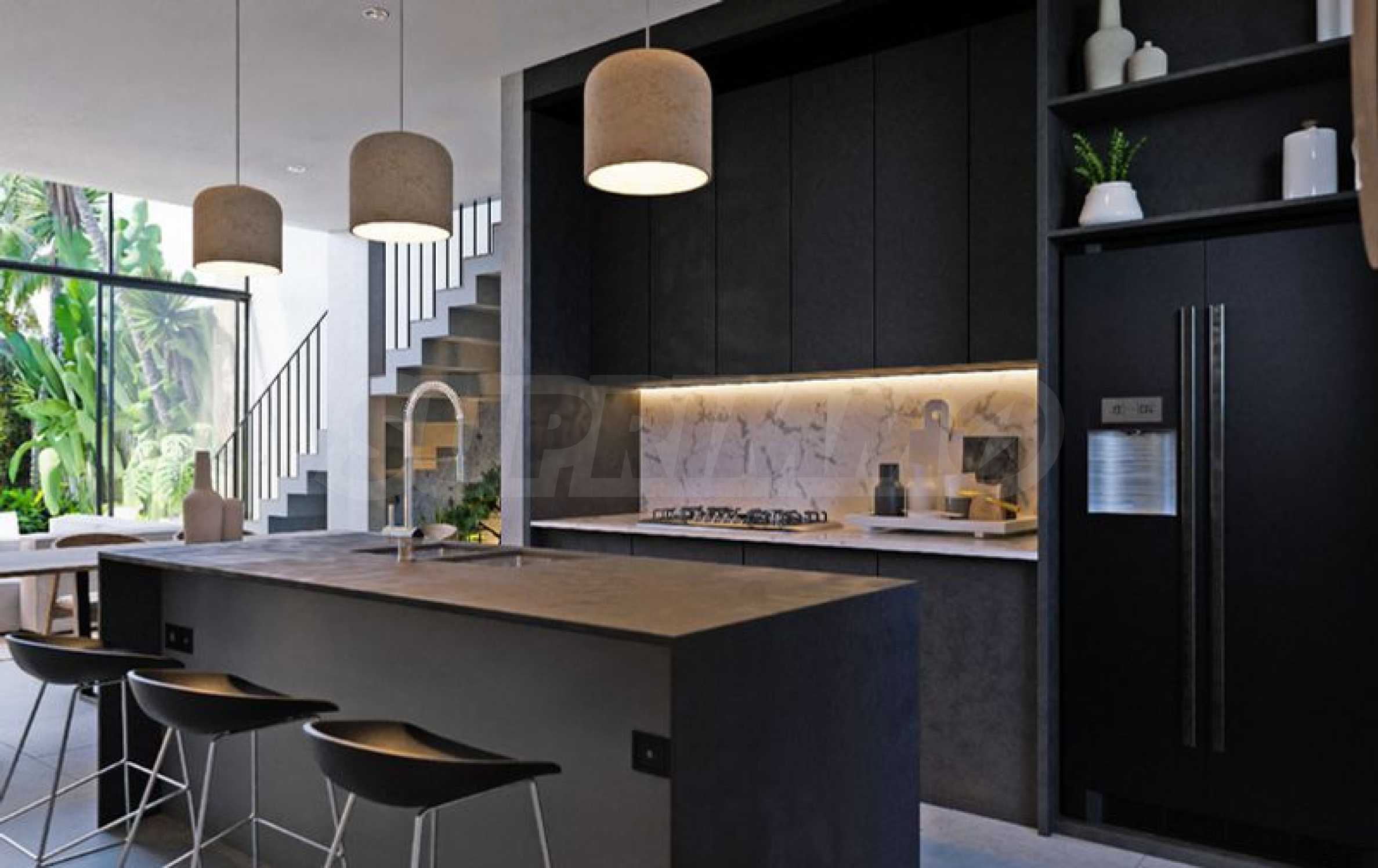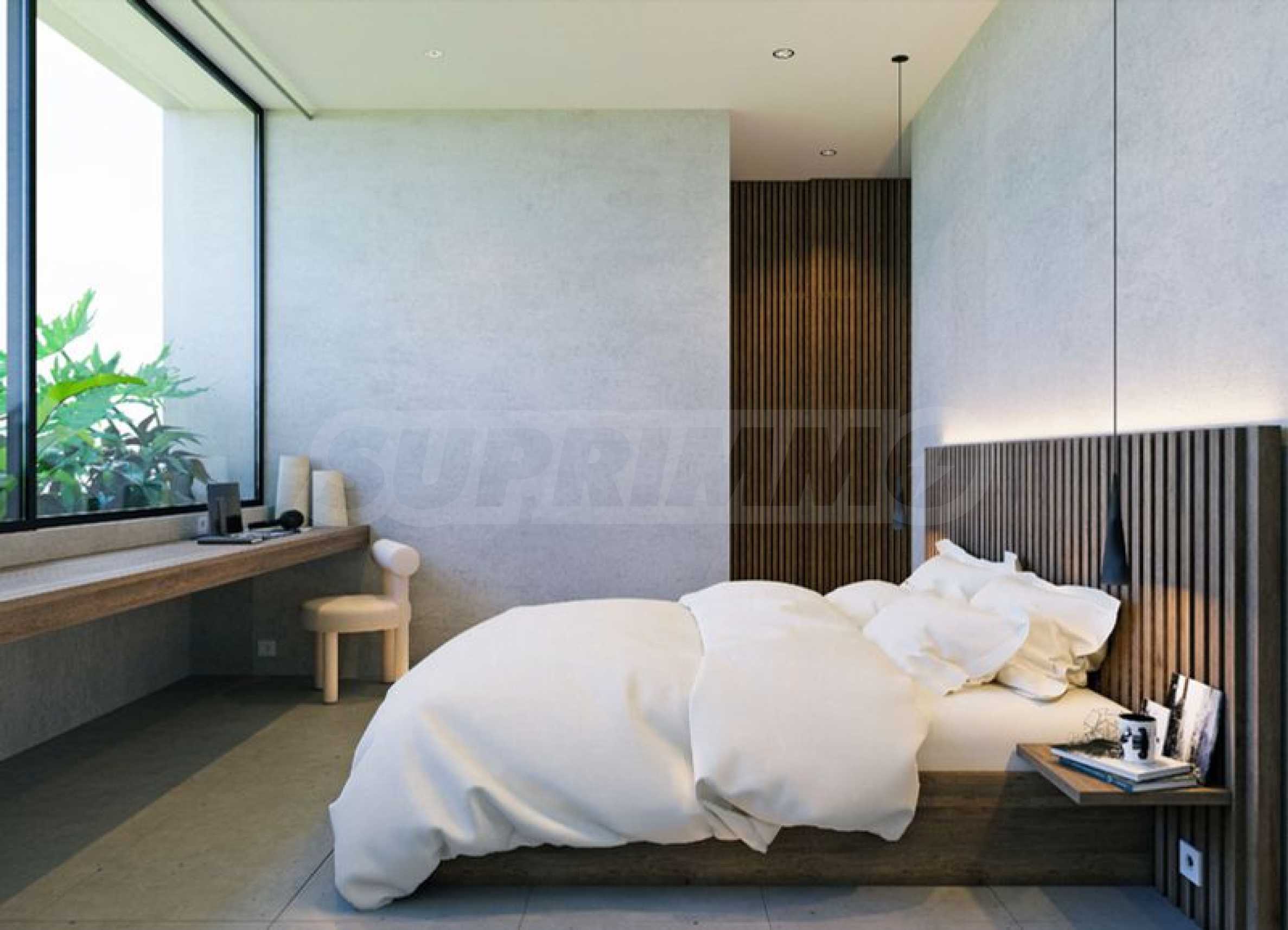 Кухнята е проектирана с отворена концепция и се прелива елегантно във всекидневна, оформяйки обединени пространства за споделени моменти със семейство и приятели. В интериора са заложени висококачествени материали – мраморни плотове, шкафове с матирано покритие в изискан въгленов нюанс, както и подови настилки от плочки или паркет, подбрани според функцията на помещението. Всекидневната е обзаведена с комфортна и уютна мека мебел, а спалните разполагат с големи легла и висок клас матраци, гарантиращи пълноценна почивка. Баните са напълно завършени с внимание към детайла, а вградените гардероби са проектирани така, че да осигурят изобилие от пространство за съхранение. За допълнителен комфорт, къщата разполага с пречистена вода и централна климатизация, осигуряваща оптимална среда през всички сезони.