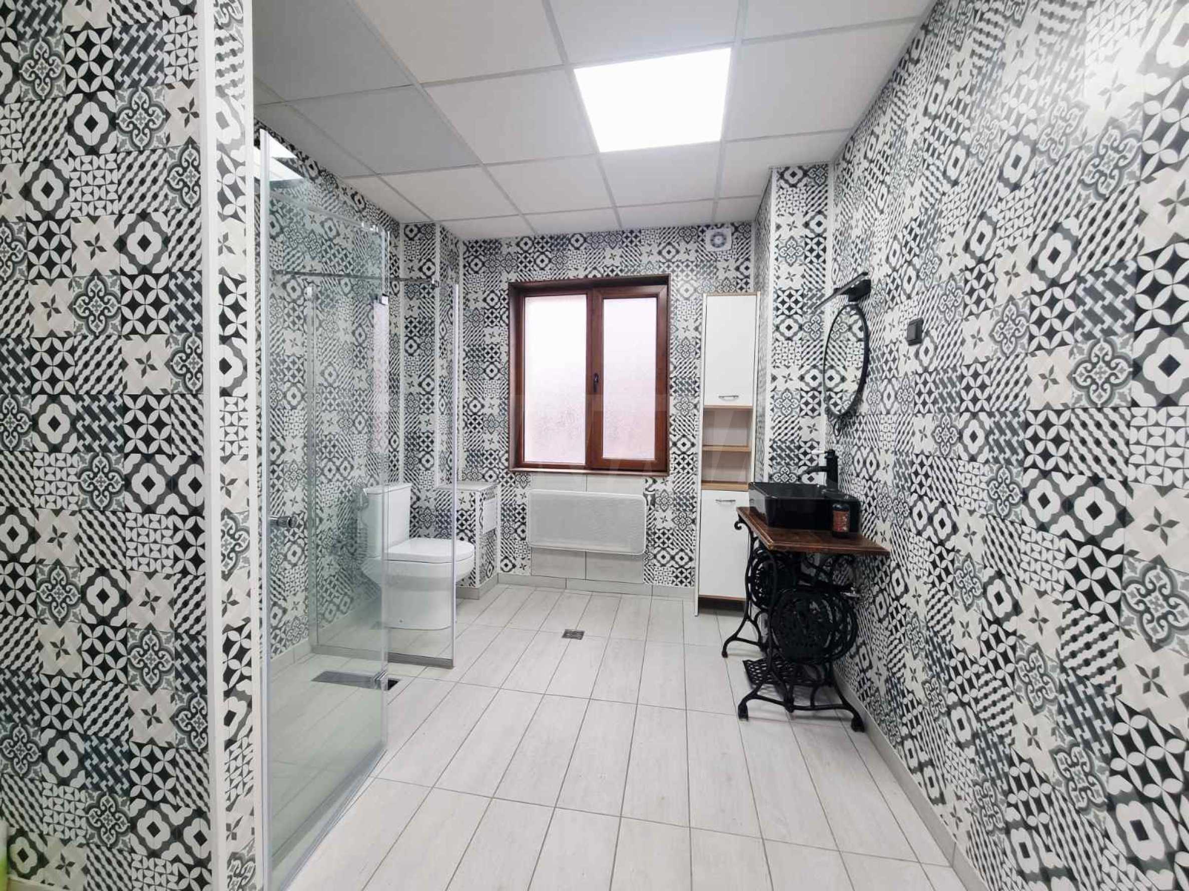 - 1-ви етаж: входно антре, голямо помещение (хол или приемна за офис), оборудвана кухня, баня с тоалетна;