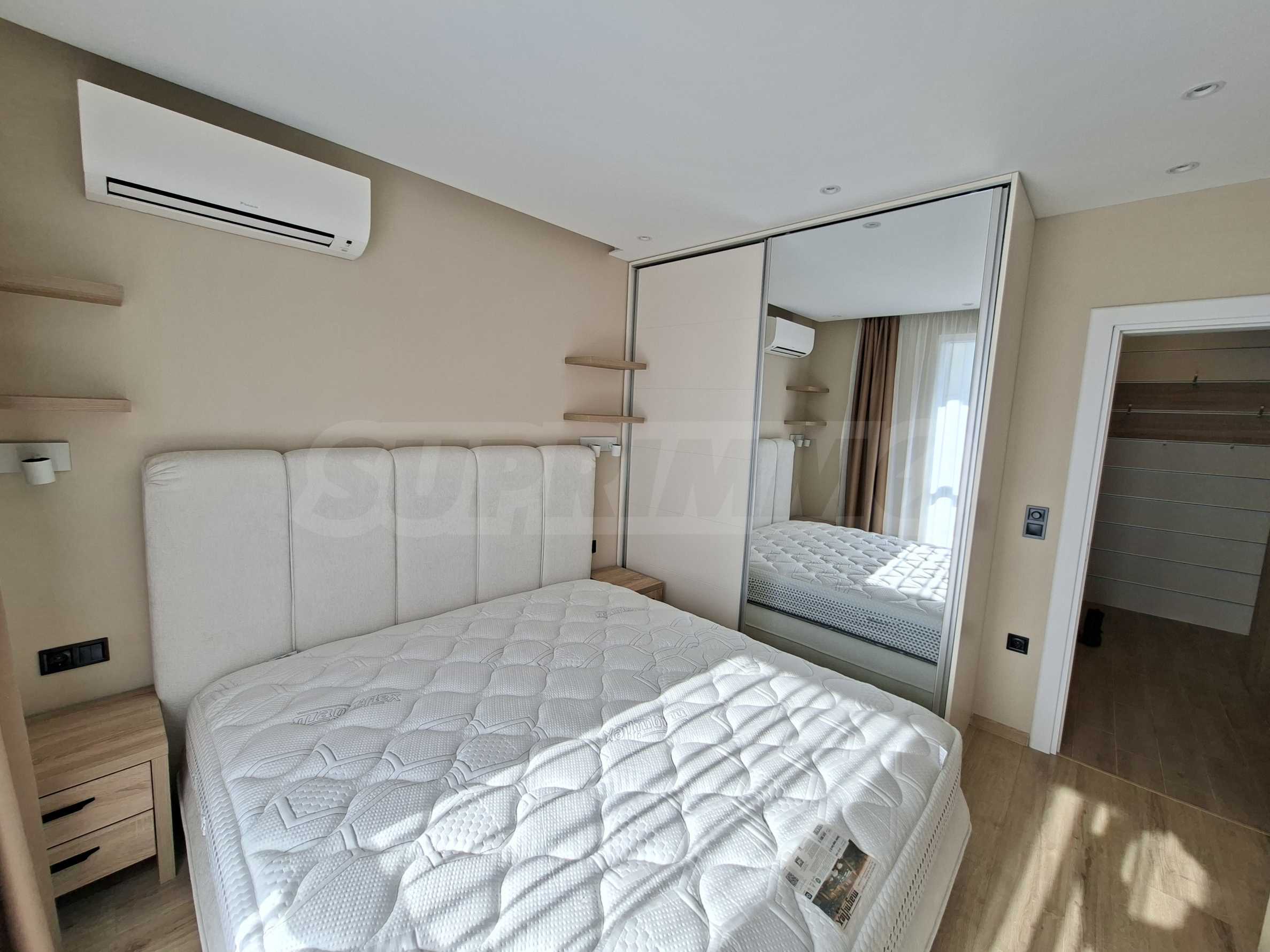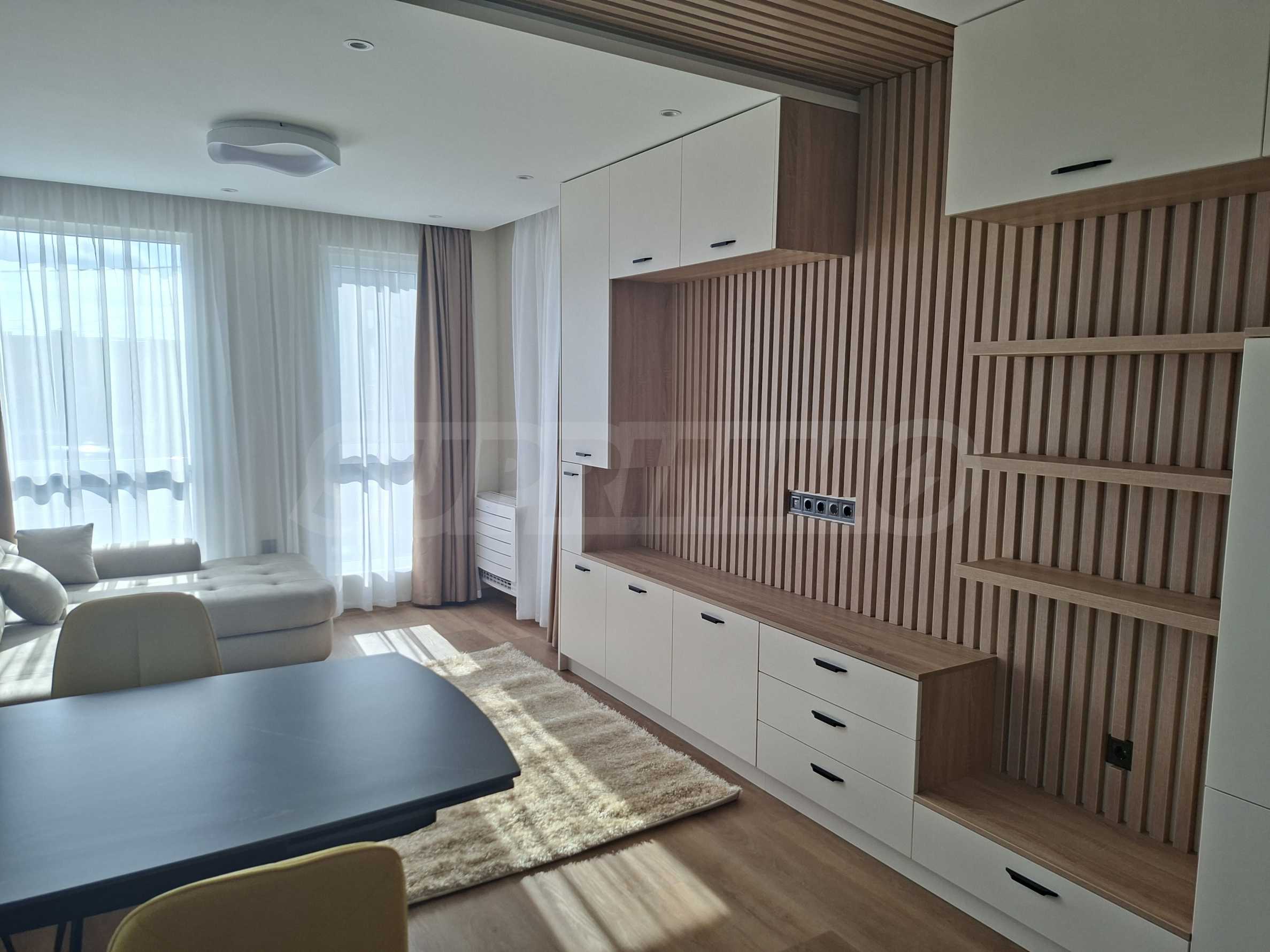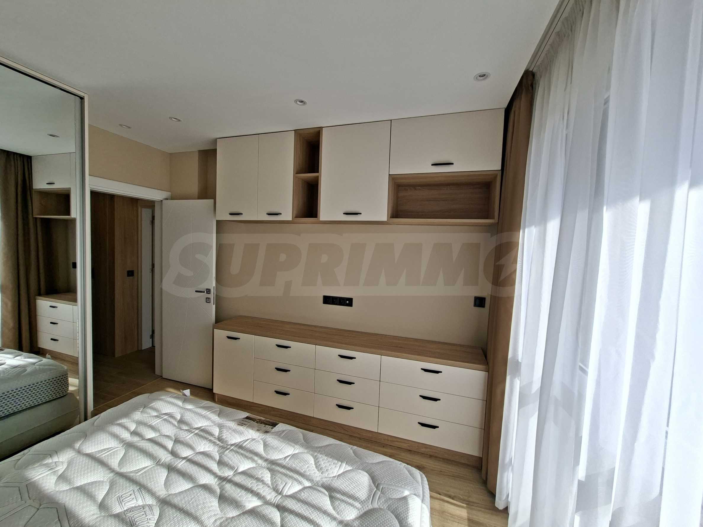 Интериорът е изпълнен по индивидуален проект, като всички мебели са изработени по поръчка, включително спалните. Подовете в целия апартамент са прецизно изравнени със саморазливна замазка, а в дневната е положен висок клас SPC паркет, гарантиращ комфорт, устойчивост и дълготрайност.