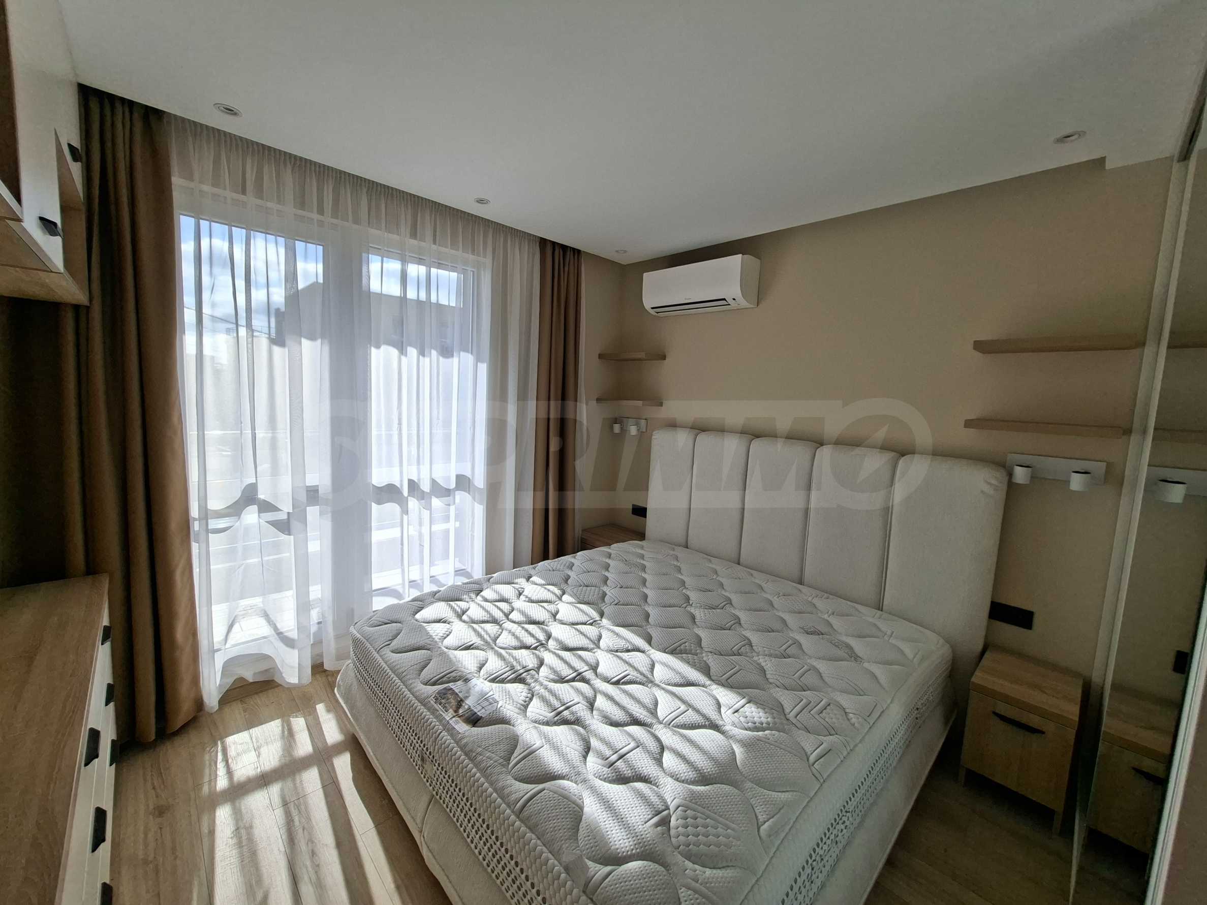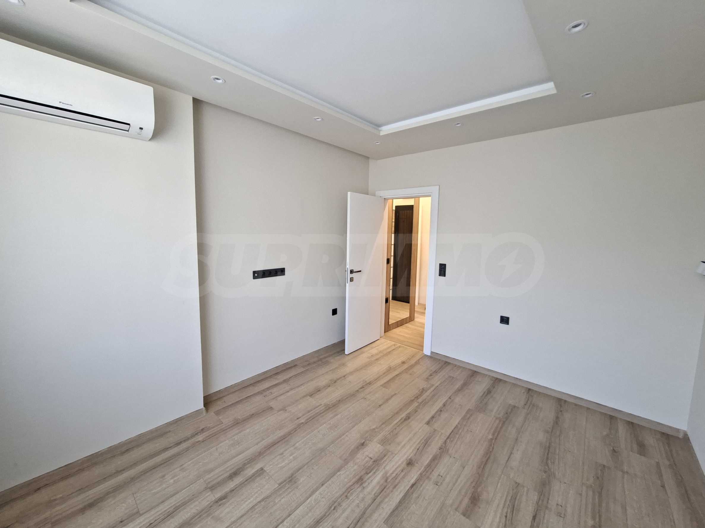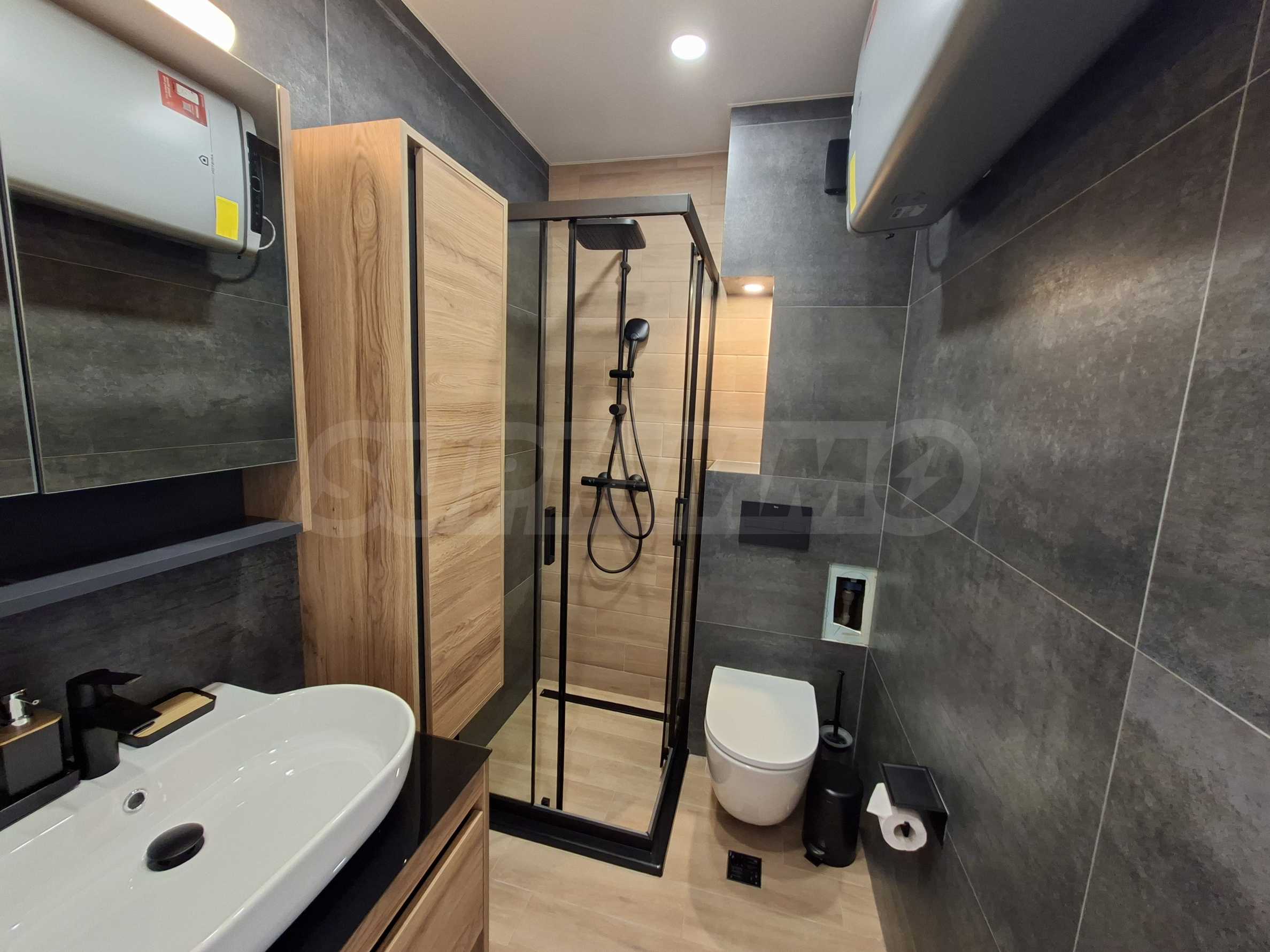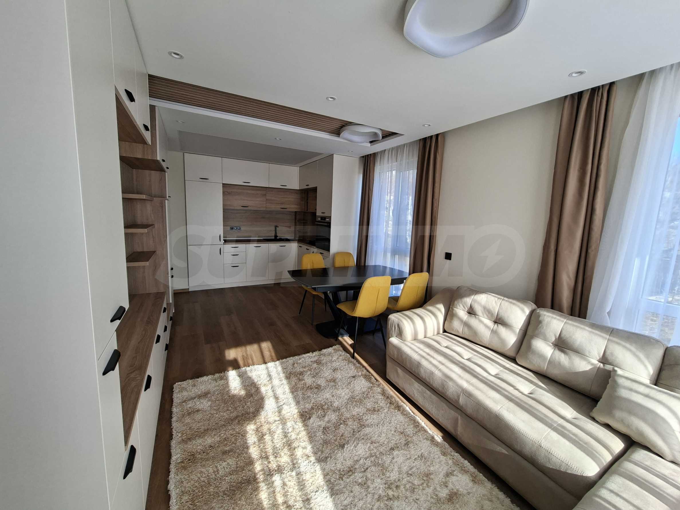 Интериорът е изпълнен по индивидуален проект, като всички мебели са изработени по поръчка, включително спалните. Подовете в целия апартамент са прецизно изравнени със саморазливна замазка, а в дневната е положен висок клас SPC паркет, гарантиращ комфорт, устойчивост и дълготрайност.