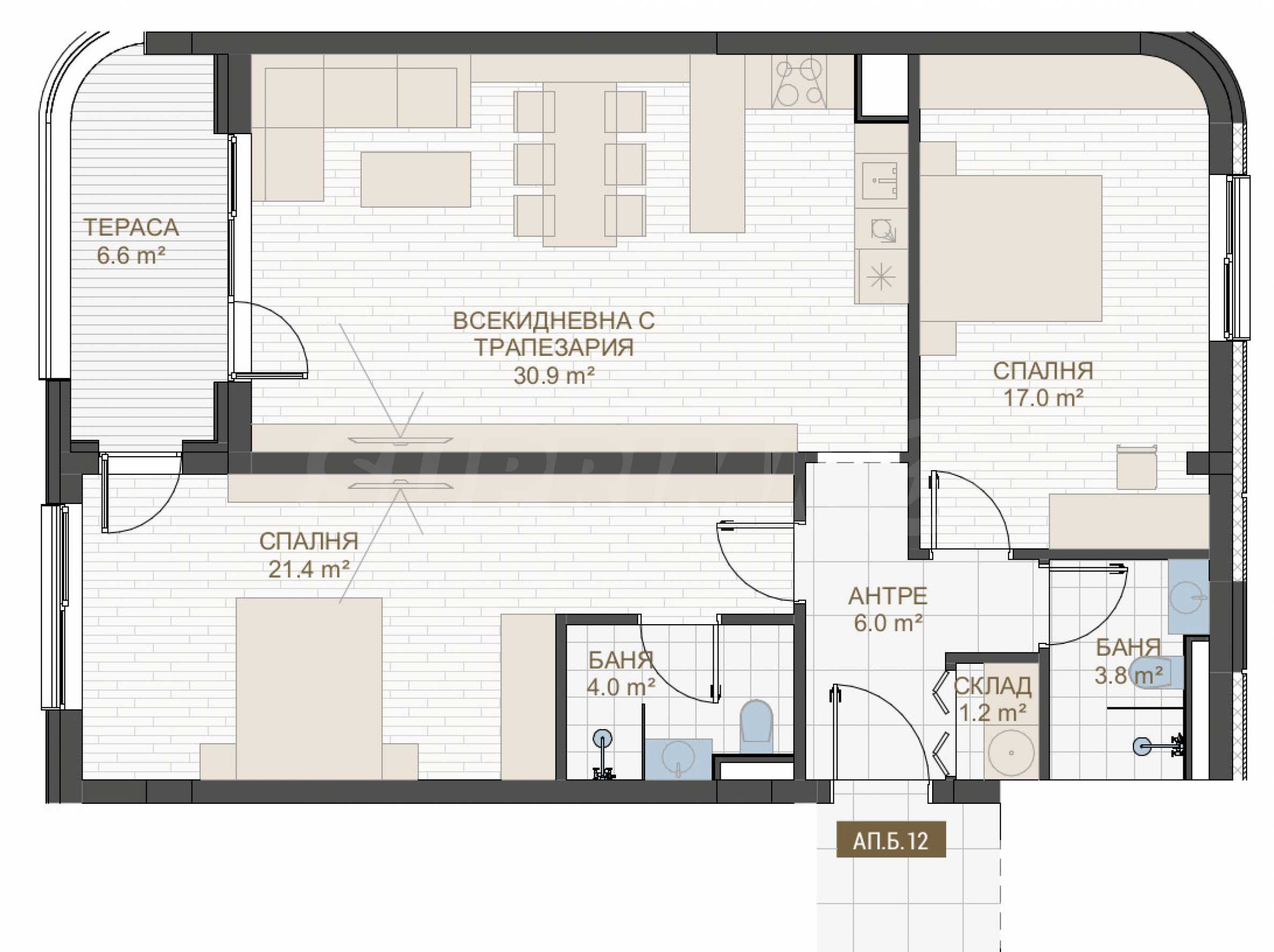 Жилището с обща площ от 128,65 кв.м е разположено на 4-ти етаж от 7.