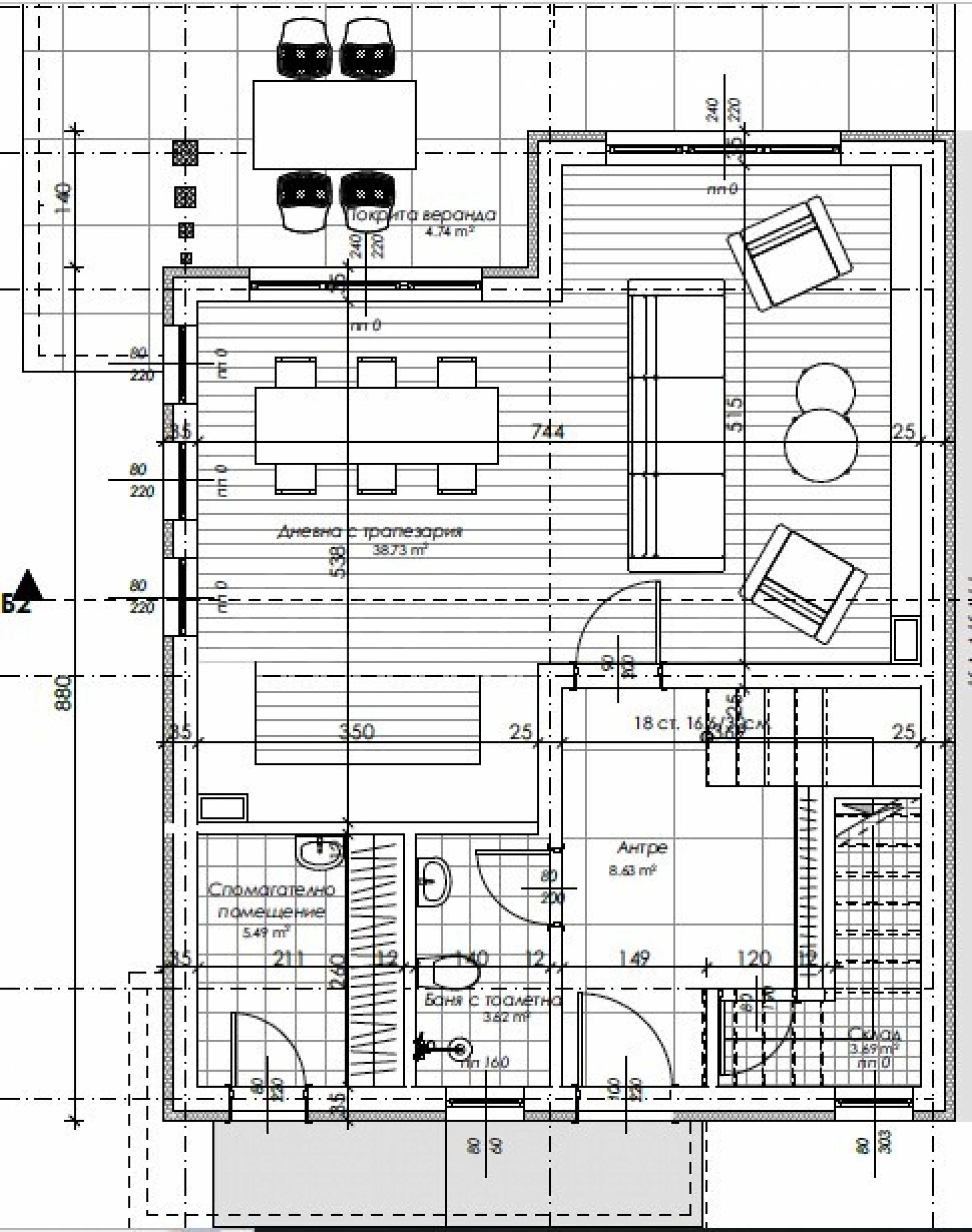 • първи етаж - състои се от всекидневна, трапезария и кухненски бокс, складово помещение/килер, баня с тоалетна, спомагателно помещение, антре и покрита веранда;