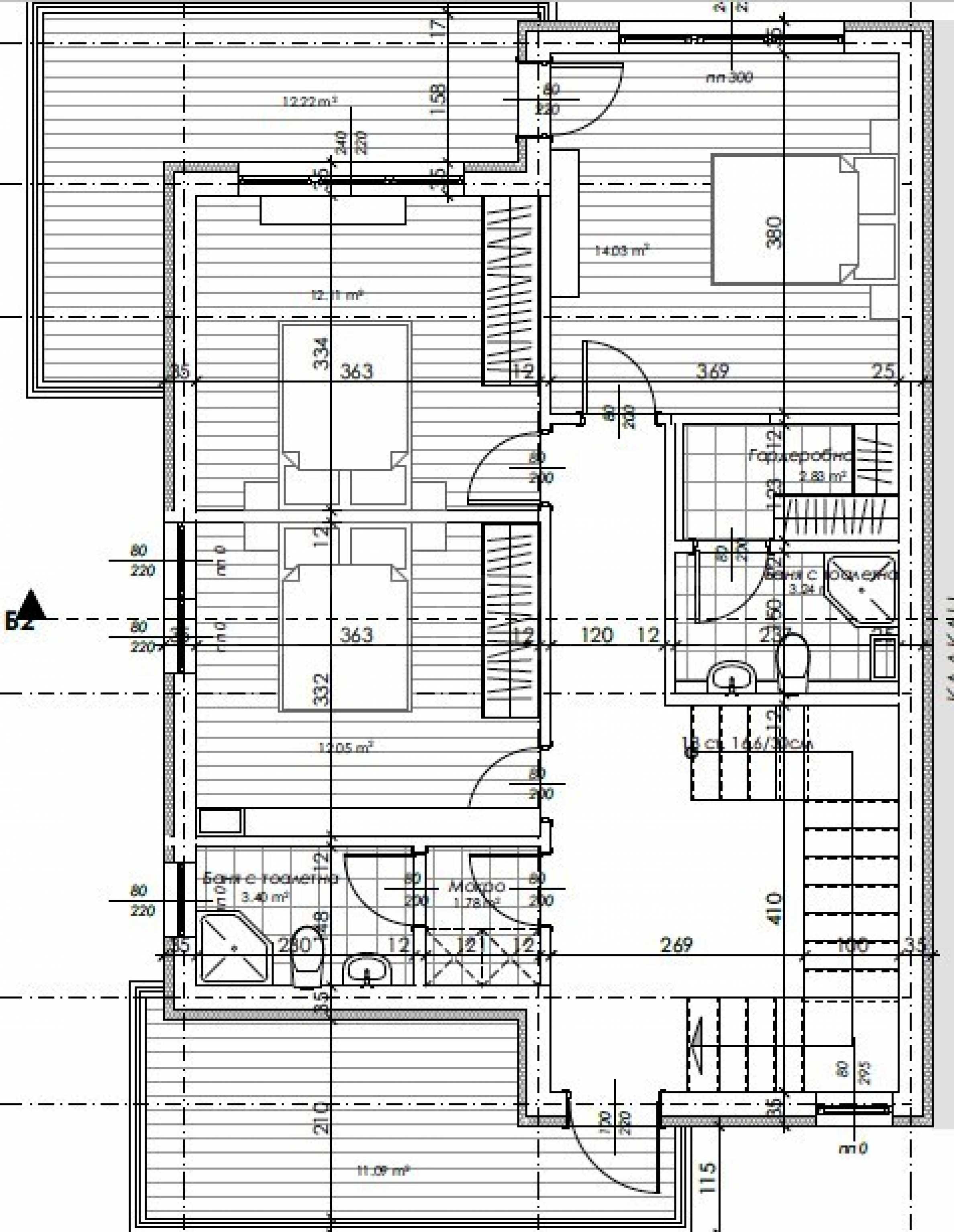 • втори етаж - впечатлява със своите три спални, две бани с тоалетни, гардеробна, коридор, мокро помещение и две просторни тераси.