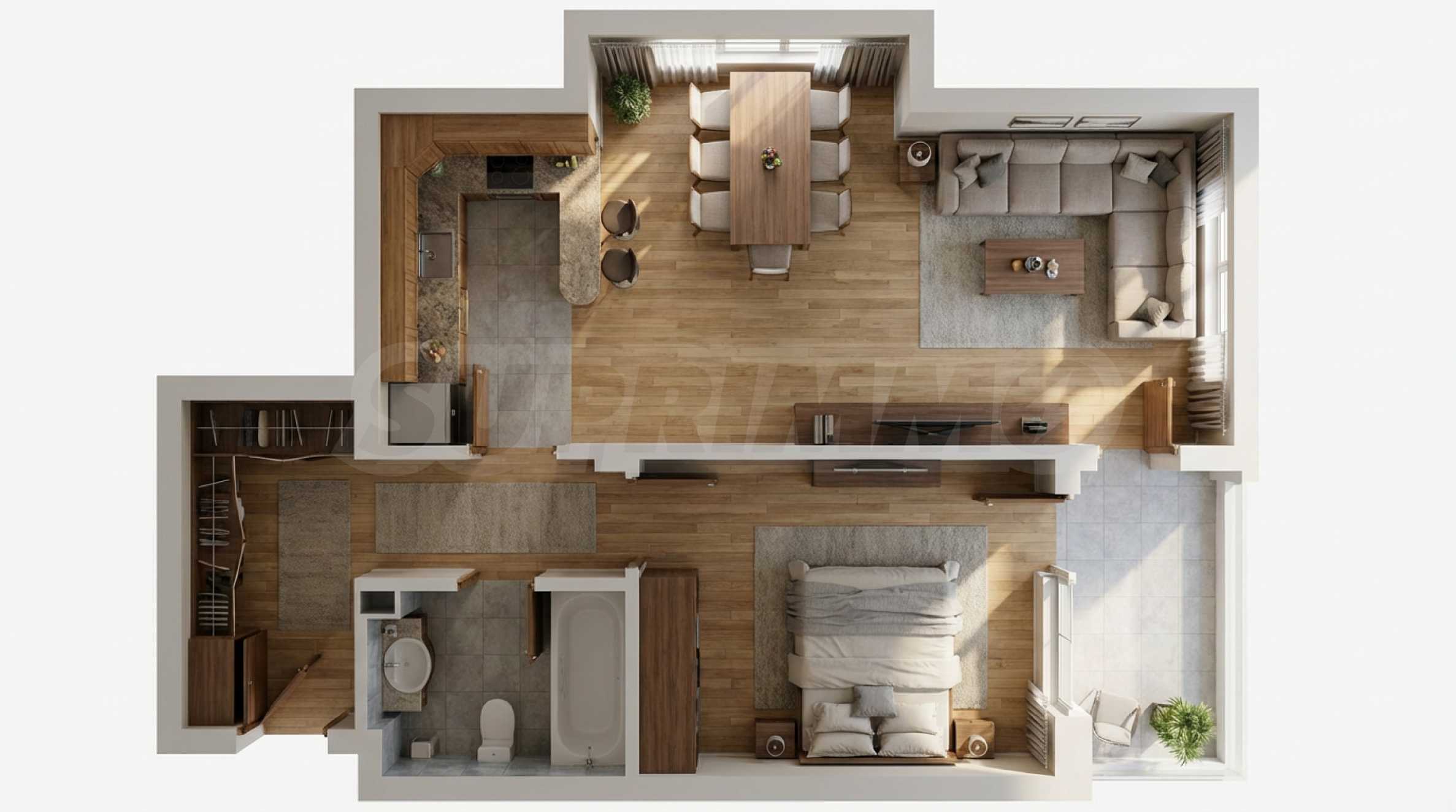 Комплексът ще бъде луксозно изпълнен, което гарантира Вашия релакс и спокойствие. Състои се от 4 жилищни сгради със 7 входа и ще има елегантен вътрешен двор с много зеленина, който ще се ползва само от живущите. На партерно ниво има търговски обекти и са осигурени подземни и външни паркоместа, които могат да се закупят допълнително. Апартаментите са просторни и с една или две спални, предоставяйки комфортно и модерно жилище за Вас и Вашето семейство.