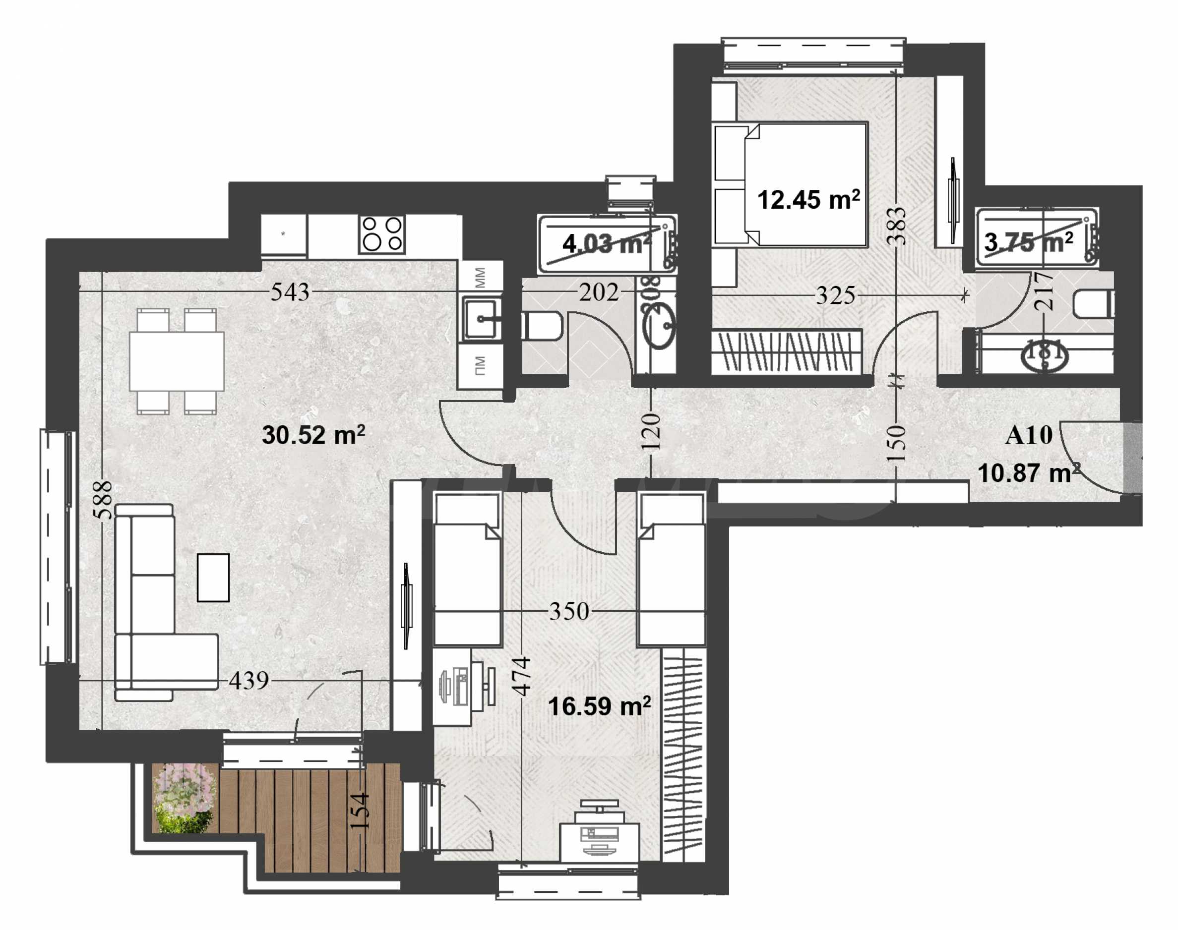 Апартаментът (ап. 10) е ситуиран на трети етаж с обща площ 121.84 кв.м и има следното разпределение: