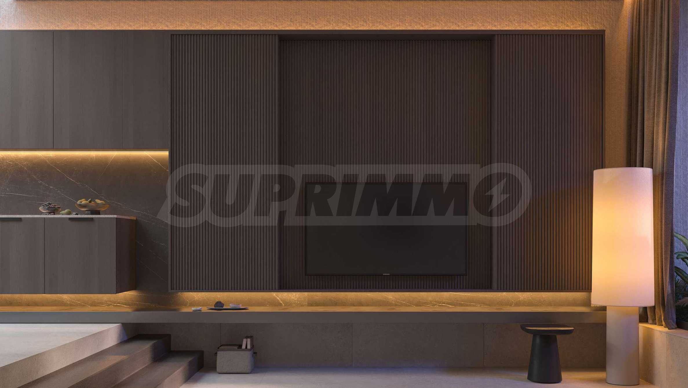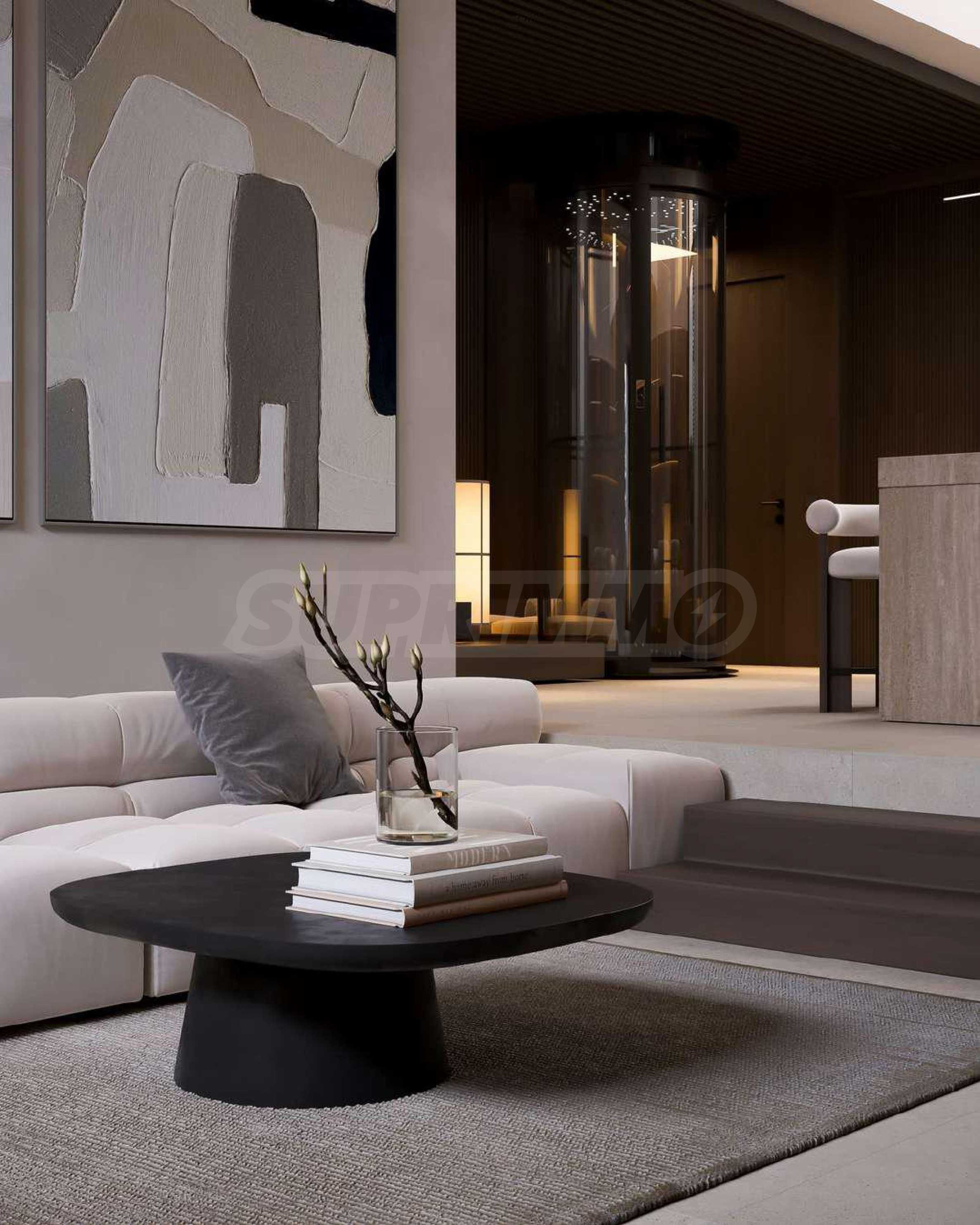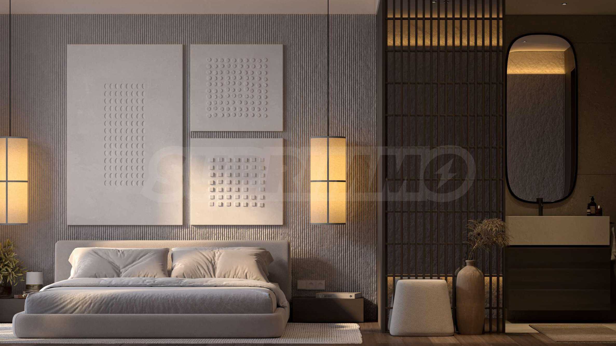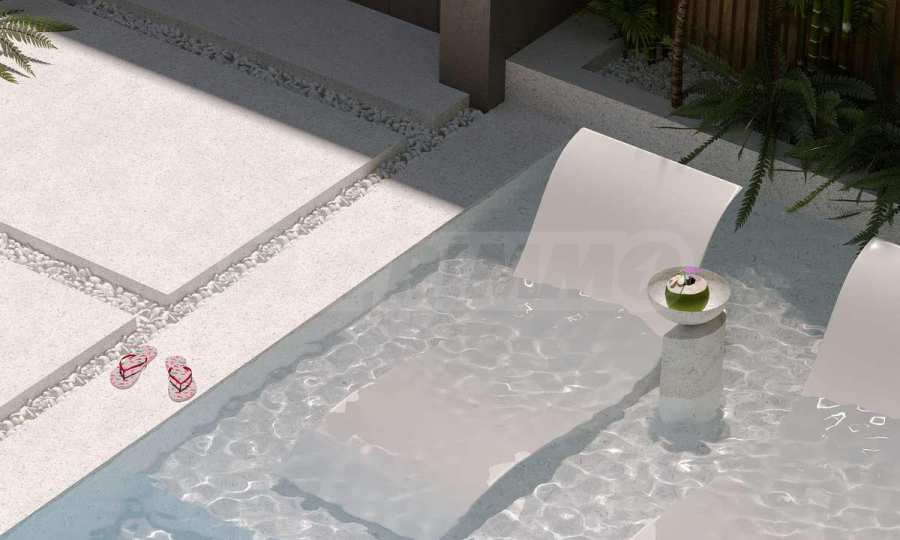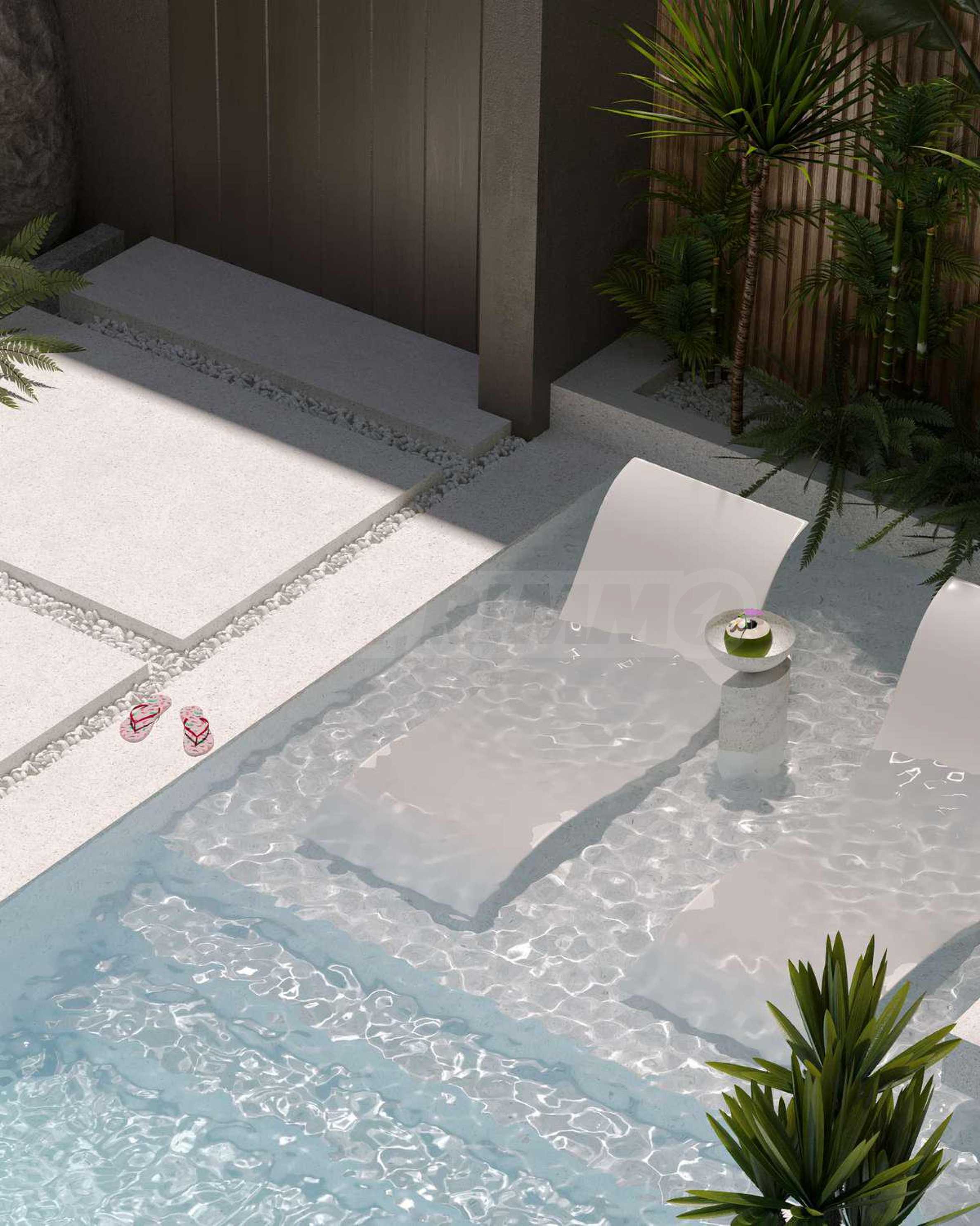 Всички резиденции в комплекса се предлагат напълно обзаведени и завършени до ключ, като всеки елемент – от настилките до финалните декоративни акценти – е подбран с внимание към детайла. Използвани са висококачествени материали като гранит, естествено дърво и терацо, а стените са фино обработени и допълнени с декоративни вложки от дърво и камък, които подчертават модерната естетика.