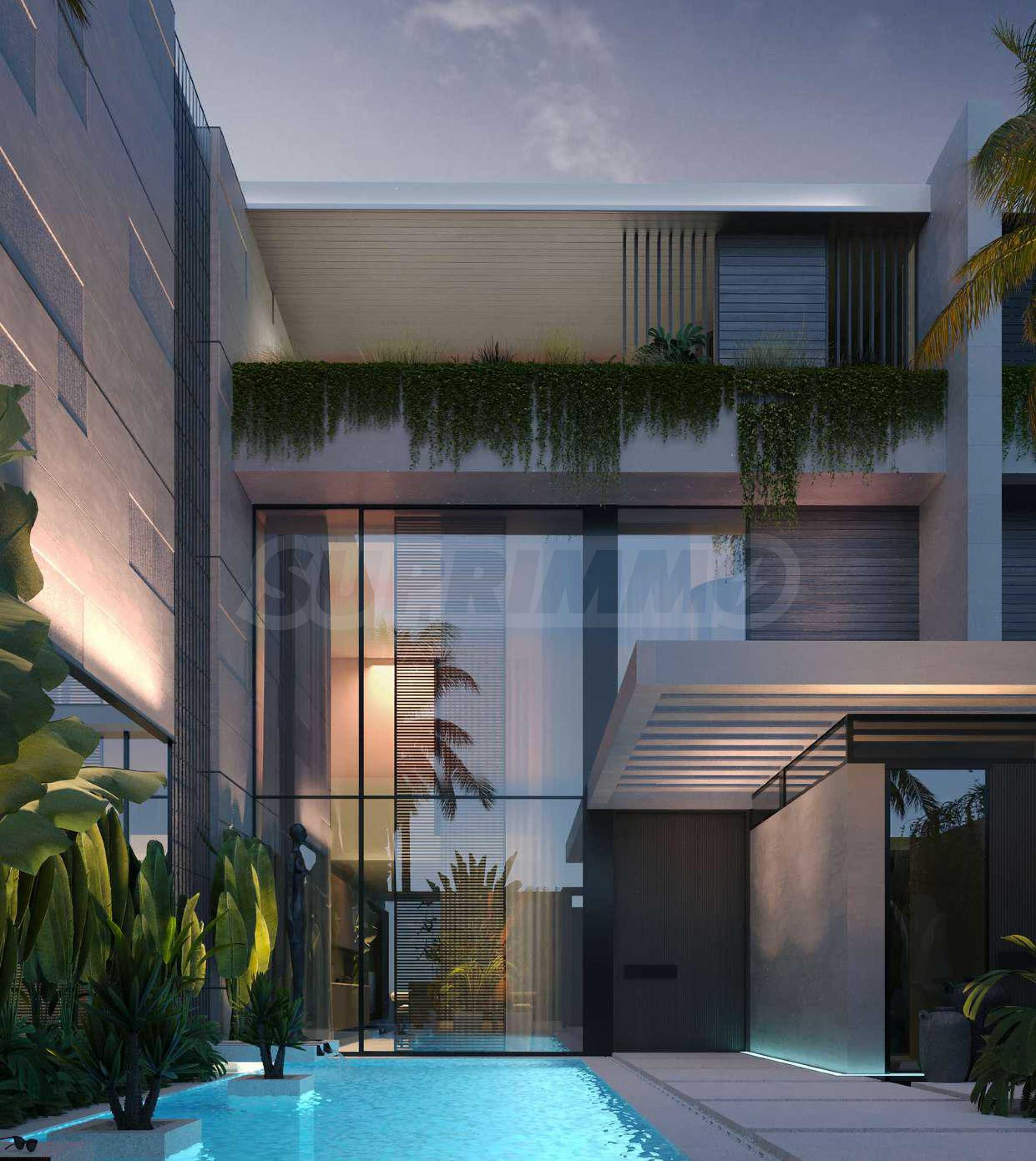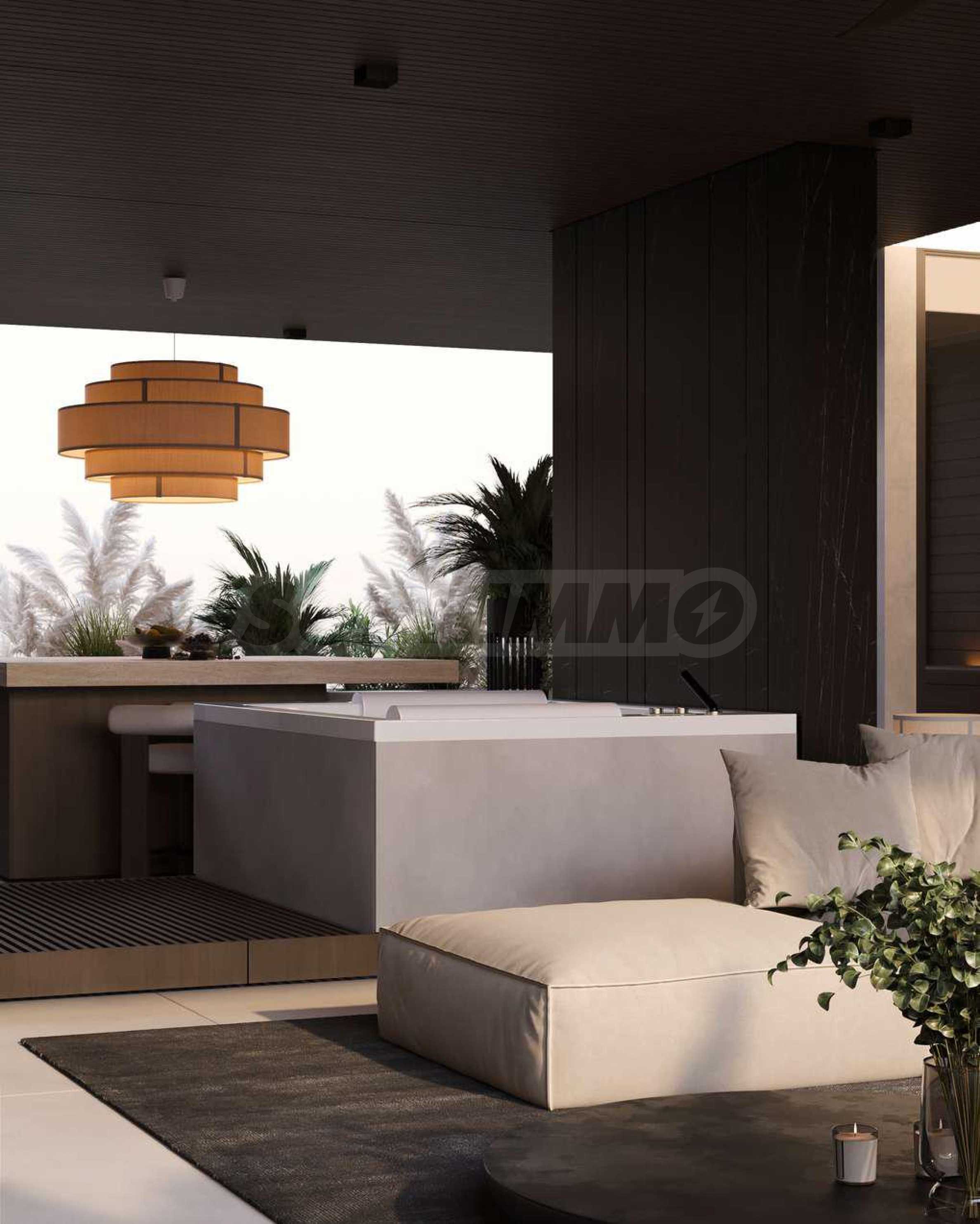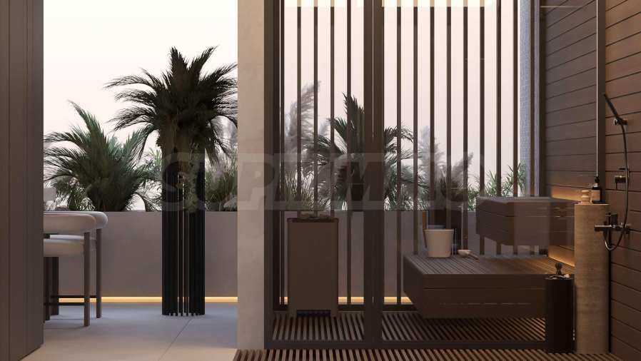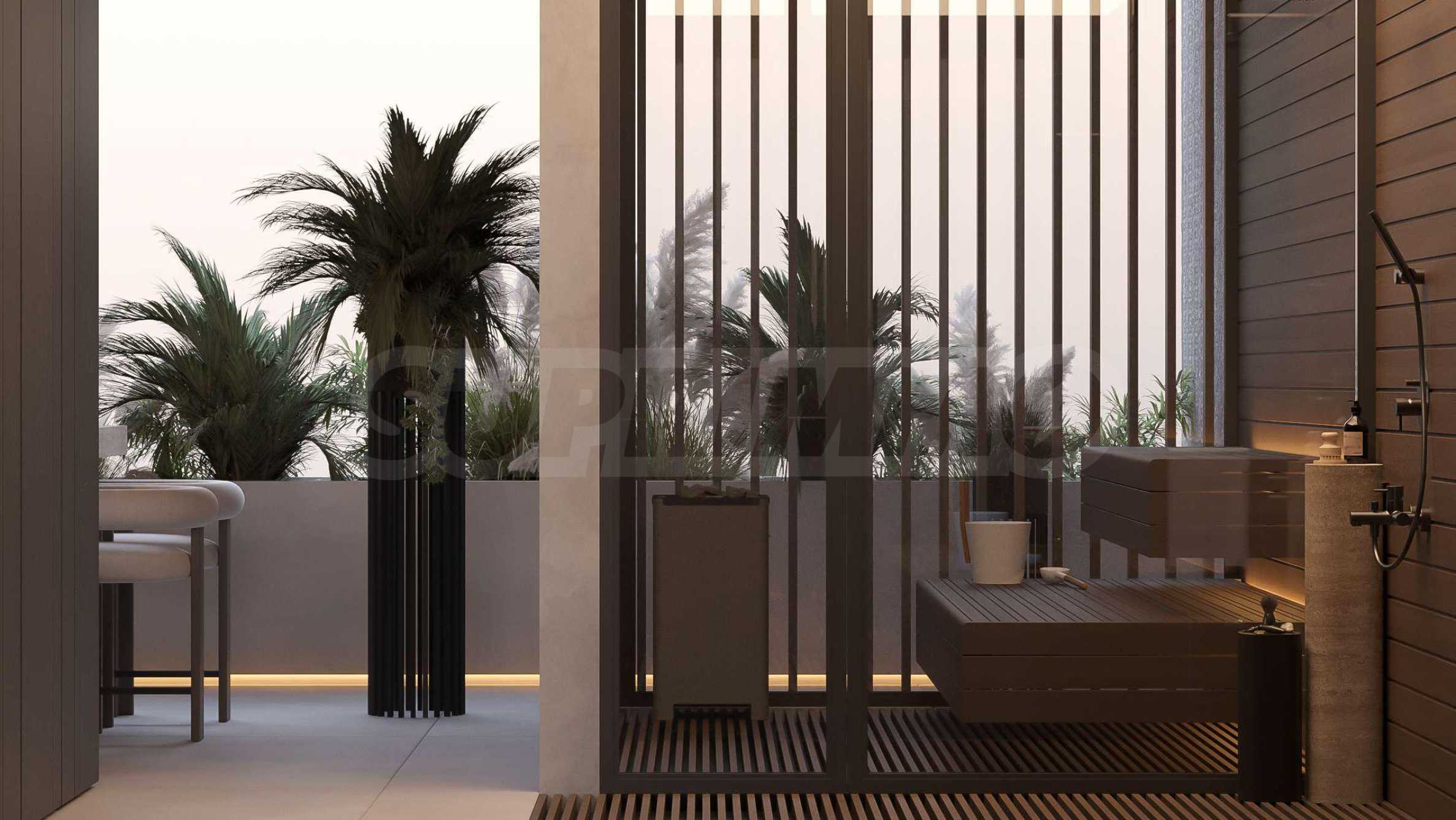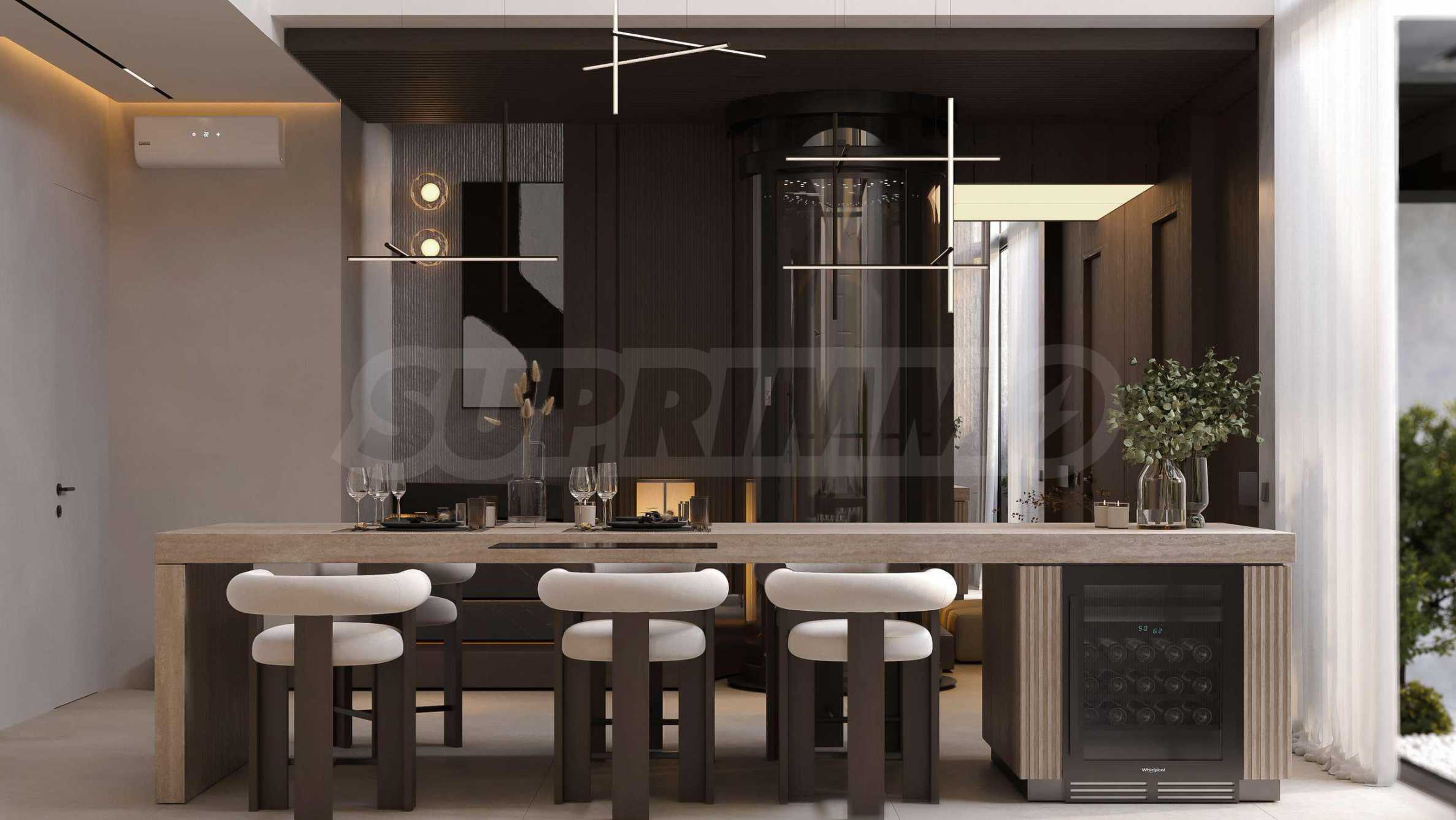 Вилите са на три нива и предлагат ясно разграничение между социалните и личните пространства. На първия етаж е разположена просторна дневна с кухня и трапезария в отворен план, която плавно преминава към слънчева веранда със собствен басейн и елегантна релакс зона с шезлонги. Второто ниво включва две комфортни спални със самостоятелни бани, осигуряващи пълно уединение. На третия етаж се намира третата спалня, както и впечатляваща покривна тераса с мека мебел и джакузи – пространство, създадено за вечерен отдих и споделени моменти под открито небе. Една от наличните вили разполага и със собствен асансьор – детайл от висок клас, който добавя както удобство, така и допълнителна стойност към имота.