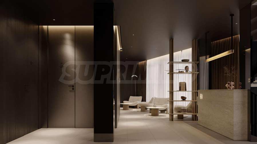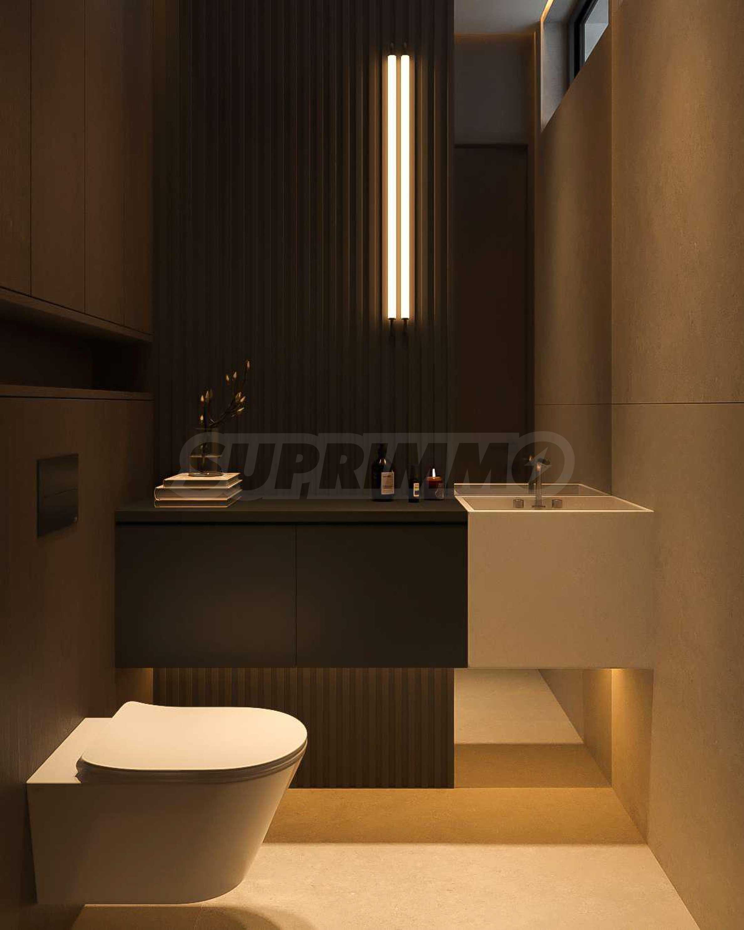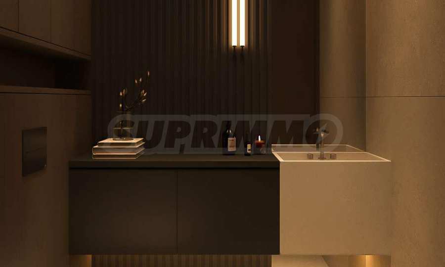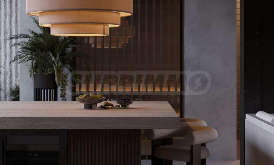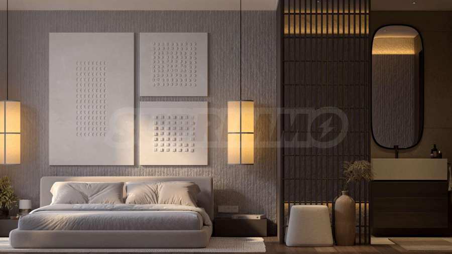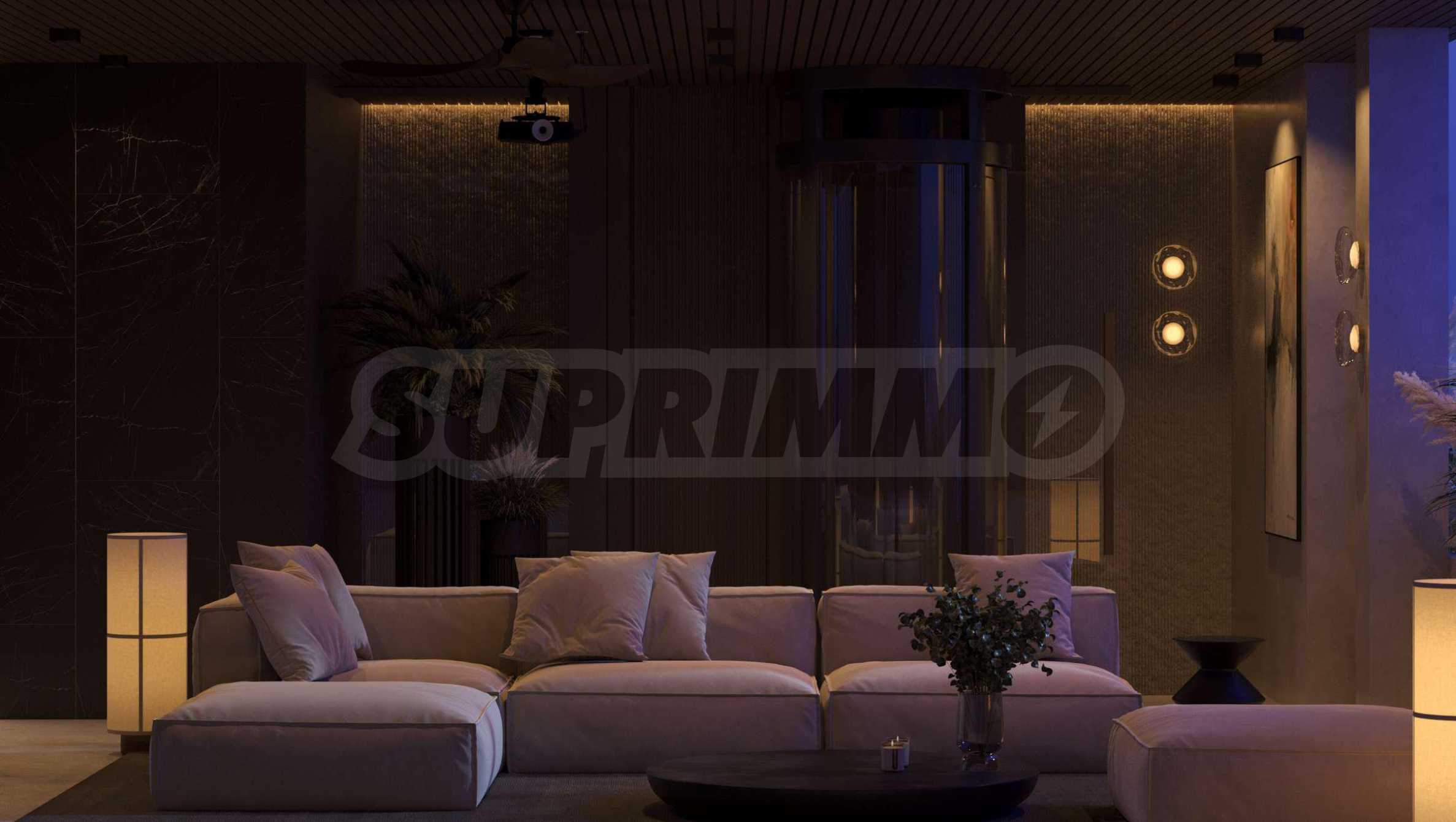 Осветлението е внимателно проектирано с различни светлинни сценарии и меко нощно осветление в топли тонове, което създава интимна и уютна атмосфера. За климатизацията е избрана системата на Daikin – световно утвърден бранд, гарантиращ енергийна ефективност и безкомпромисен комфорт през цялата година.