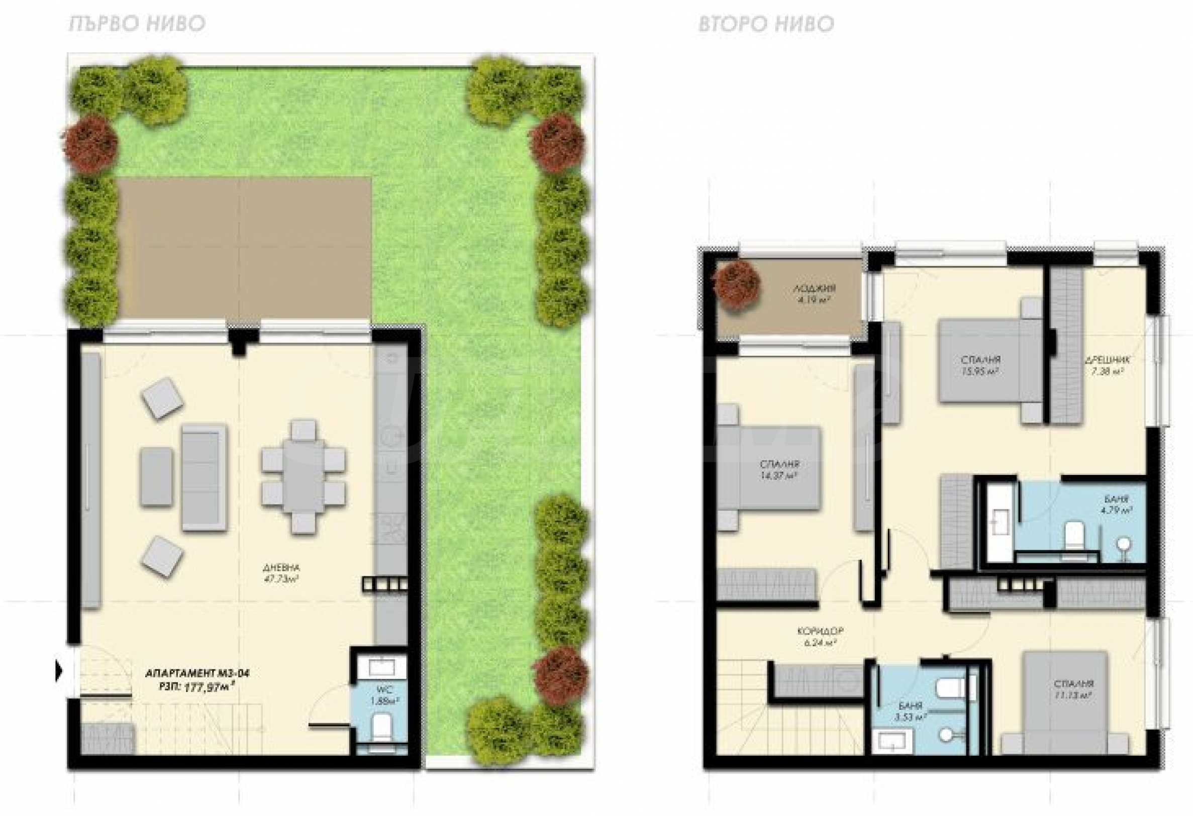 Мезонетът е на две нива, разположен в сграда 2, секция А, с обща площ 177.97 кв.м. (нетна площ 146.60 кв.м. + общи части 31.37 кв.м.), с двор с площ 162.17 кв.м.