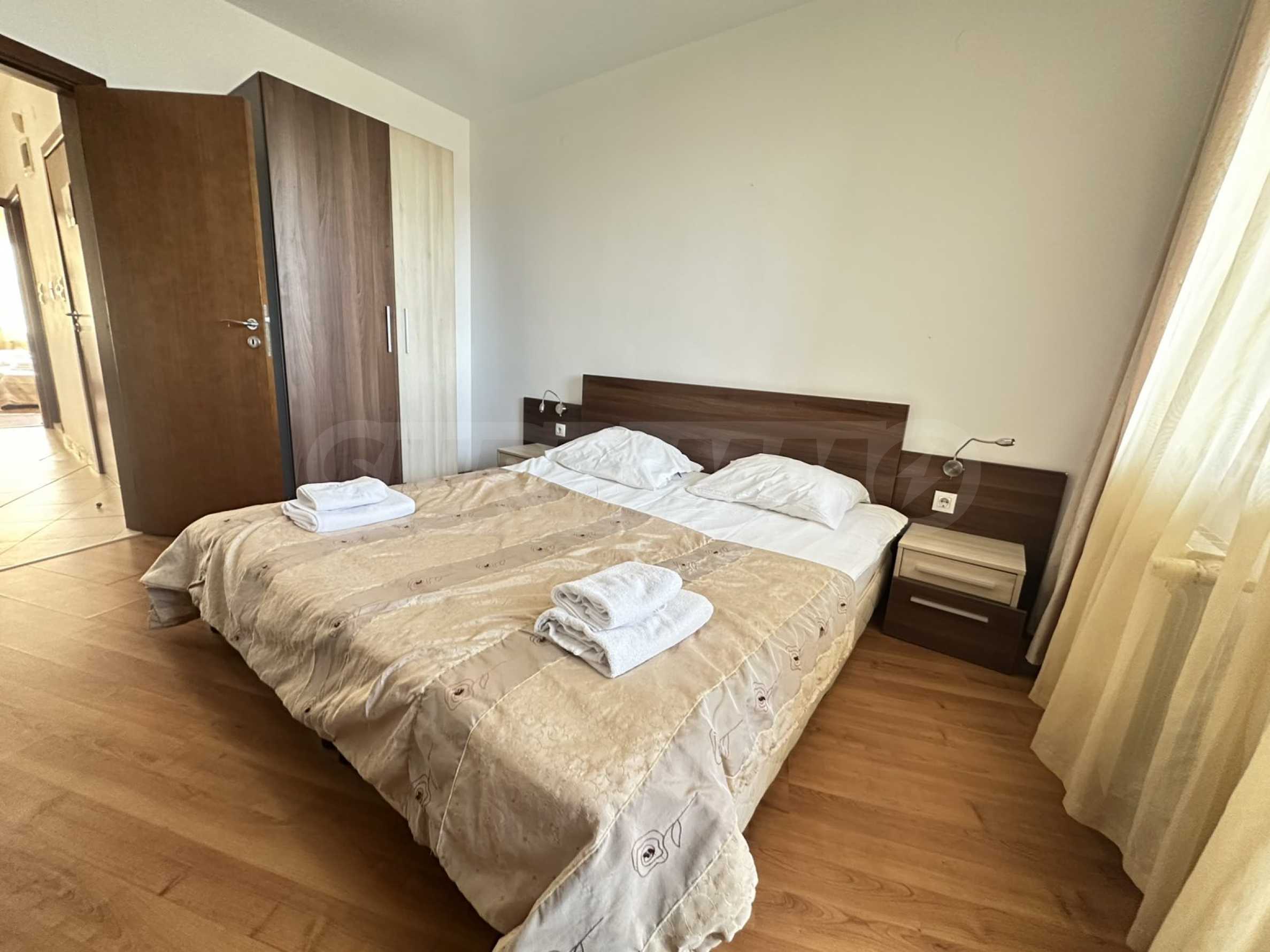 • Първата спалня е обзаведена с две единични легла, нощни шкафчета, гардероб, телевизор и балкон;