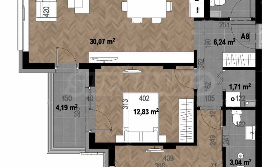 • две самостоятелни спални - 12,83 кв.м. и 13,35 кв.м.