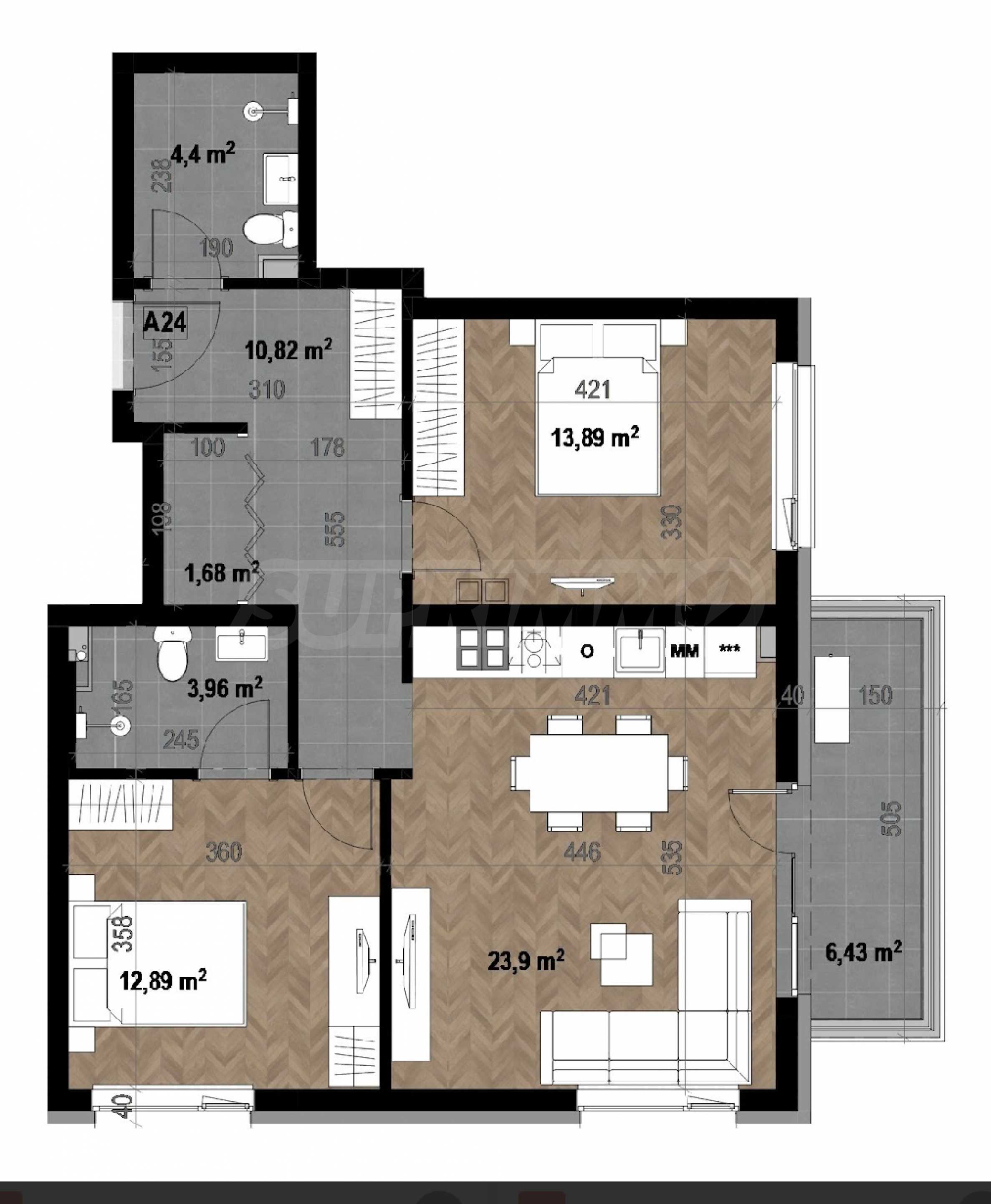 Жилищната площ е 92.77 кв.м, общите части са 13.56 кв.м, и има следното разпределение:
