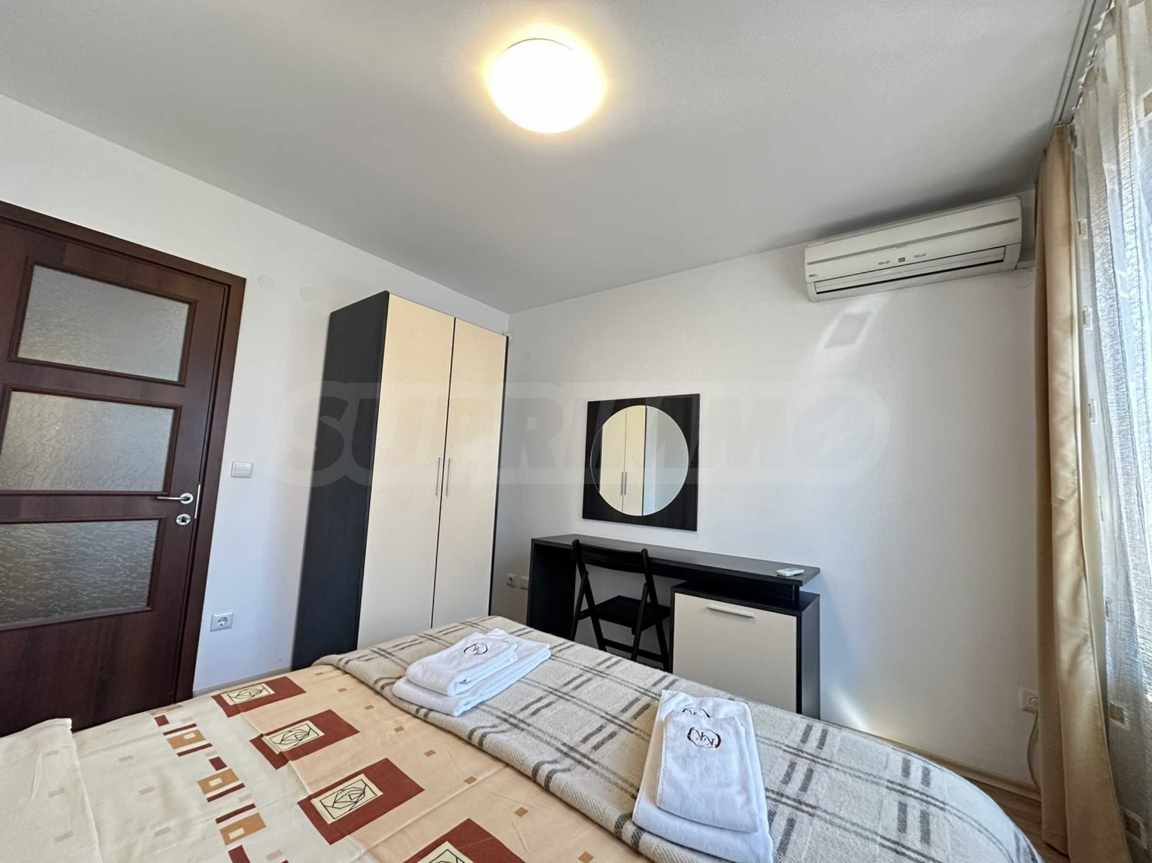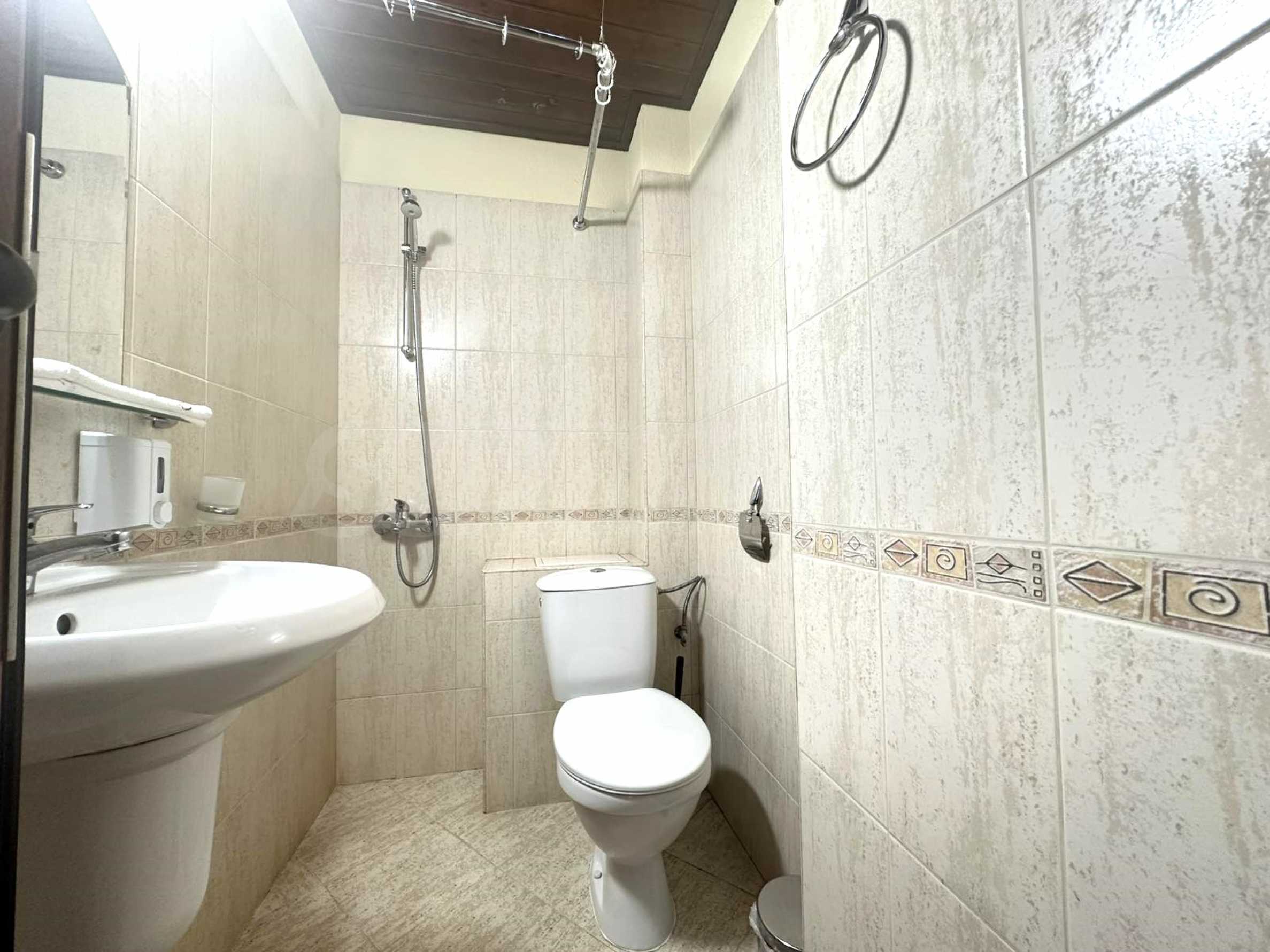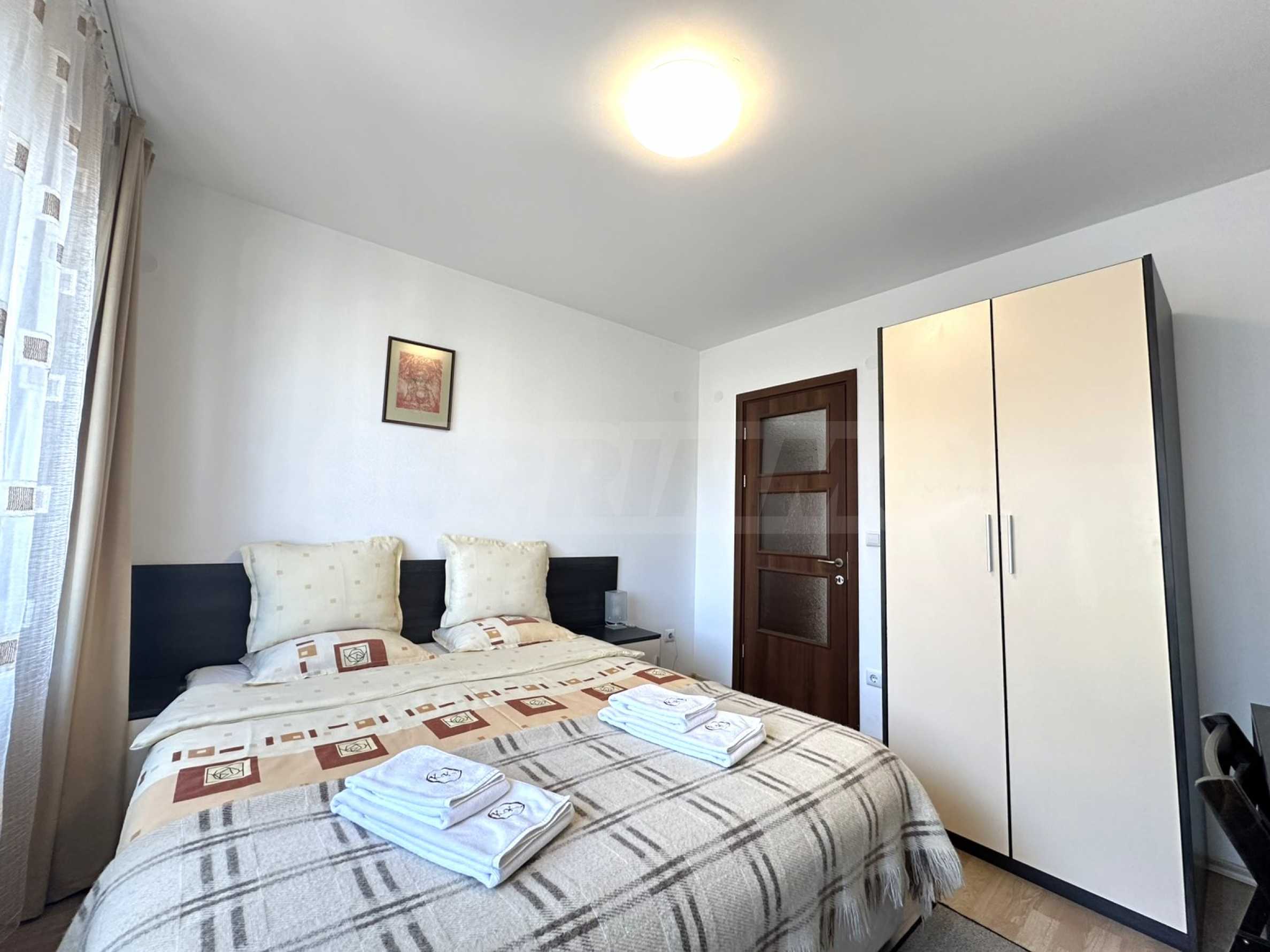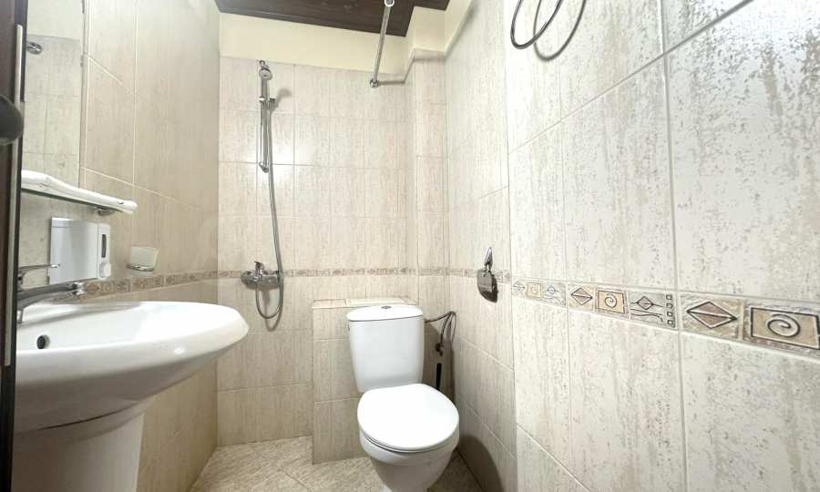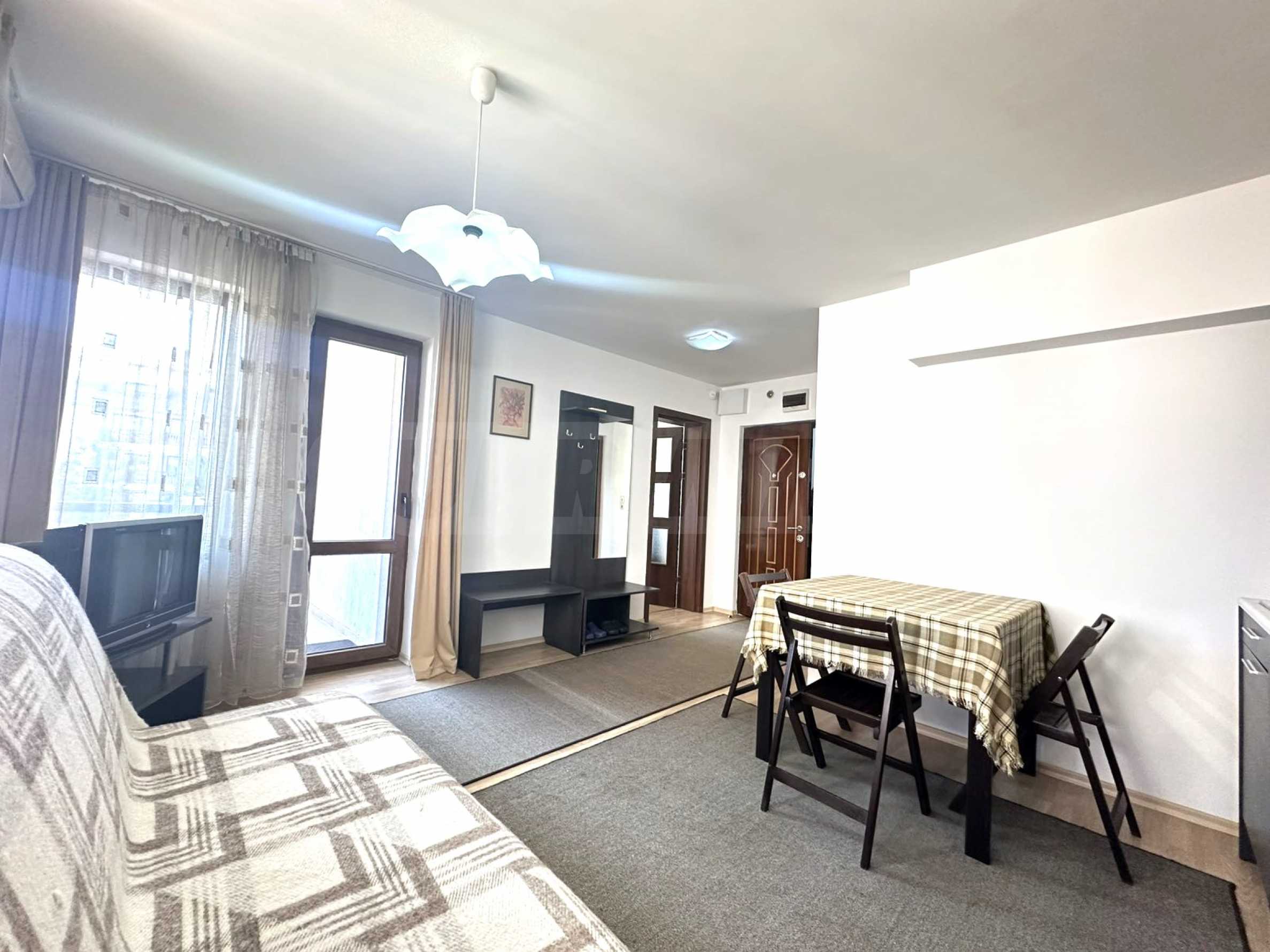 Жилището е разпределено между: коридор, кухненски бокс, хол с диван, маса хранене, телевизор, балкон, голяма спалня с гардероб, баня с душ и тоалетна.