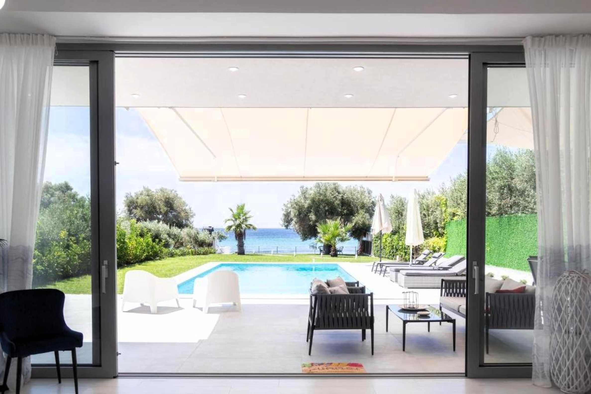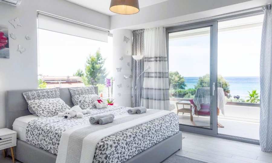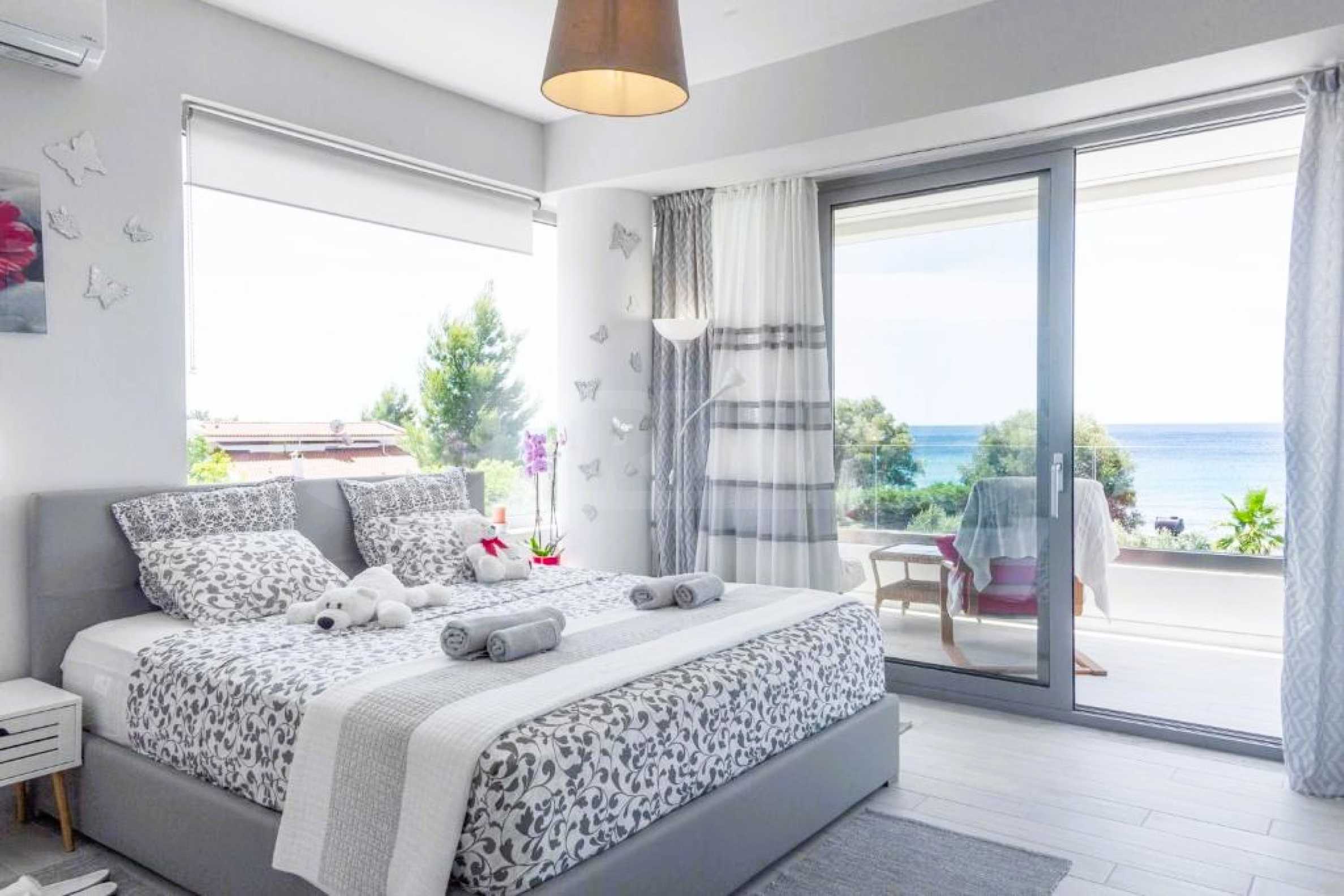 Гледка, която спира дъха: Тук морето не е просто „наблизо“ – то е част от интериора благодарение на огромните френски прозорци.