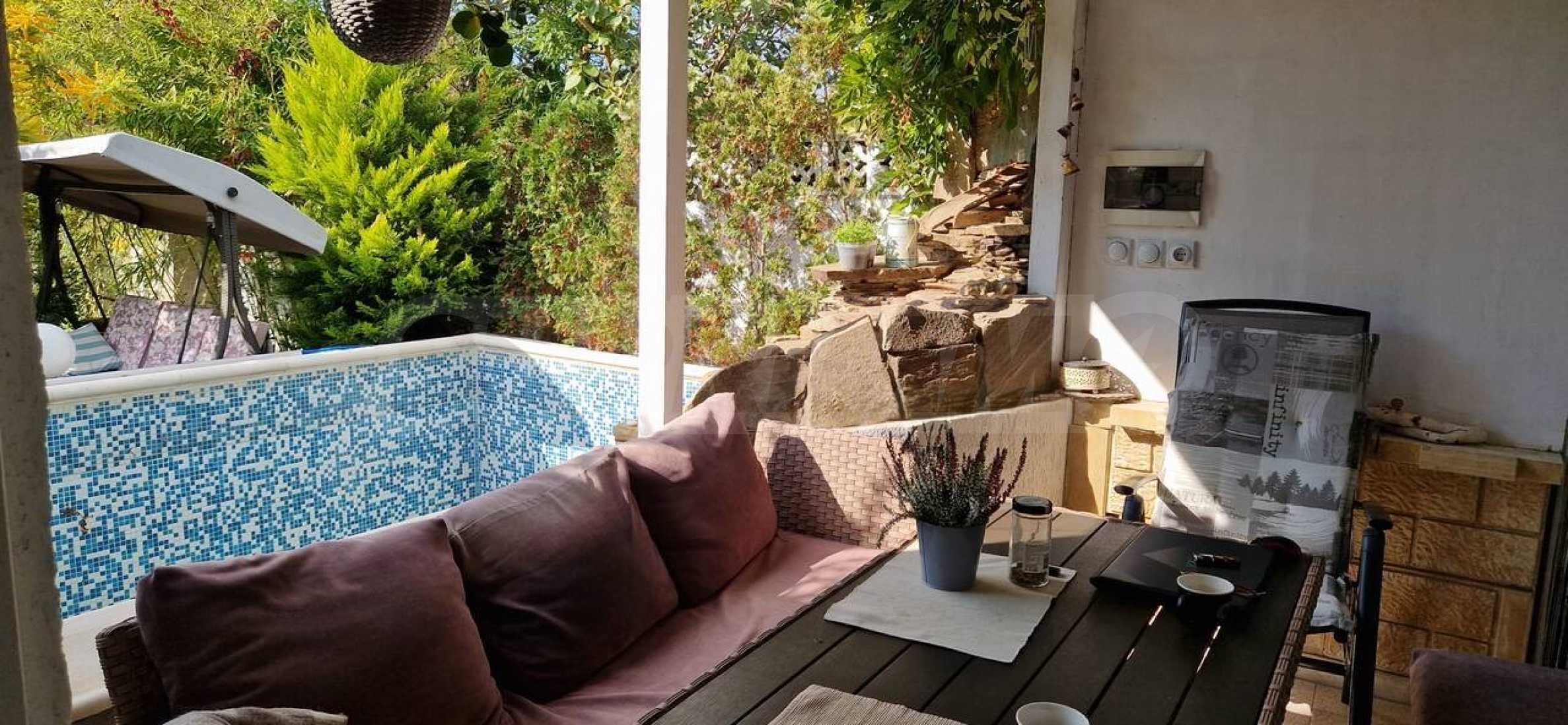 Имотът е с кокетна визия, поддържан, изграден от качествени материали, бетон и камък.