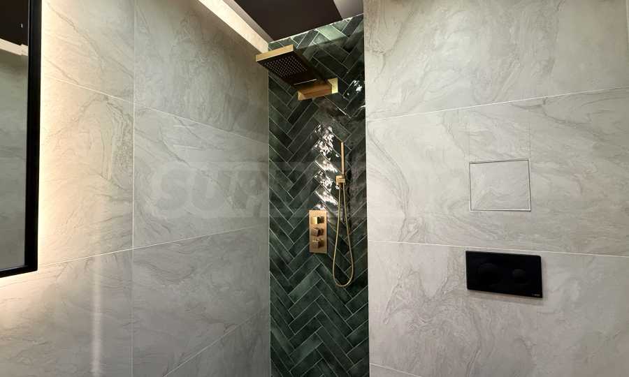 Апартаментът се намира в нова сграда с Акт 16 от 2024 г. Предлага се завършен със следните материали: